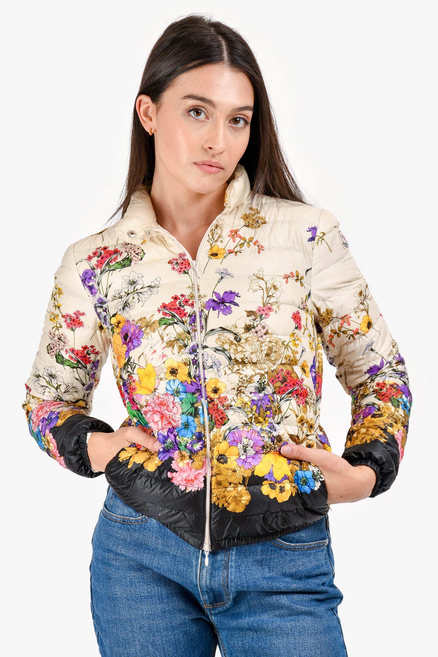 Moncler Cream Floral Thin Zip-Up Puff Jacket Size 0
