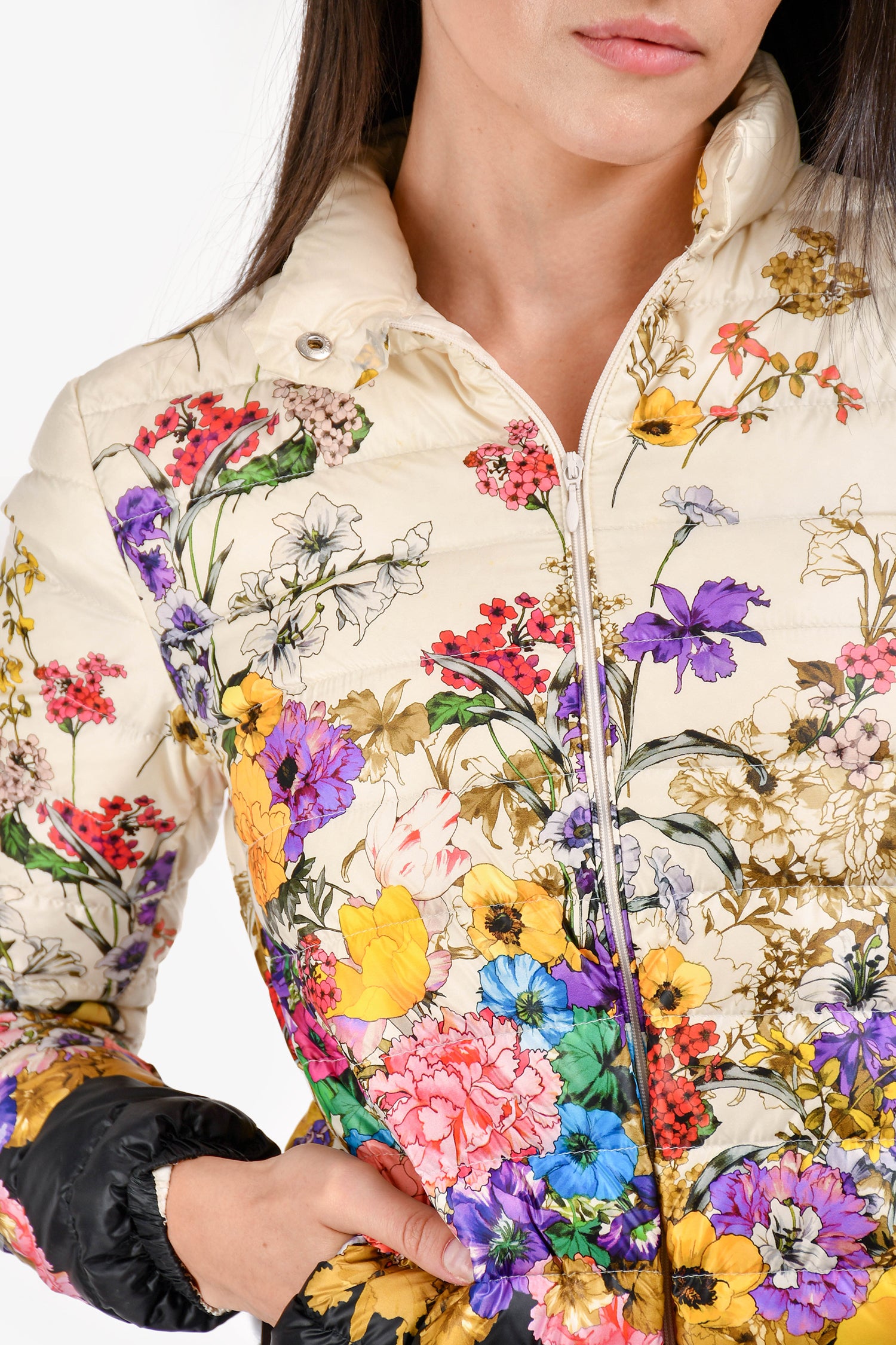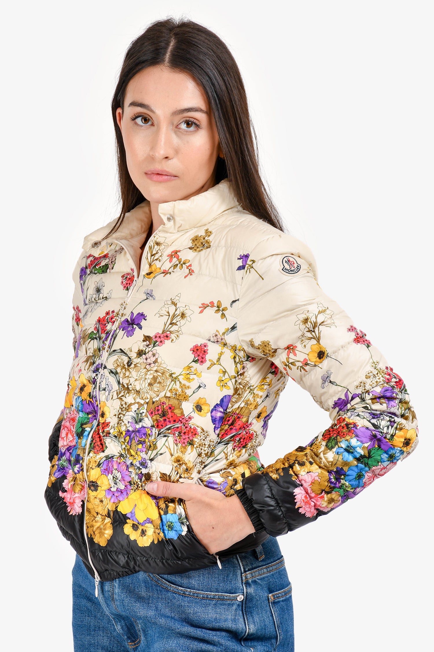 Refresh availabilityMoncler Cream Floral Thin Zip-Up Puff Jacket. Front zip and top snap button closure. Side zip pockets. Stand collar. Tonal stitching.