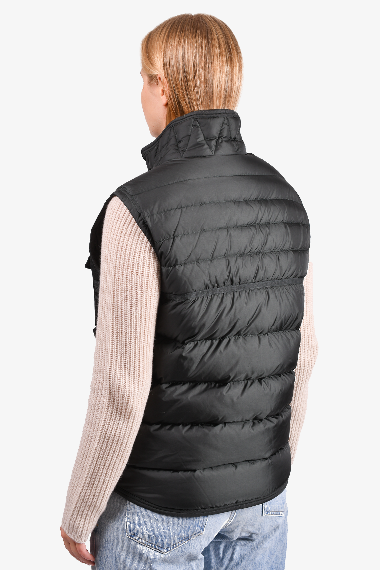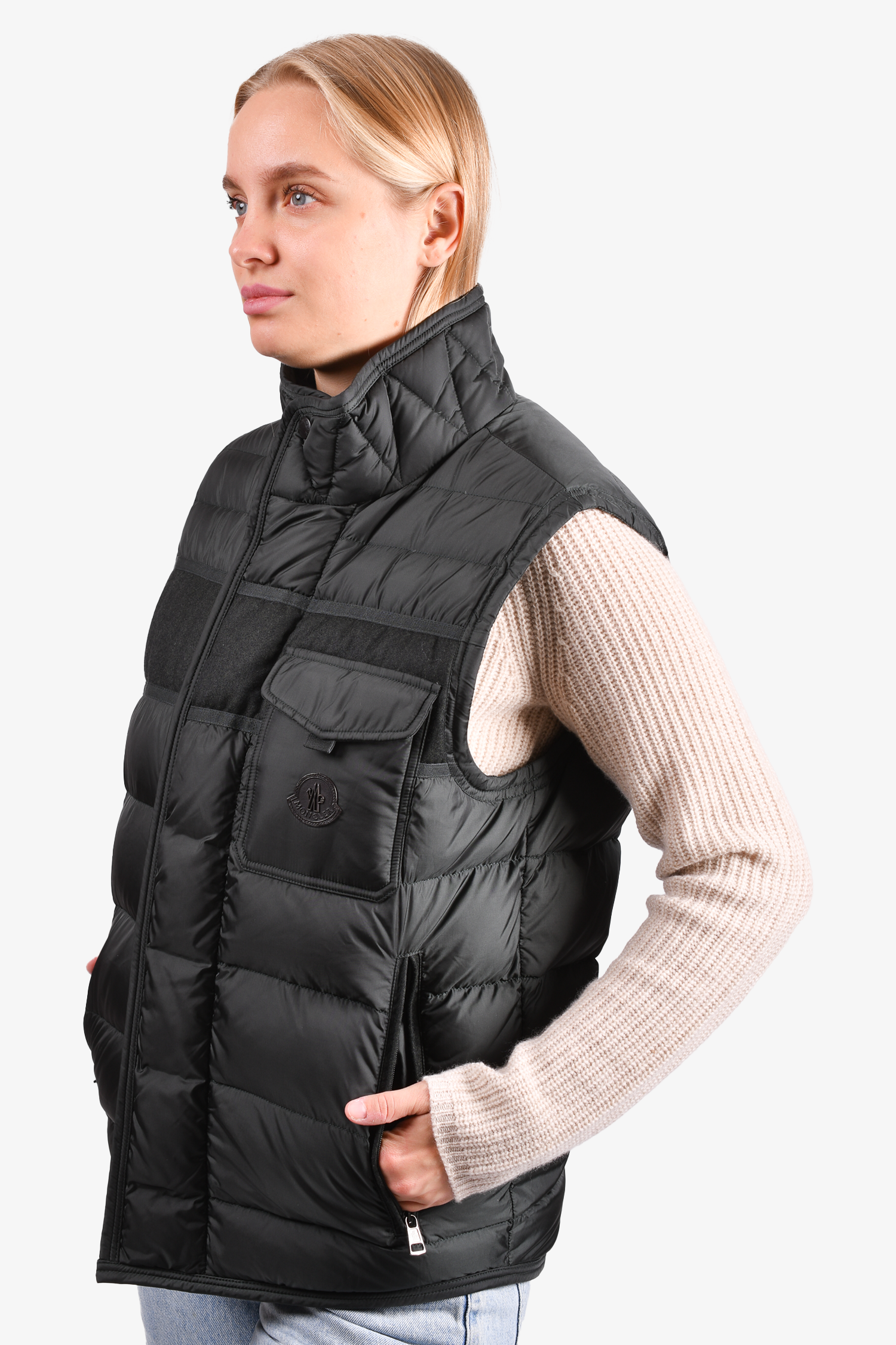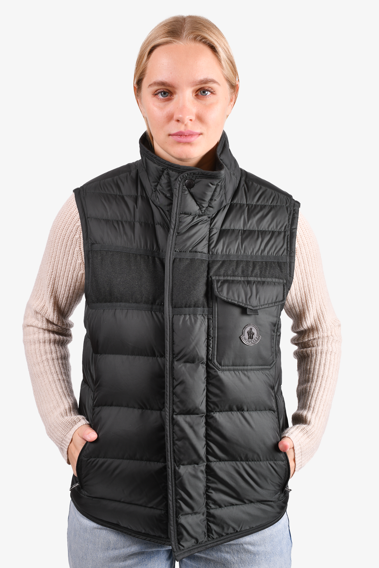 Refresh availabilityMoncler Dark Green Down/Wool Sleeveless Vest. Front two-way zip and single snap button closure. Front zip pockets. Brand logo patch at the front. Lined. Tonal stitching.