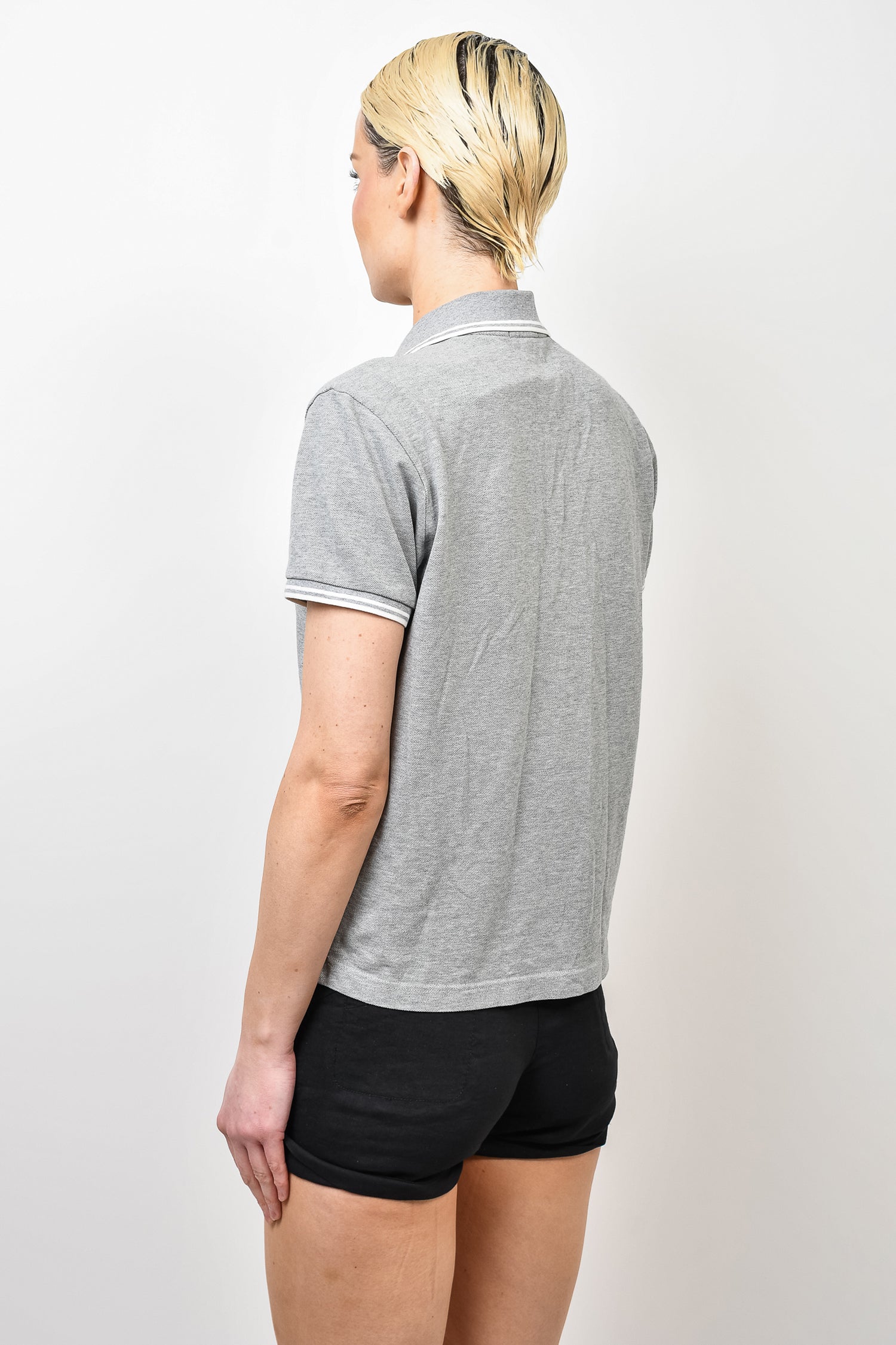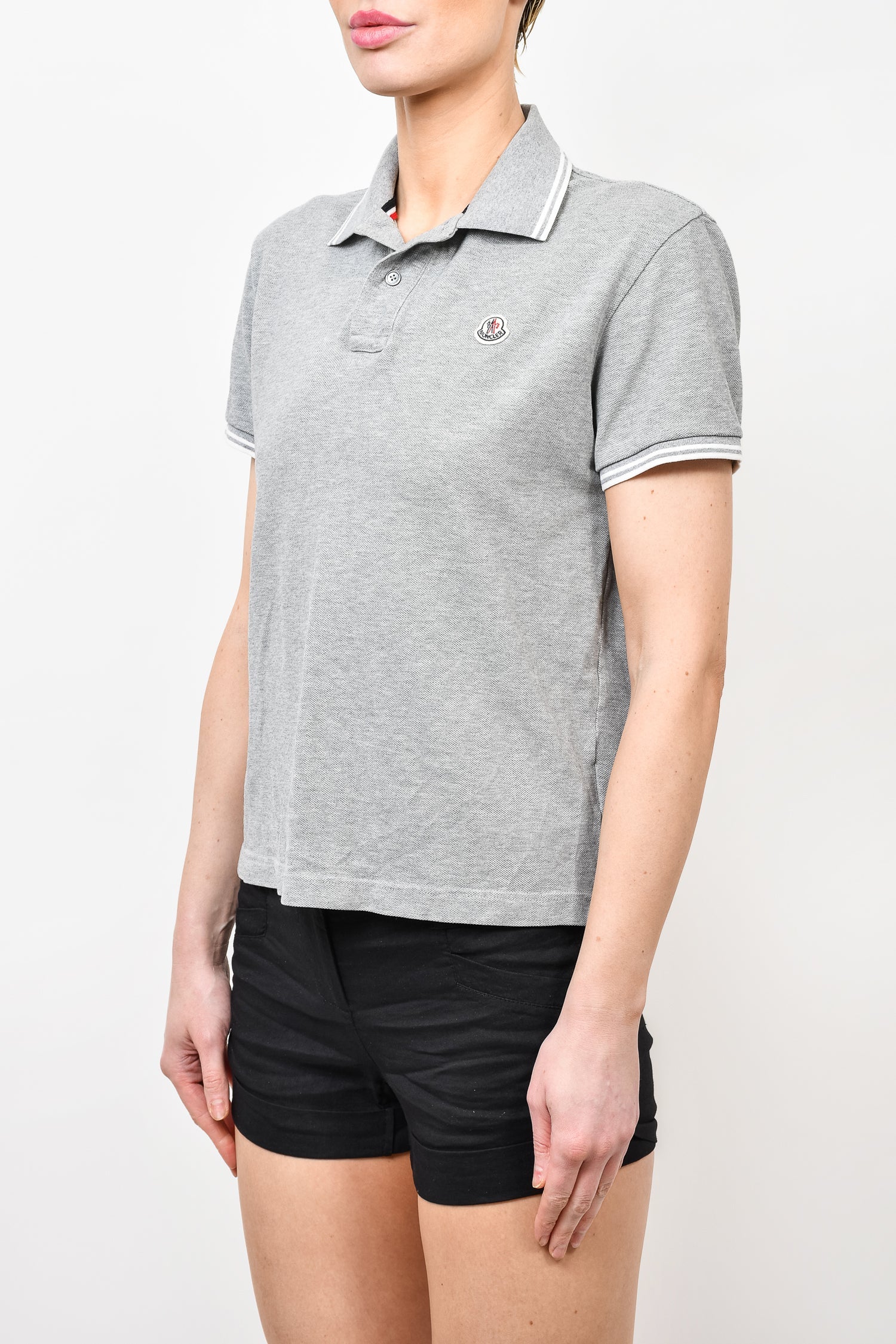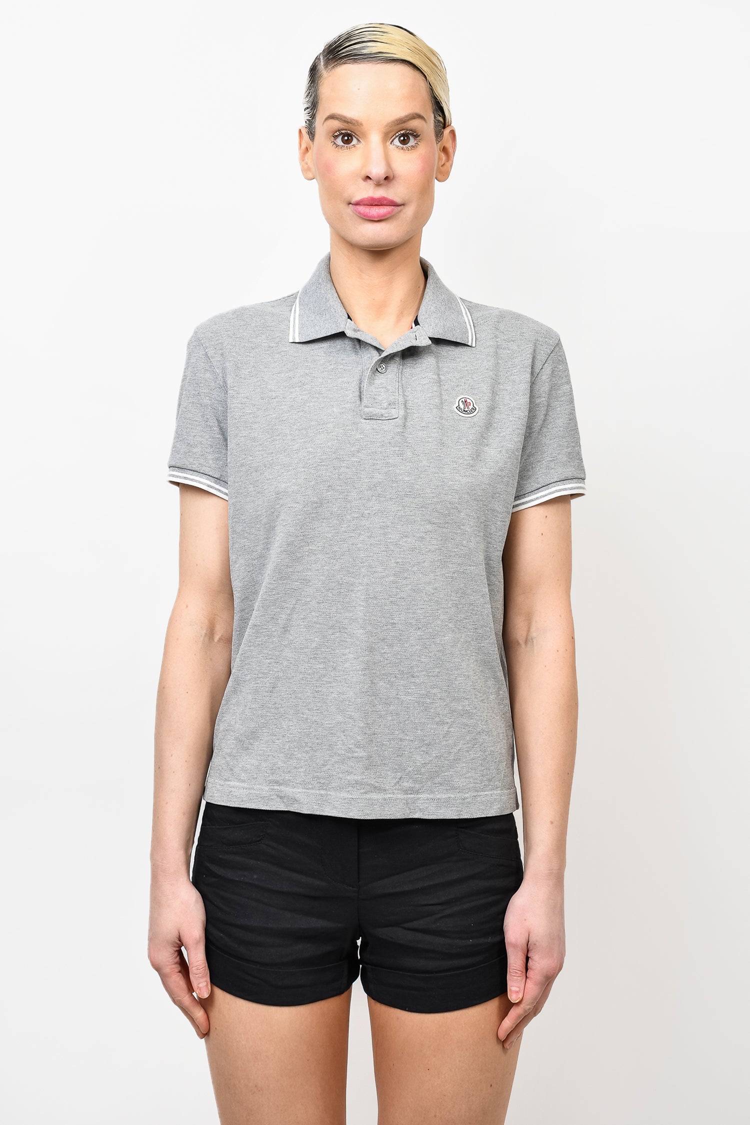 Refresh availabilityMoncler Grey Short Sleeve Polo Shirt. Pullover. Pointed collar with button closure. Tonal stitching.