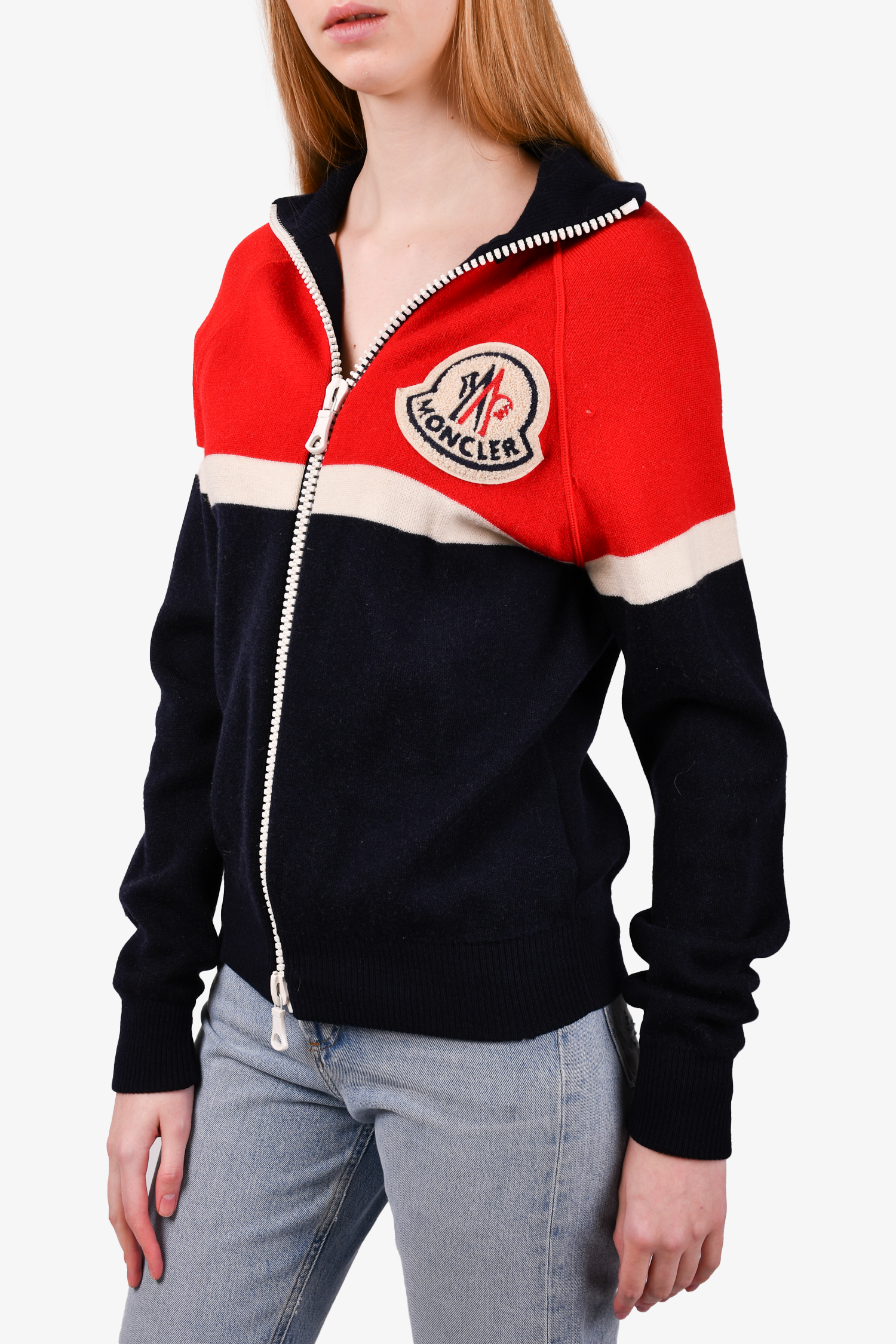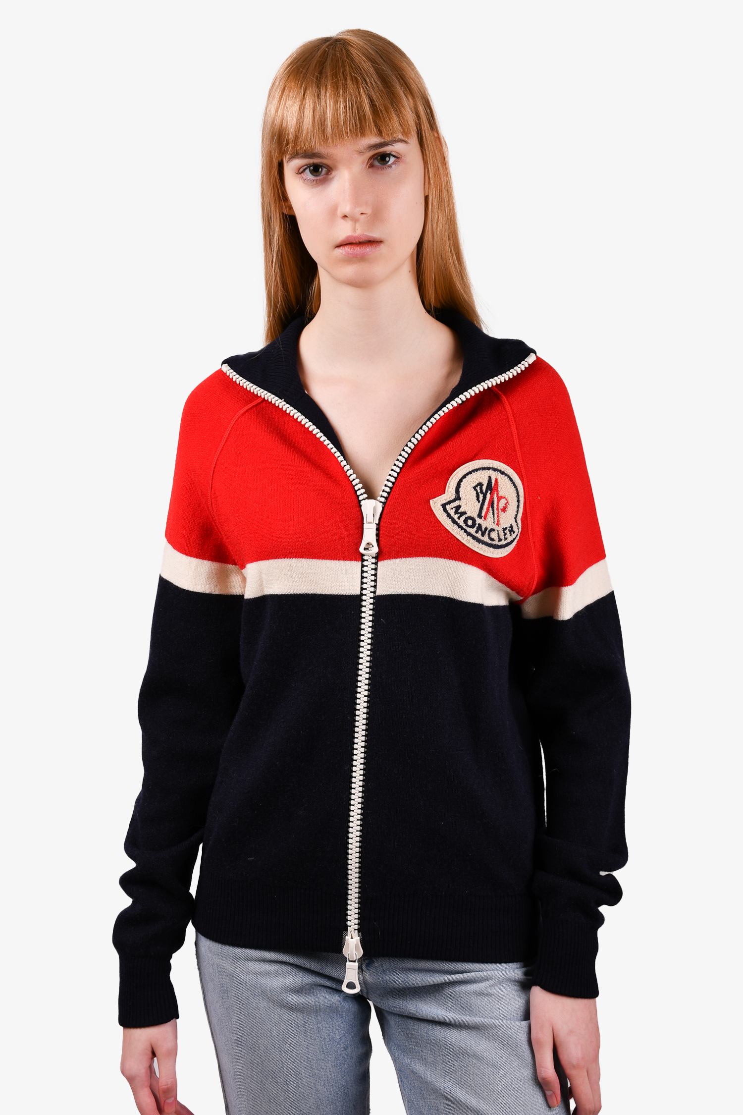 Refresh availabilityMoncler Navy Blue/Red Wool Maglion Zip-Up Cardigan. White hardware. Unlined.