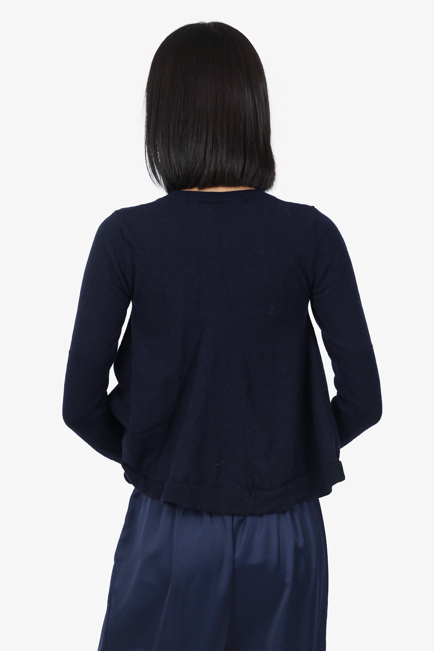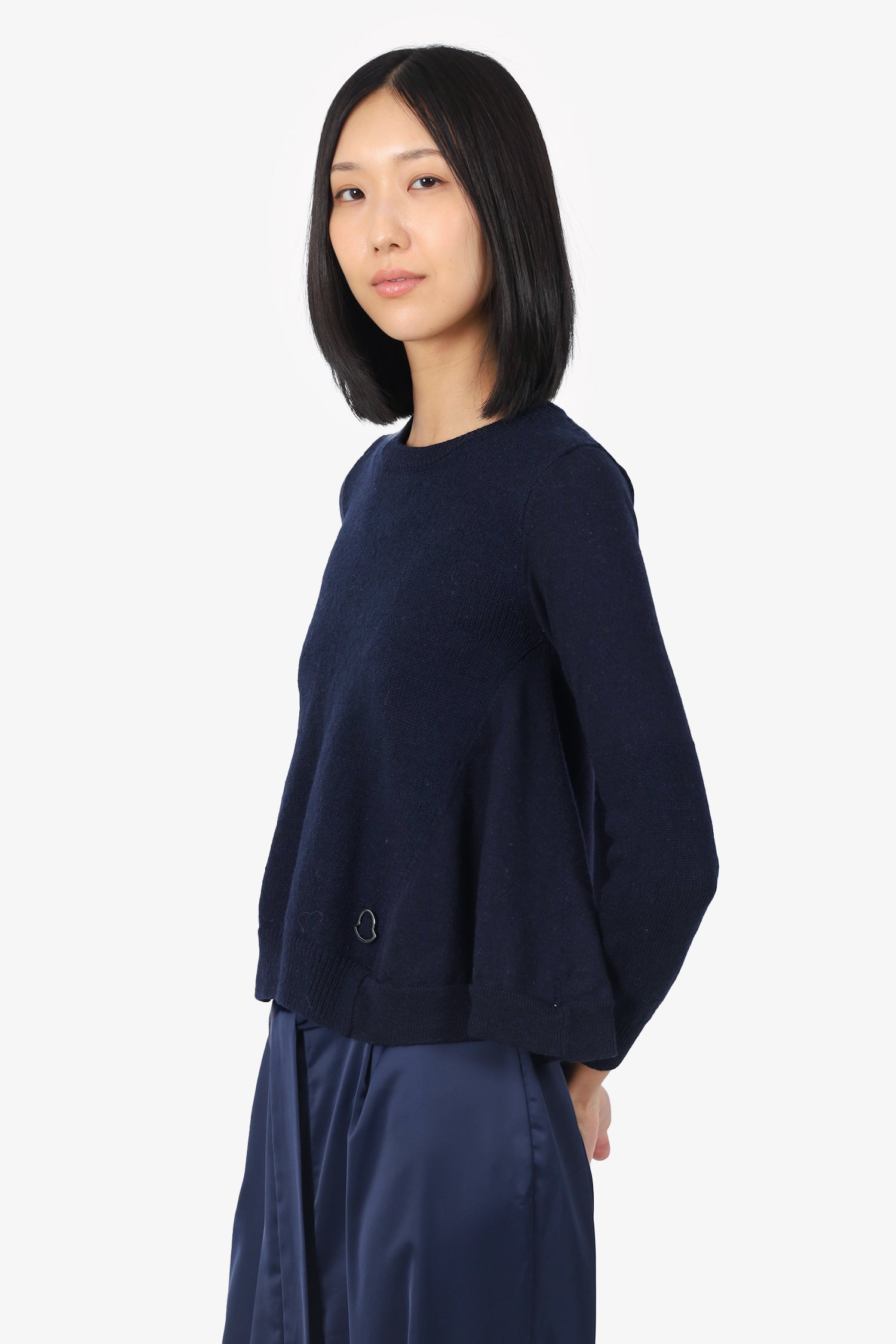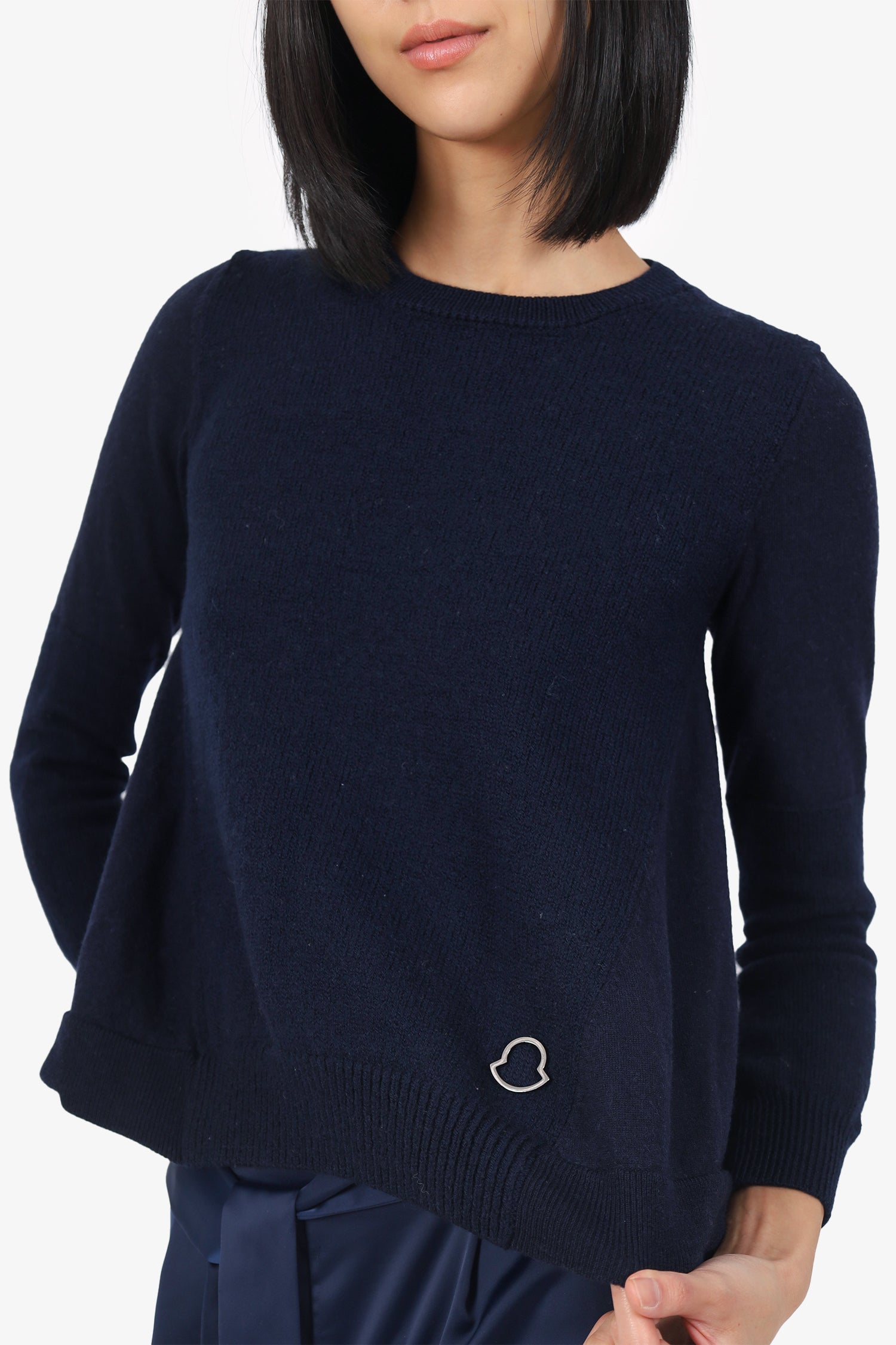 Refresh availabilityMoncler Navy Knit Wool Flared Sweater. Pull-on. Round neckline. Logo embellishment on front. Gunmetal hardware. Tonal stitching.