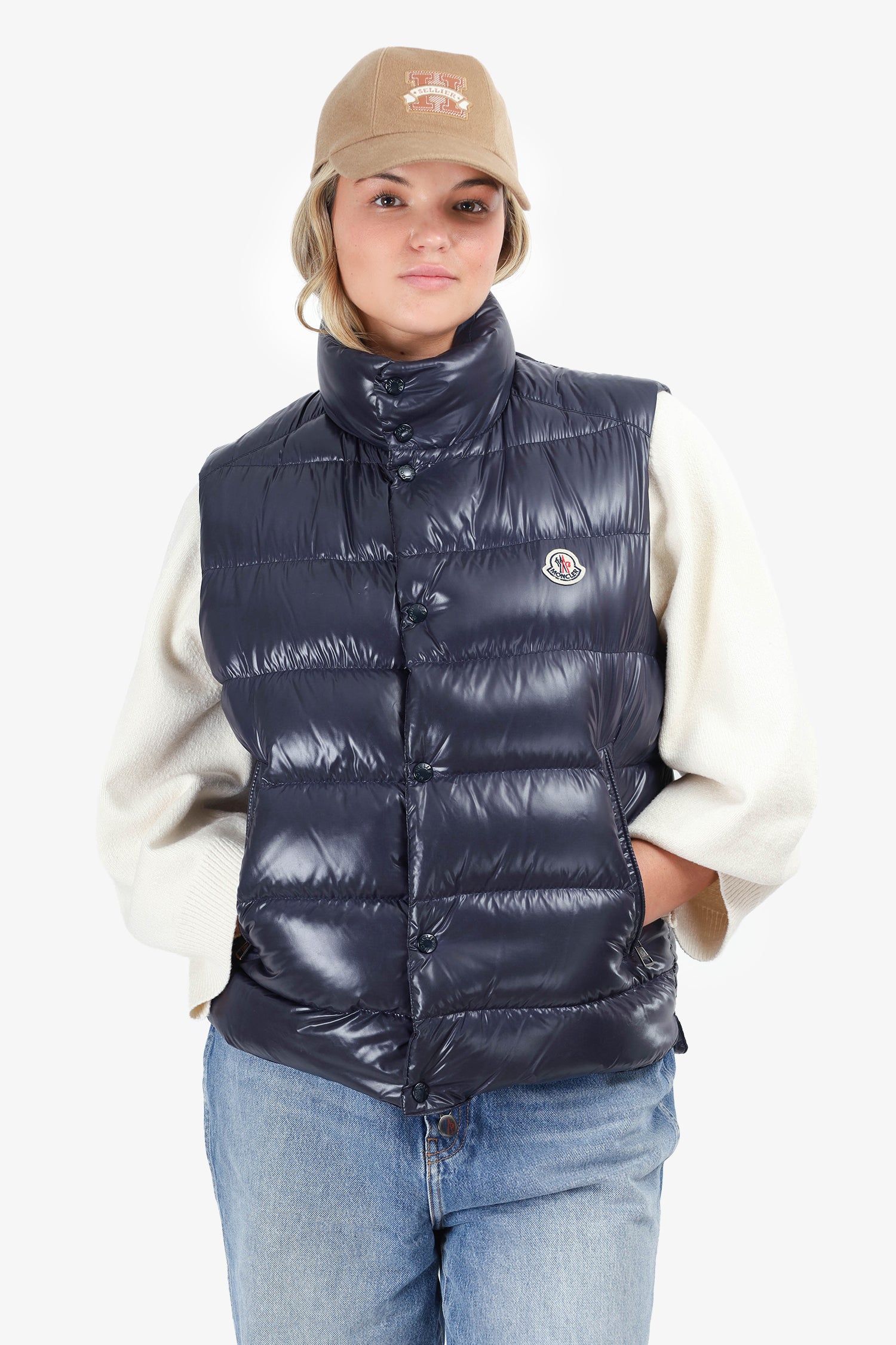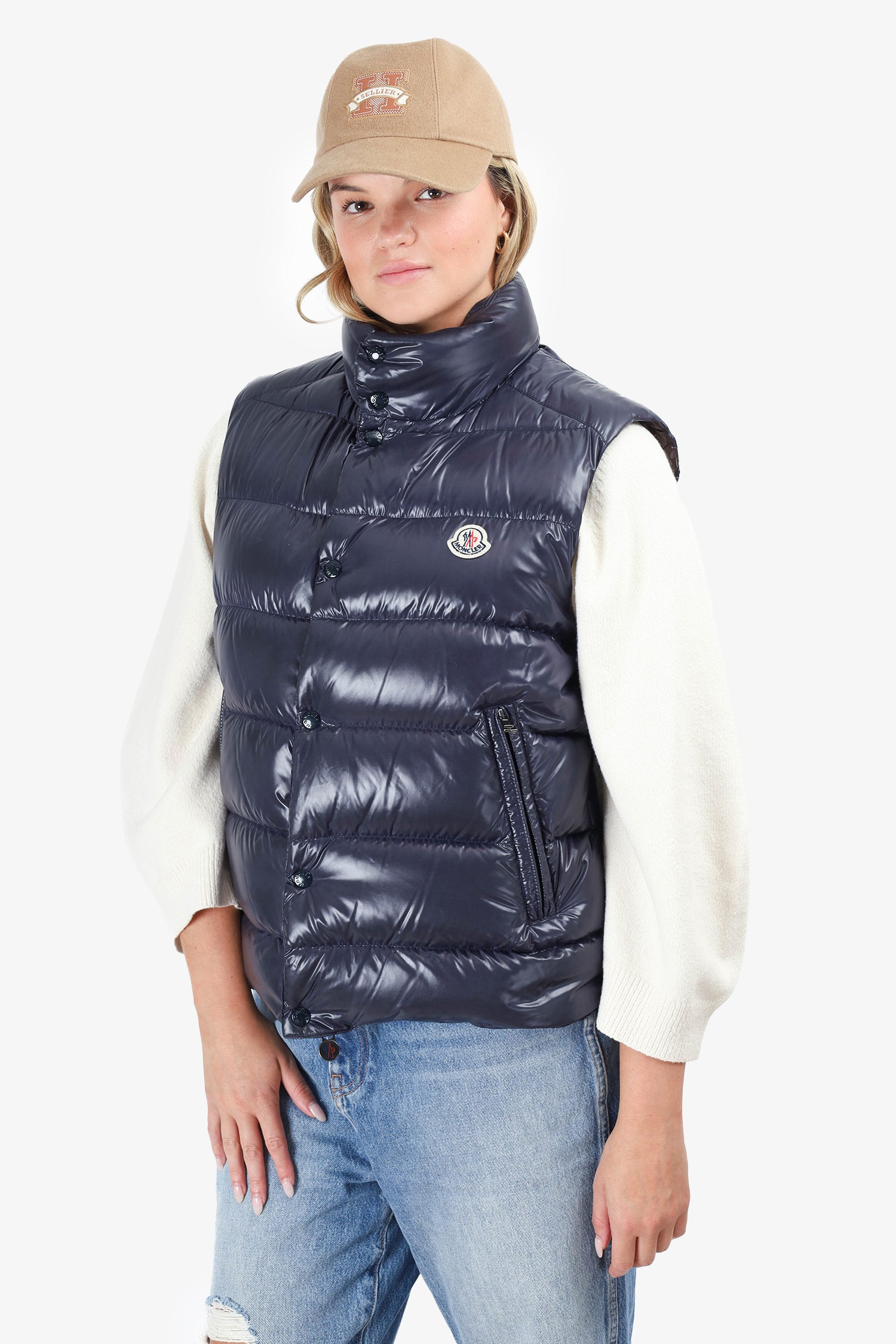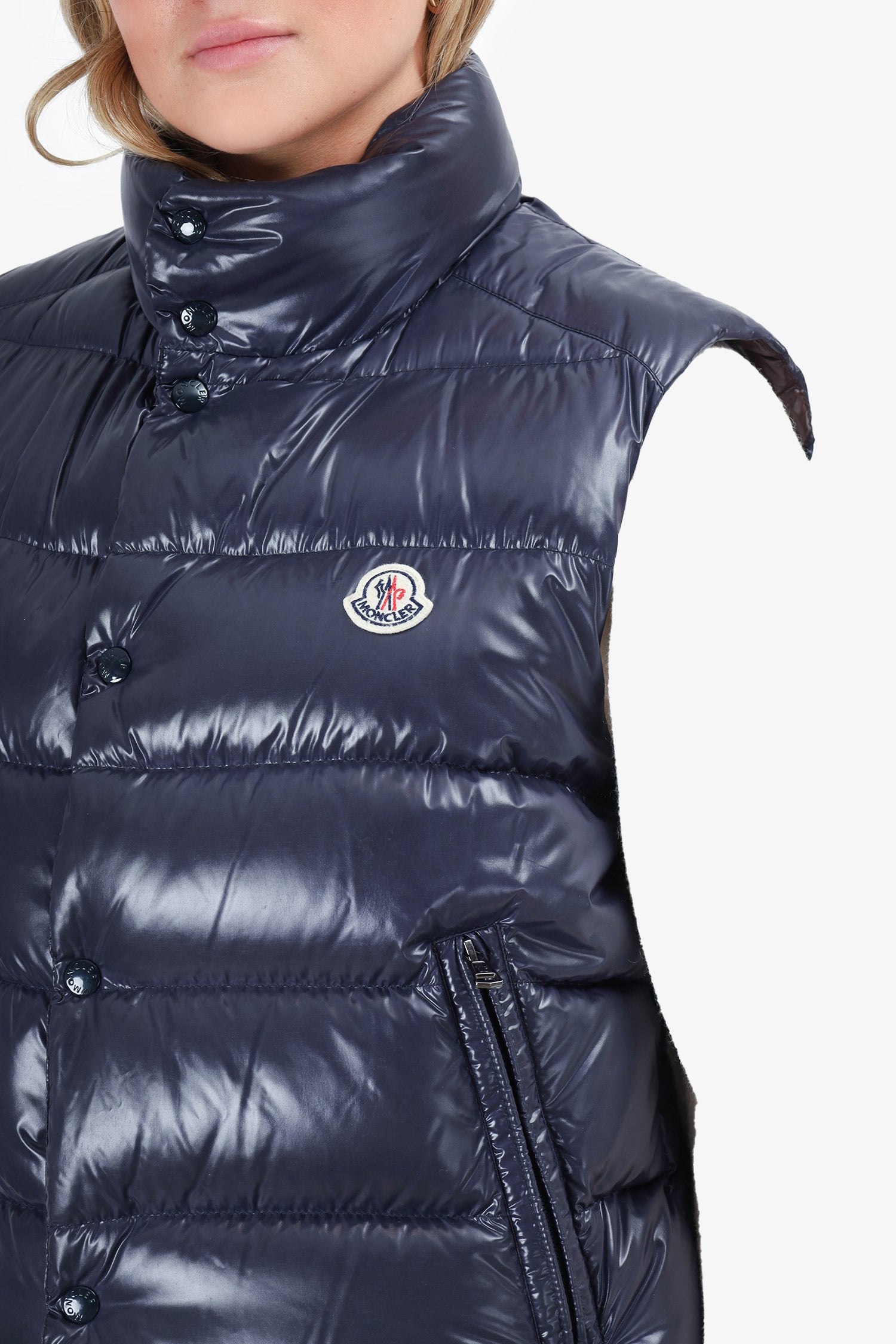 Refresh availabilityMoncler Navy Quilted Puffer Vest. Front zip up with snap button closure. 2 side pockets with front snap button and zip closure.