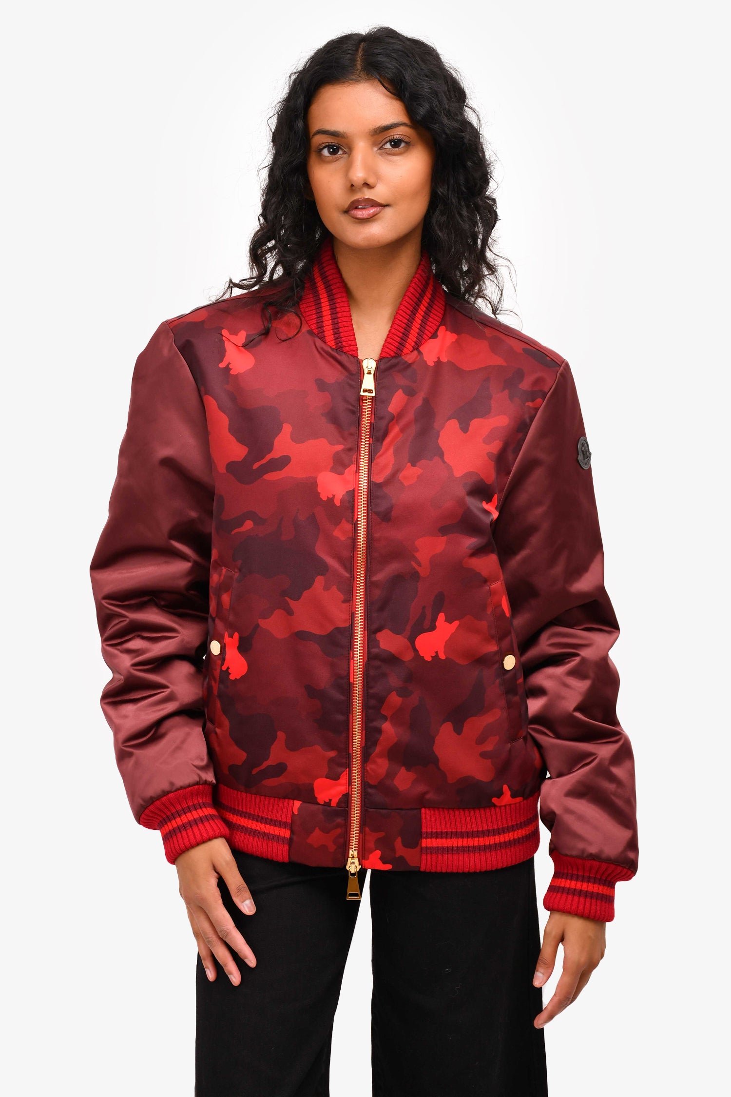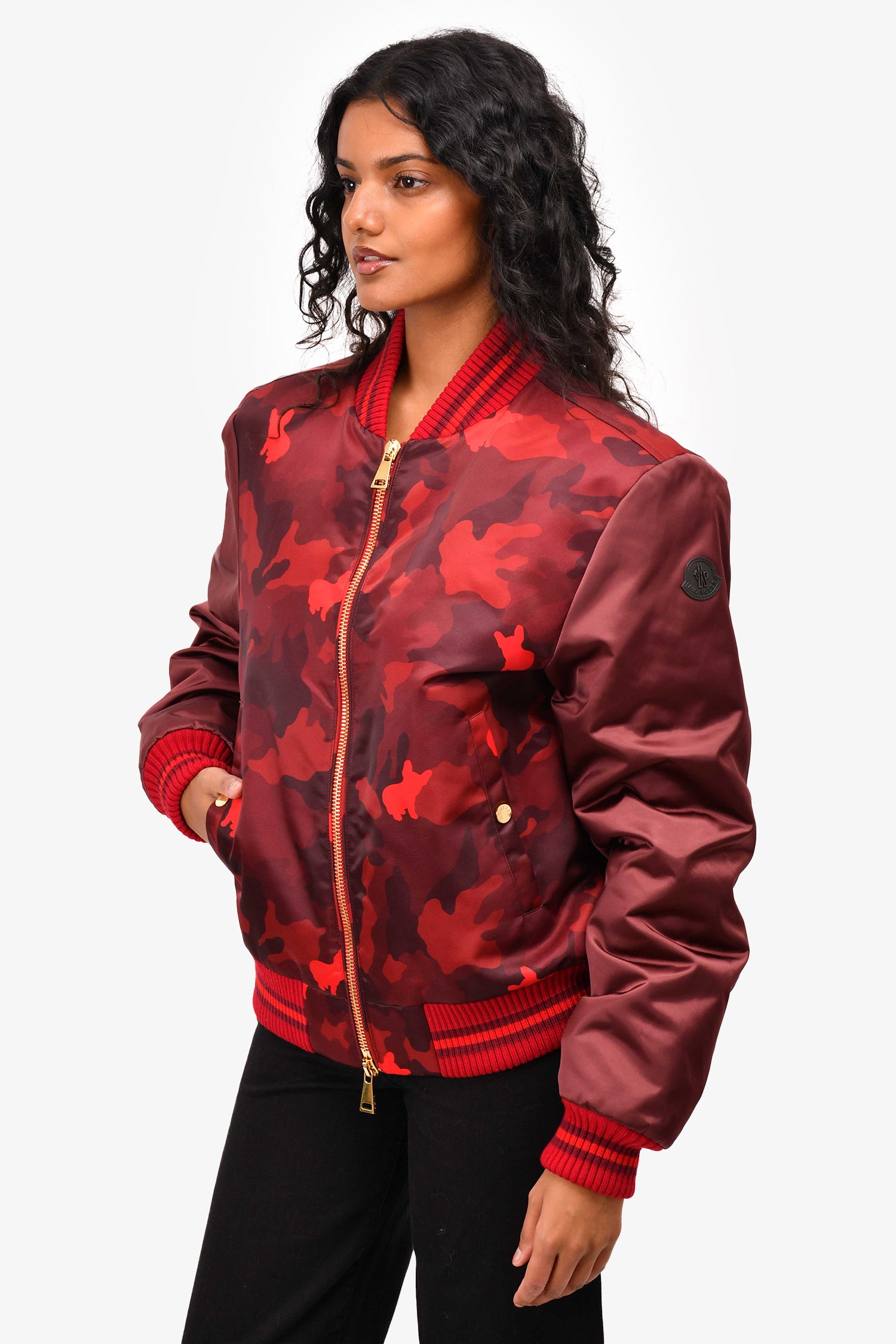Refresh availabilityMoncler Red Camouflage Nylon Bomber Jacket. Front two-way zip closure. Front pockets with snap-button closure. Ribbed neck, cuffs and hem. Lined.