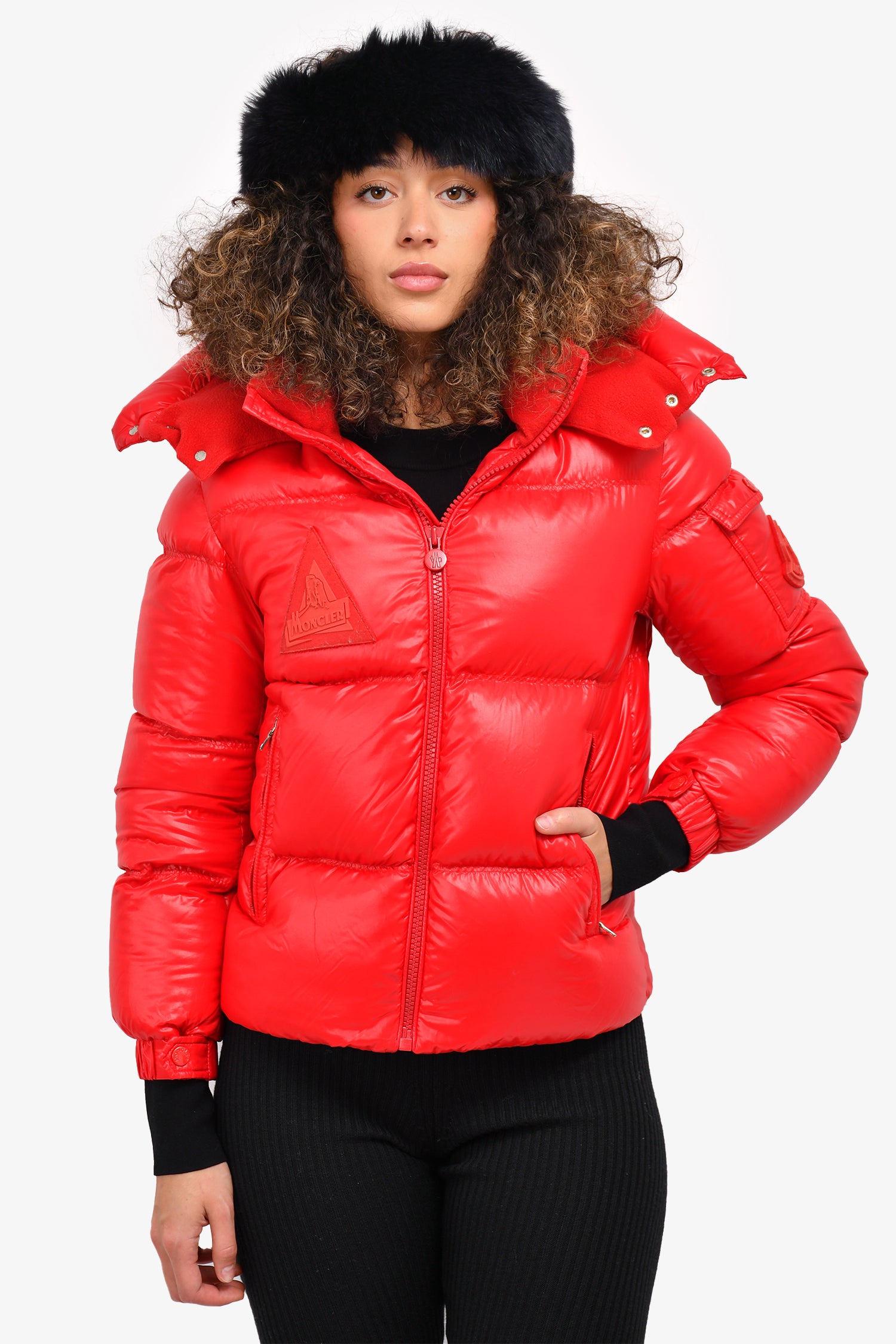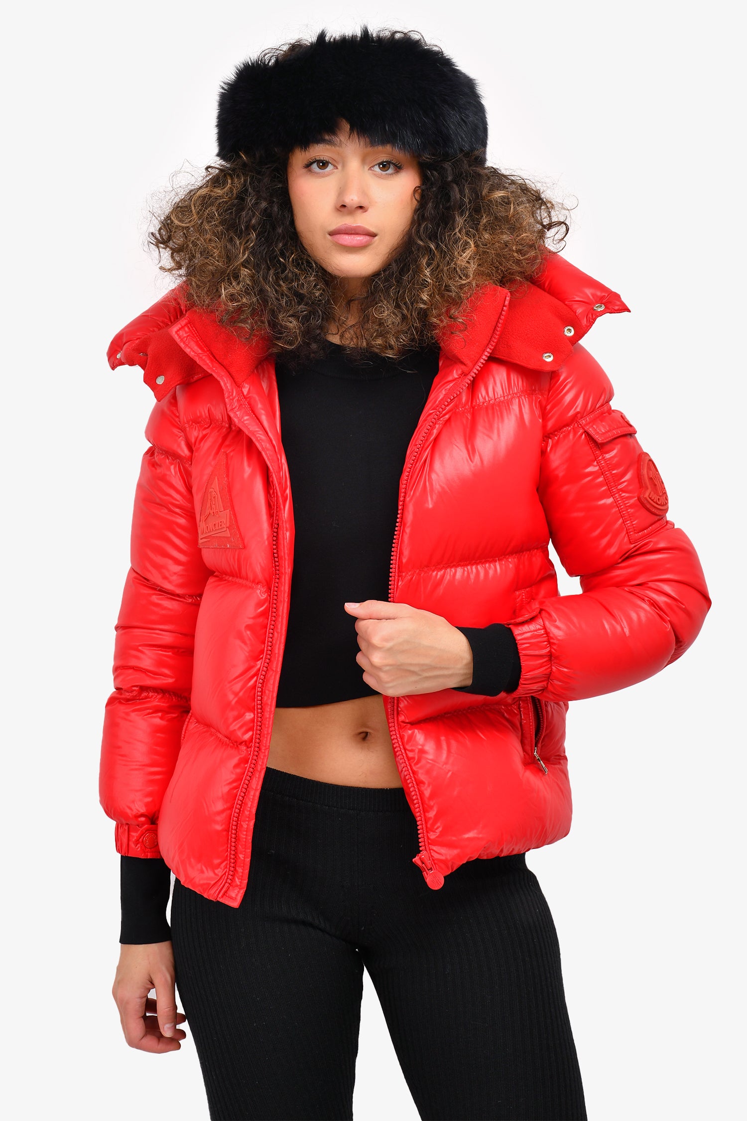 Refresh availabilityMoncler Red Down 'Ecrins Giubbotto' Hooded Jacket. Front zip up closure. Detachable Hoop with snap button closure. Logo on chest and left sleeve. Side pocket with zipper closure. Elasticated sleeves with button up closure. Silver-tone hardware. Tonal stitching.