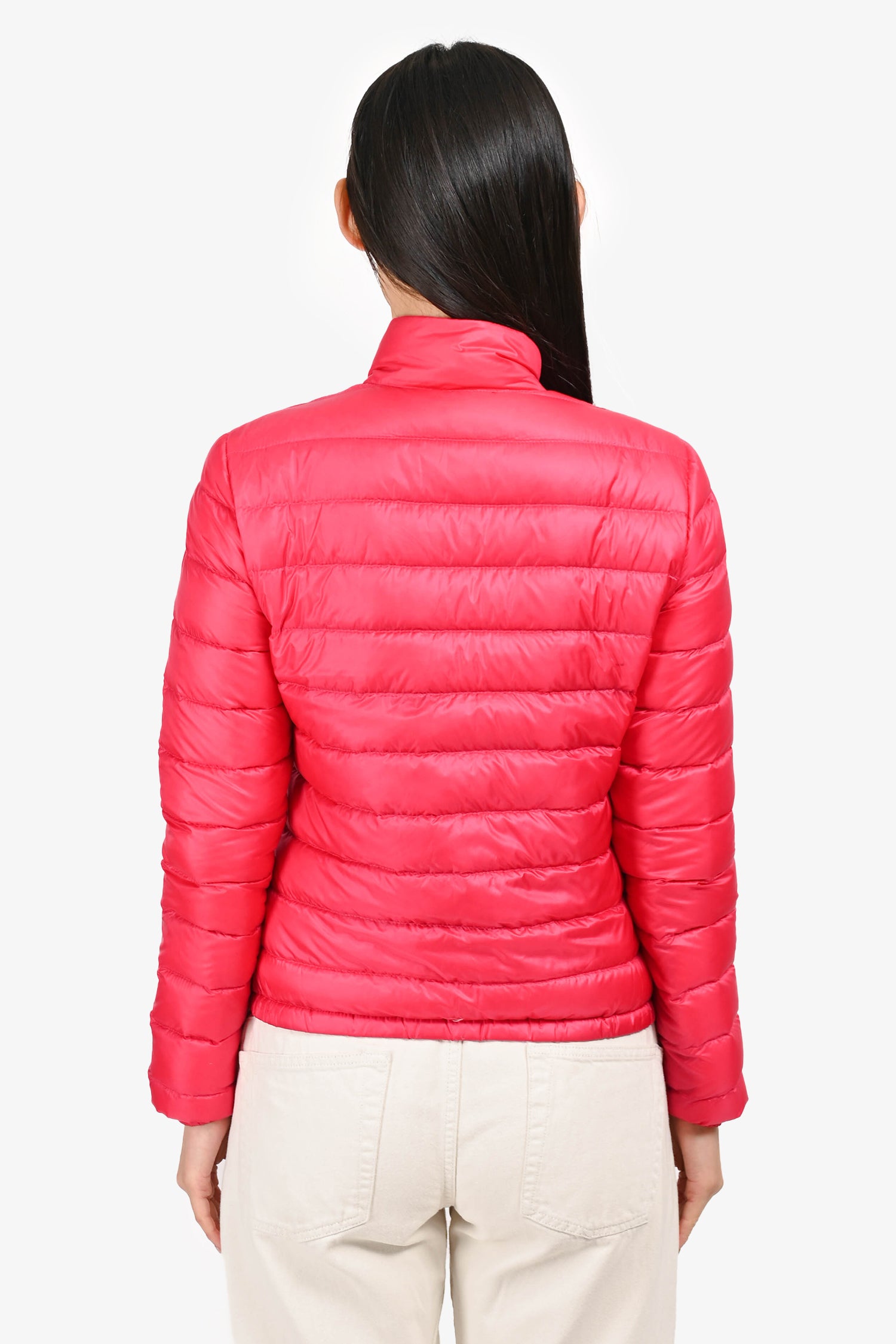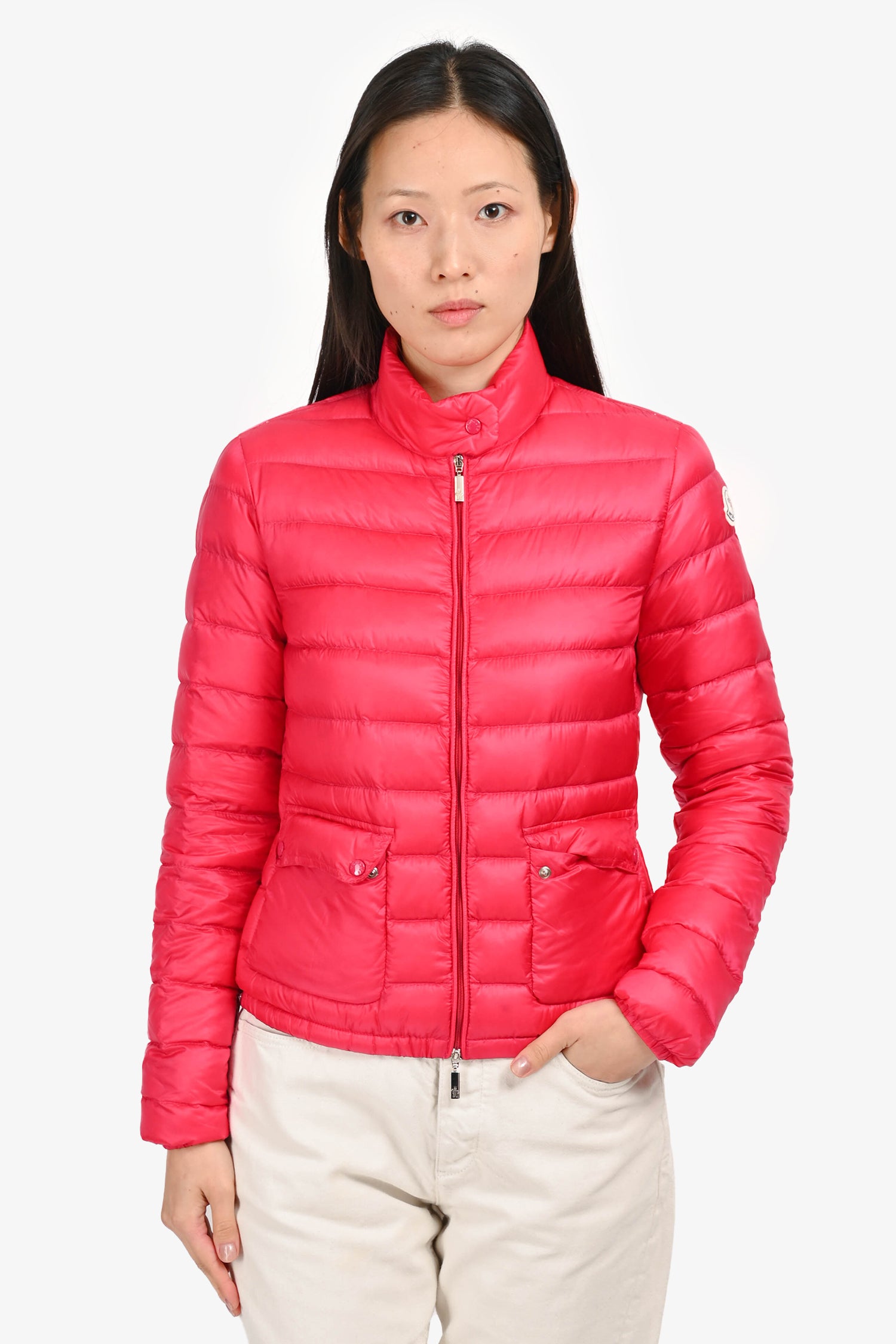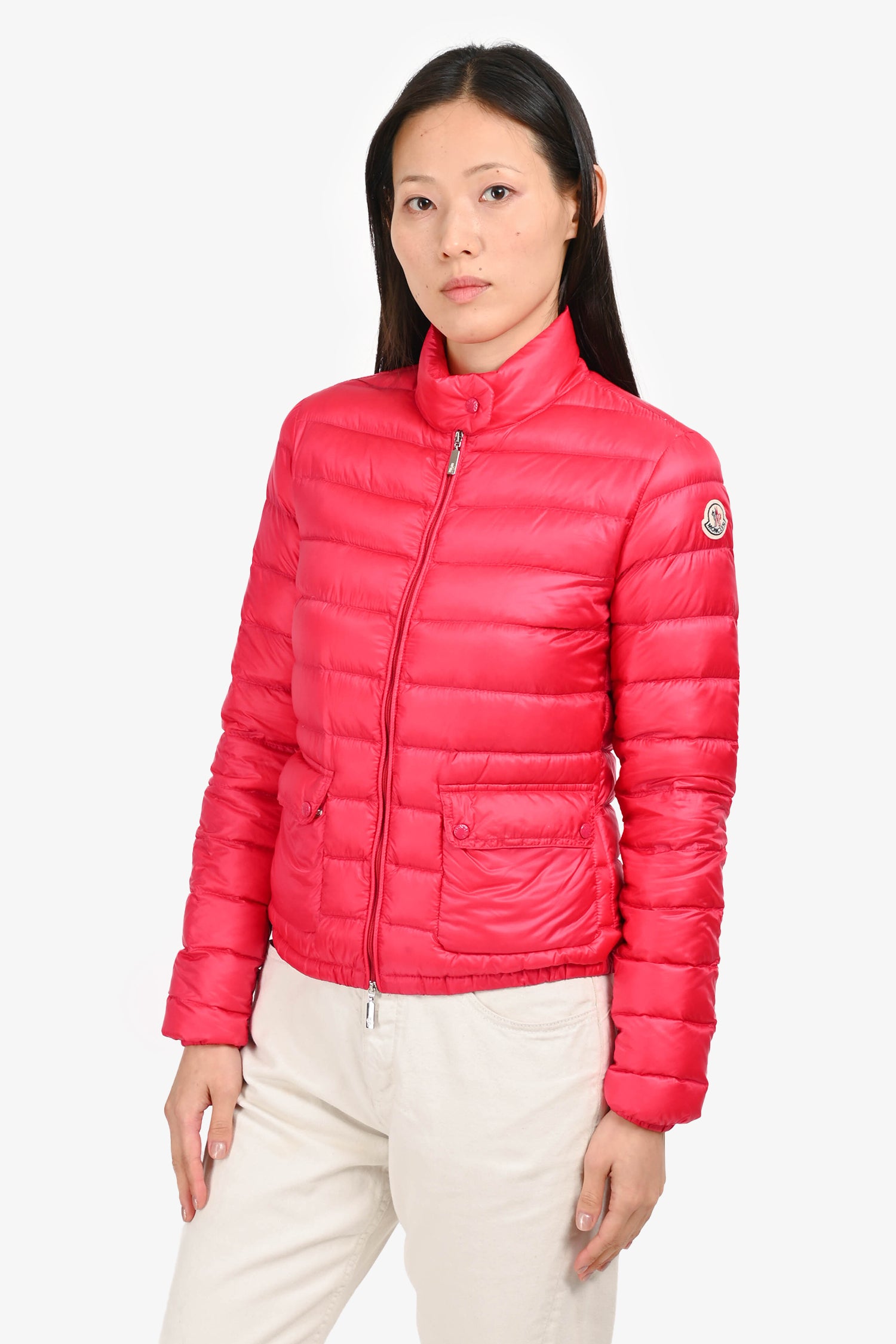 Refresh availabilityMoncler Red Lightweight Puffer Jacket. Two-way front zipper closure with snap button closure on the collar. 2 front pockets with snap button closures. Elasticized cuffs and hem. Silver-tone hardware. Tonal stitching.
