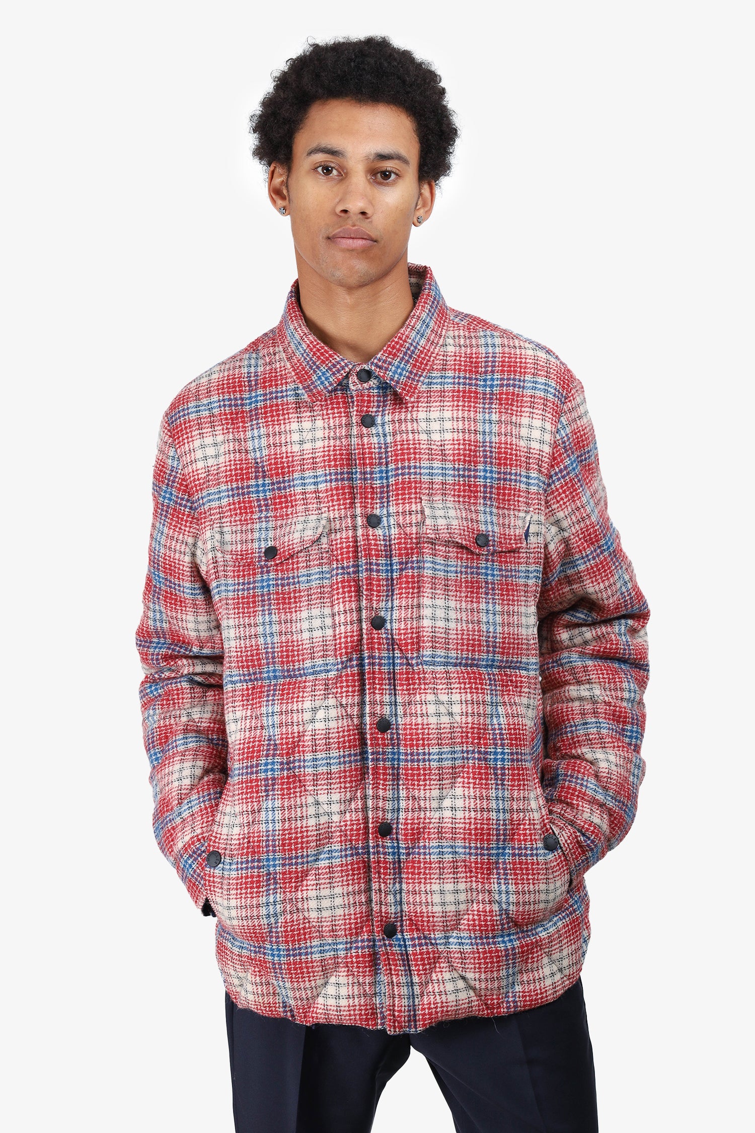 Refresh availabilityMoncler Red Plaid Down Jacket. Collared neckline. Front snap button closure. 4 front snap button pockets; 2 with fold-over flaps. Snap button closure on sleeve cuffs. Lined. Tonal stitching.