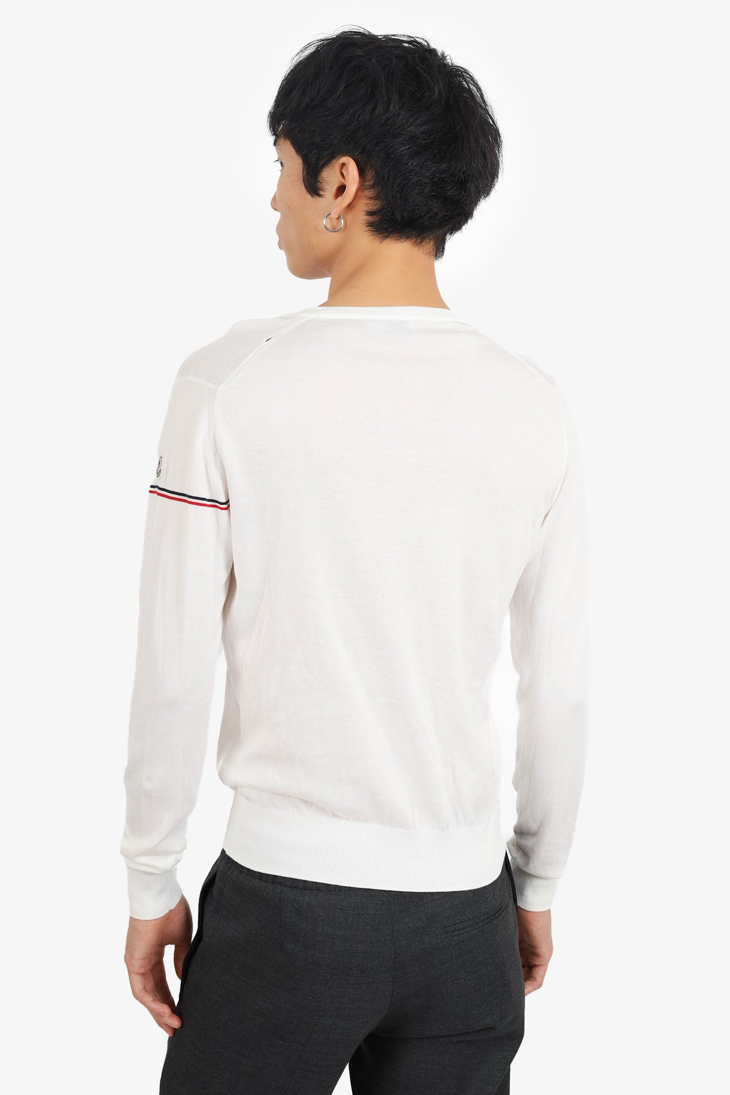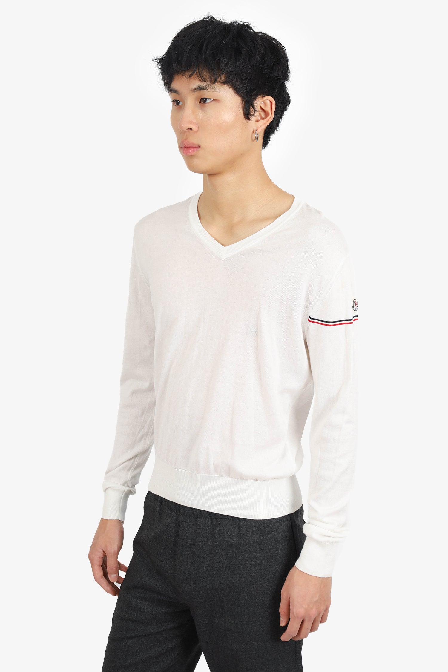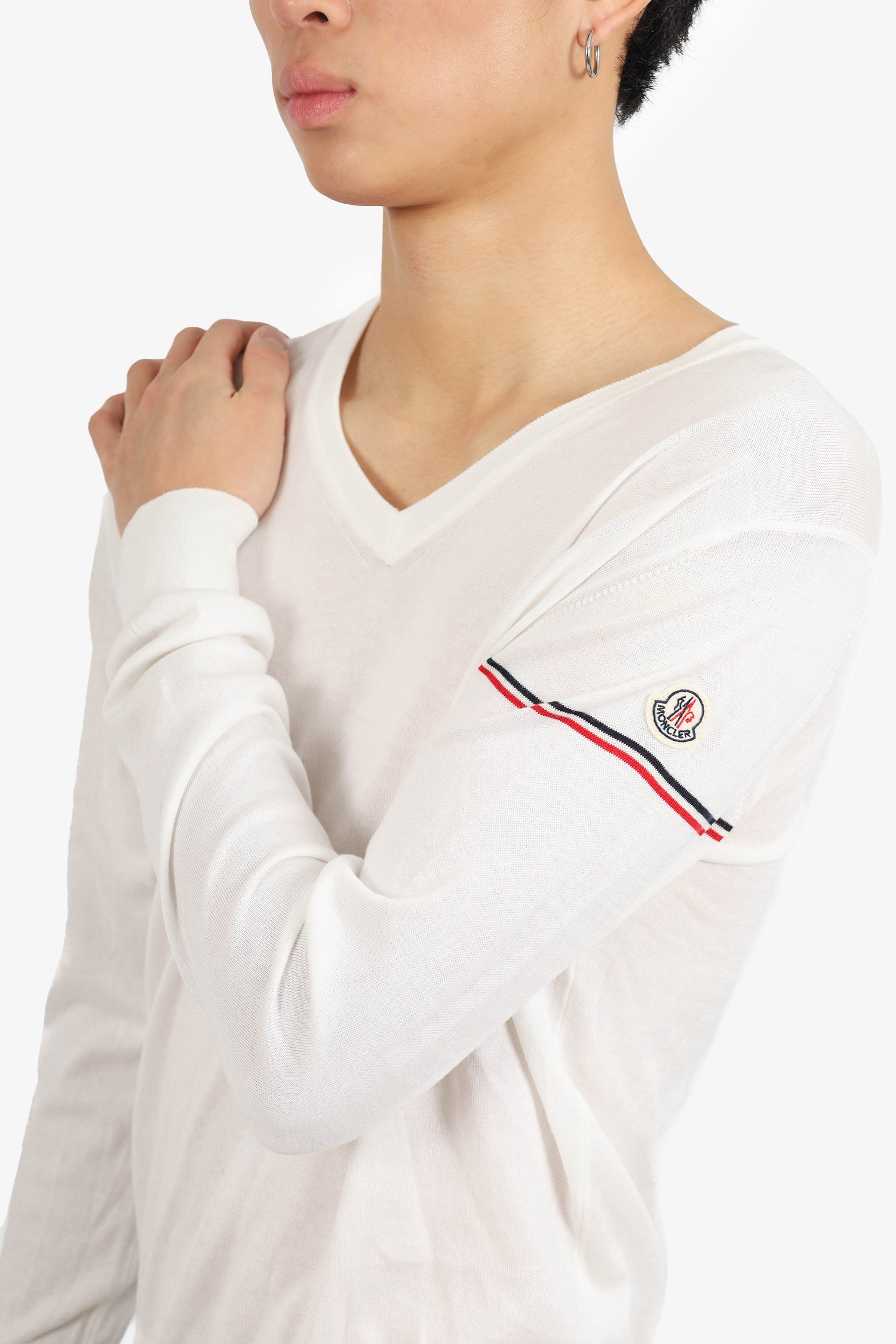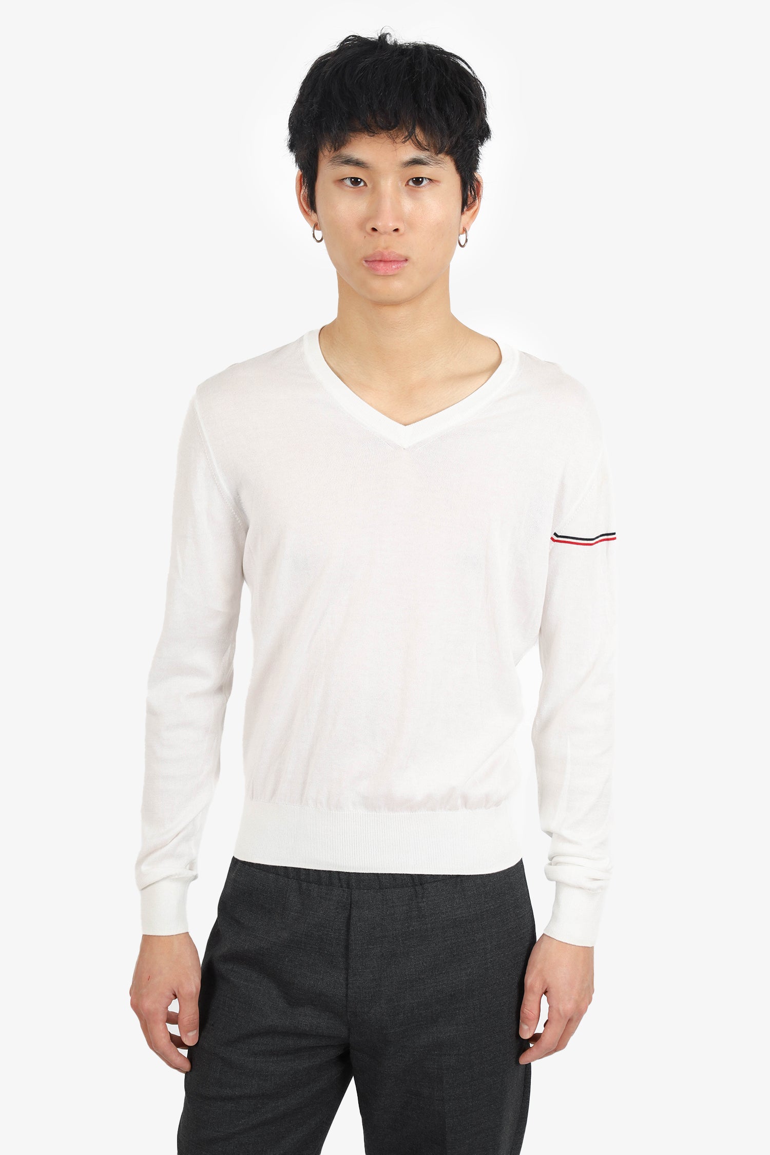 Refresh availabilityMoncler White V-Neck Long Sleeve Arm Logo Sweater. Pull-on. V-neckline. Ribbed neckline and bottom hem. Elasticated bottom hem. Unlined. Tonal stitching.