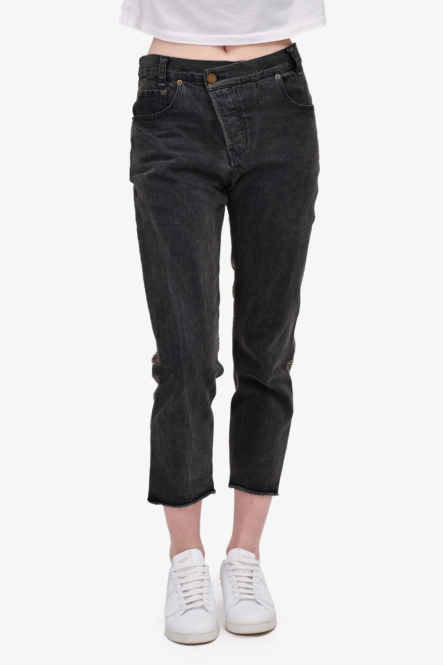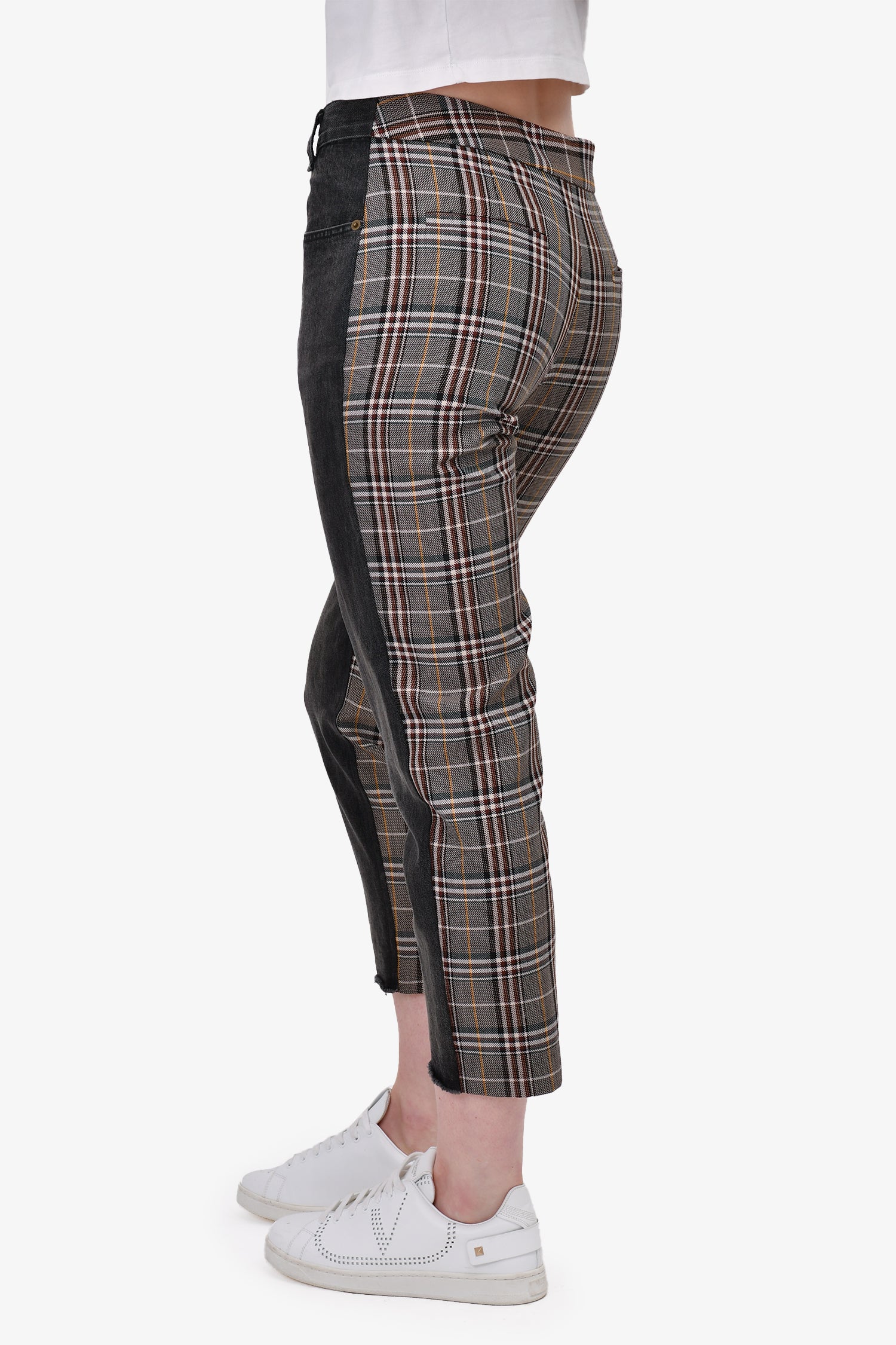 Refresh availabilityMonse Grey Denim/Plaid Pants. Front button fly up closure with gold-tone hardware. 3 front exterior pockets. 2 back exterior pockets. Belt loops. Tonal stitching.