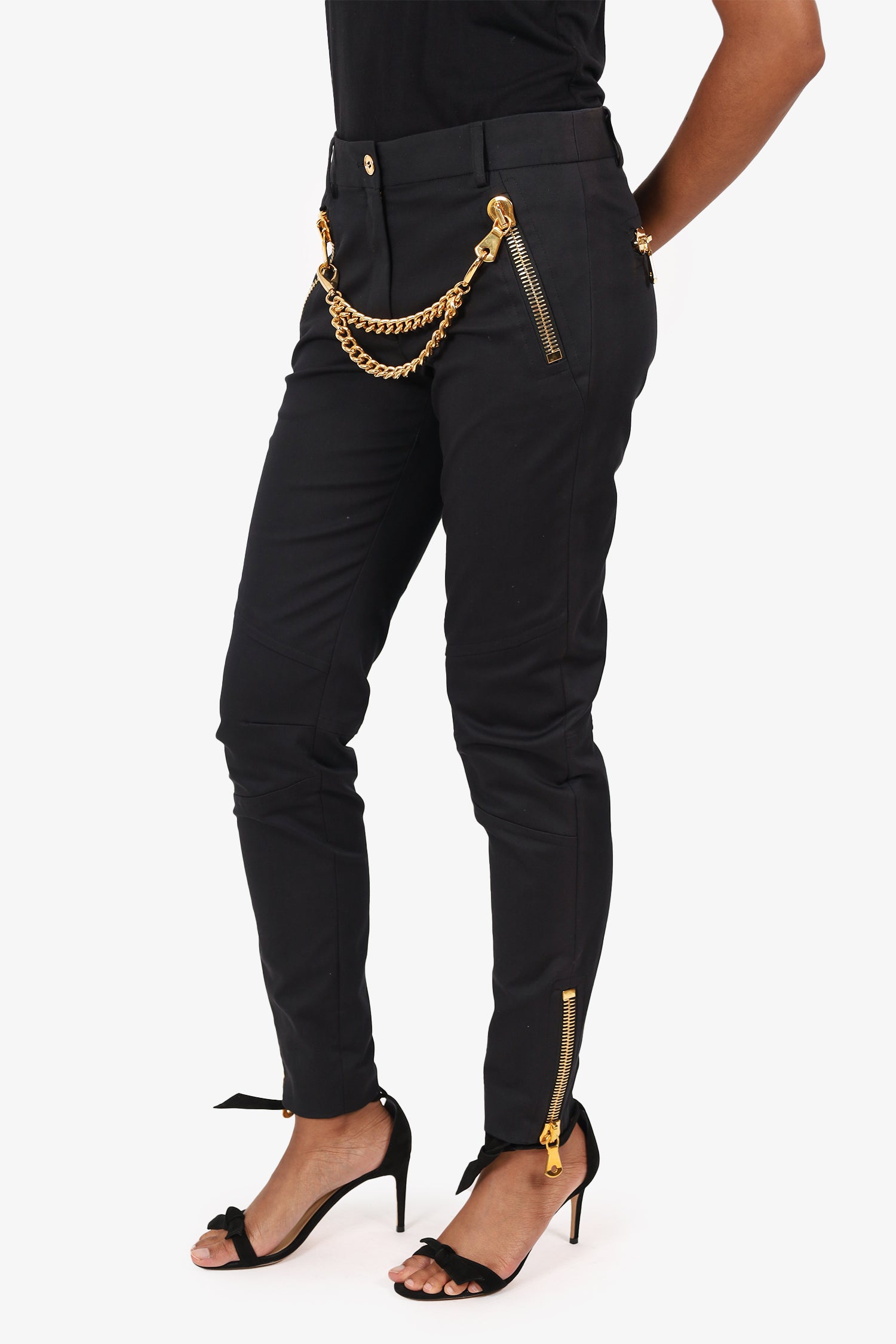 Refresh availabilityMoschino 30 Years Black Chain Pants. Pull-on. Front zip and button-up closure. Waistband belt loops. 2 front zip pockets with removable chain detail. 2 rear zip pockets. Zip closure at ankle cuffs. Gold-tone hardware. Tonal stitching.