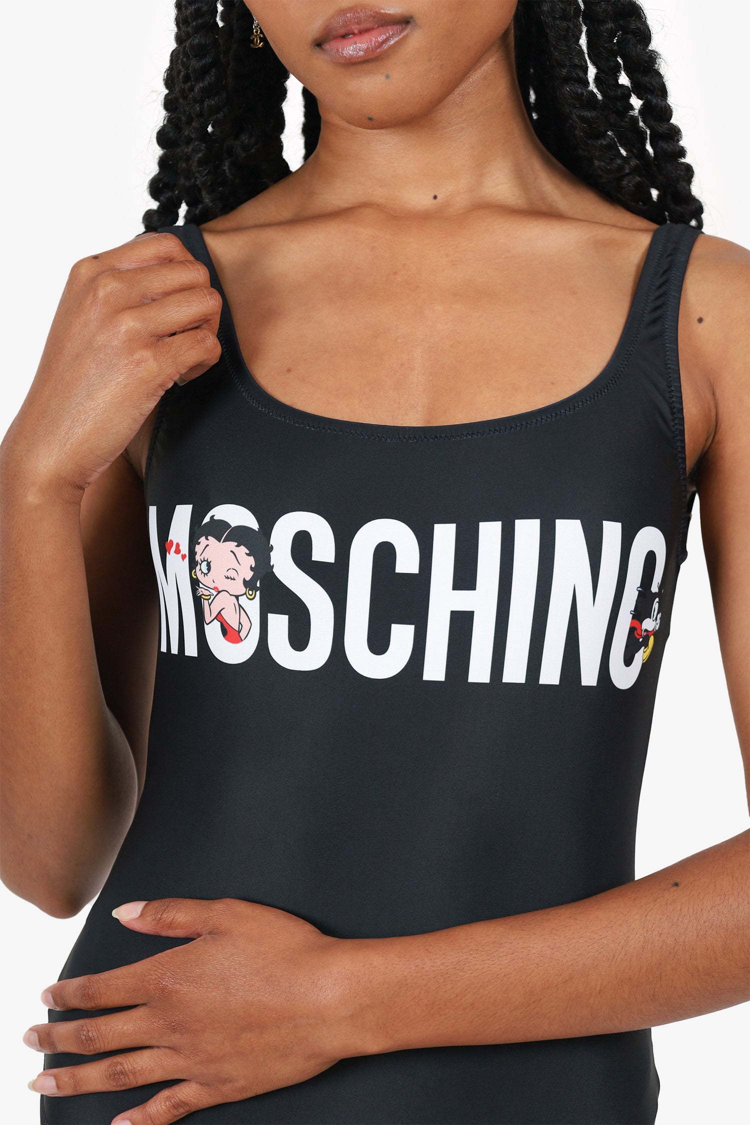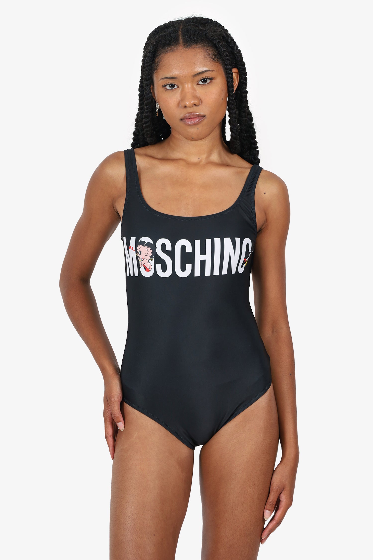 Refresh availabilityMoschino Black Betty Boop Logo Bathing Suit. Slip-on. Round neckline. Open back. Tonal stitching.
