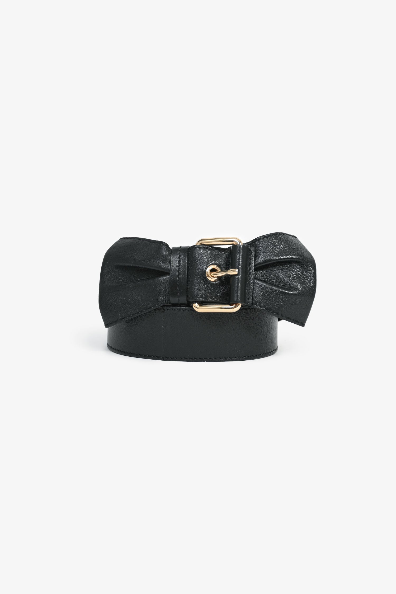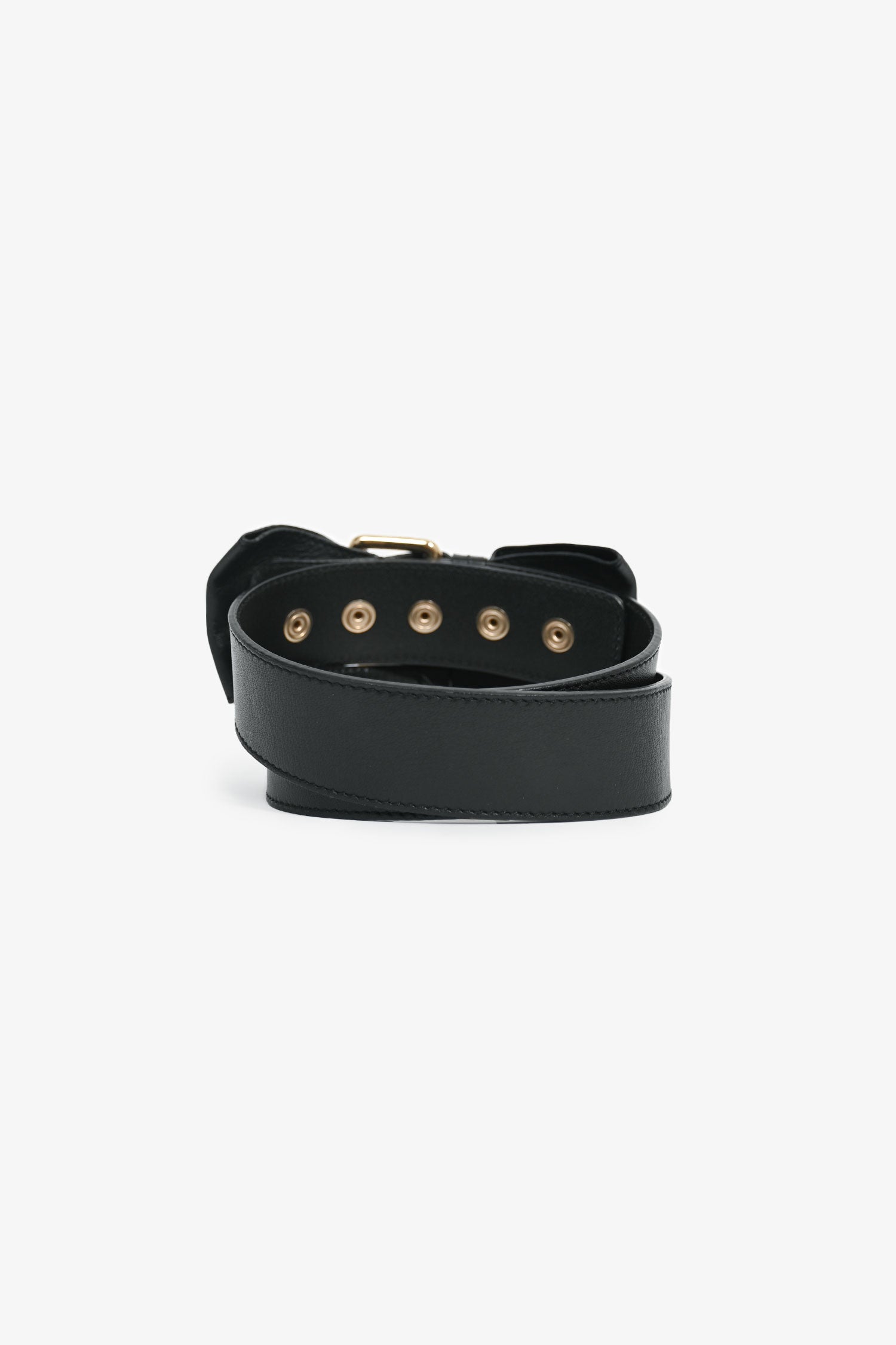 Refresh availabilityMoschino Black Leather Bow Waist Belt. Gold-tone hardware. Tonal stitching.