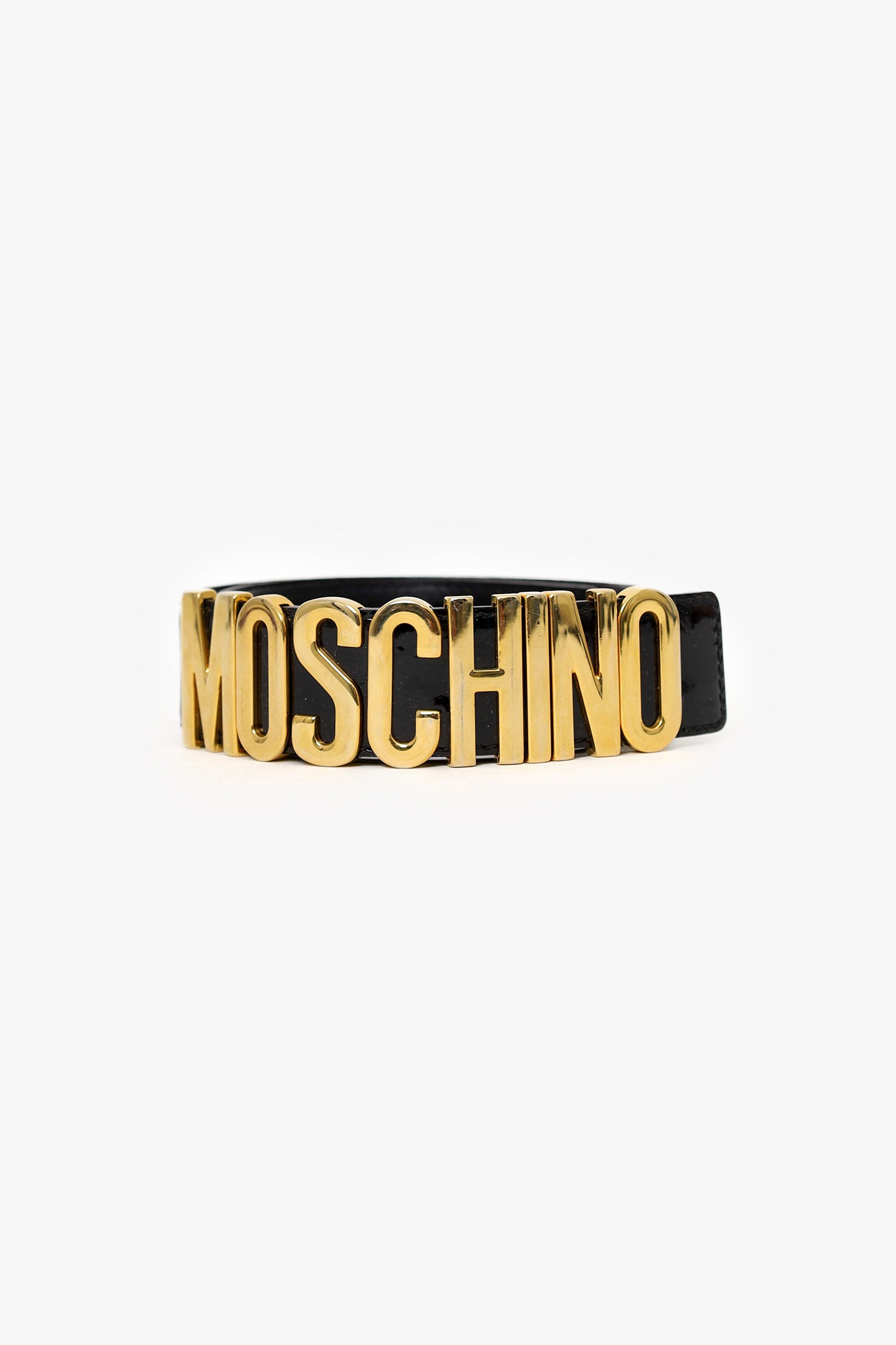 Refresh availabilityMoschino Black Patent Leather Gold Logo Belt. Adjustable push-pin closure. Tonal stitching. Gold-tone hardware.