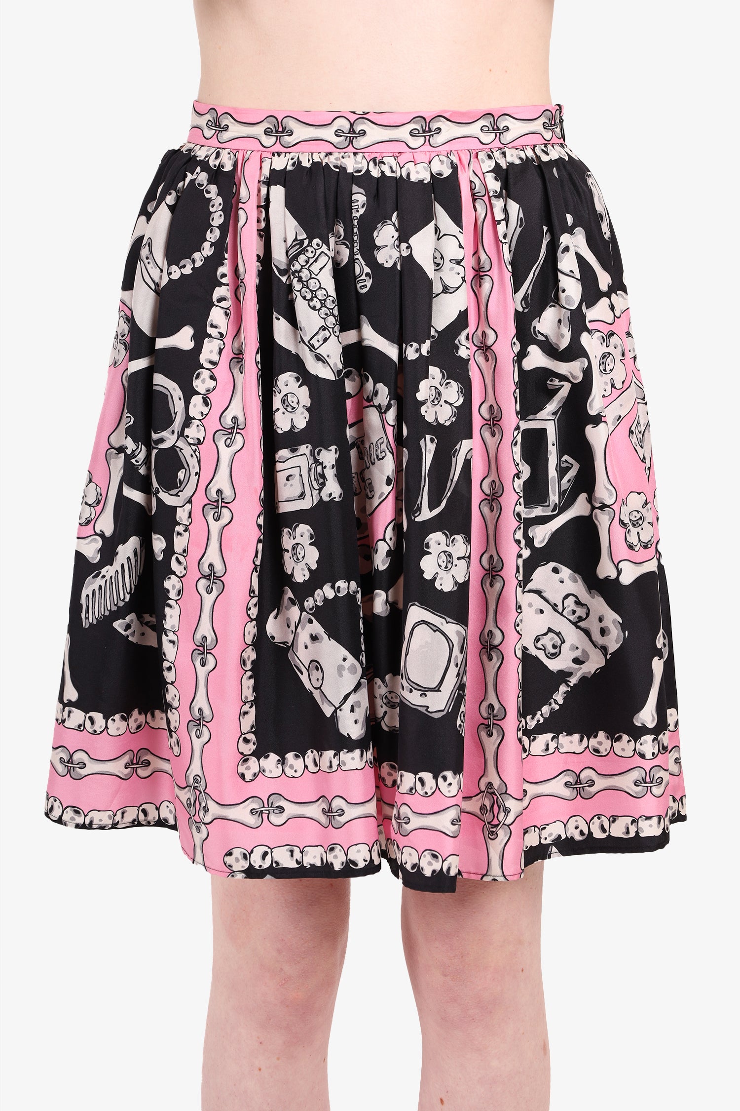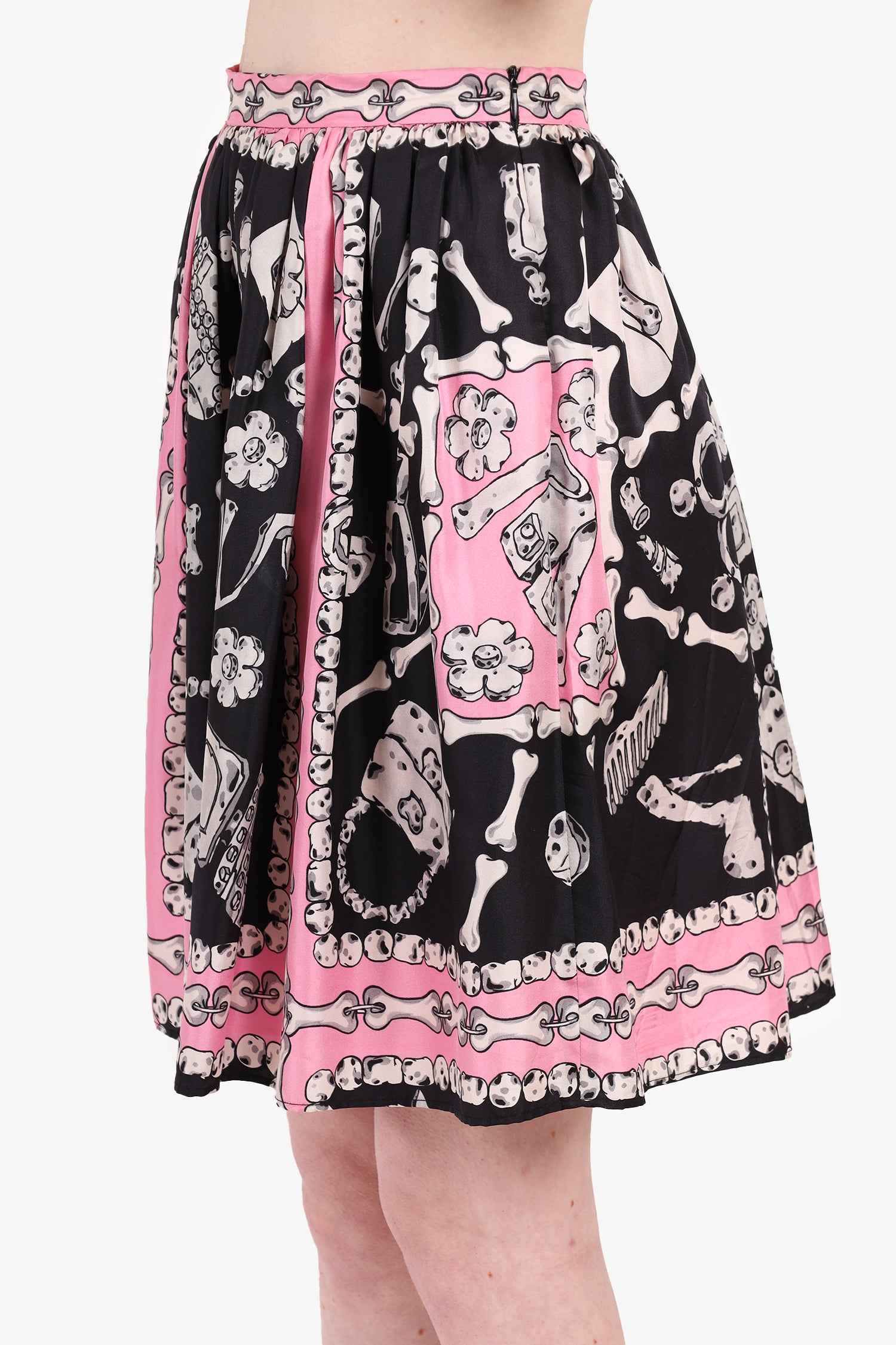 Refresh availabilityMoschino Black/Pink/White Silk Bones Historic Chic Skirt. Back zipper closure. Inner Lining. Tonal stitching.