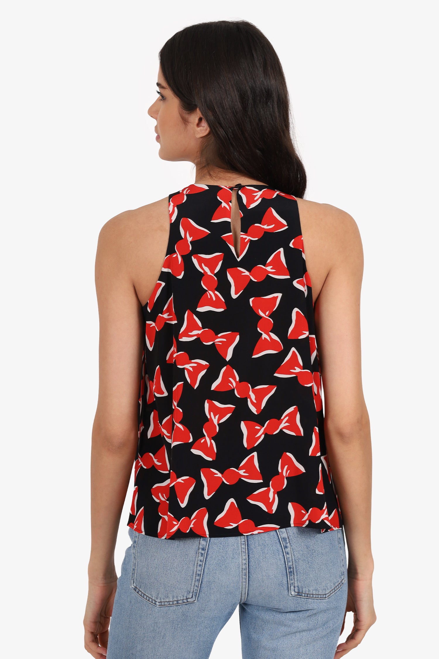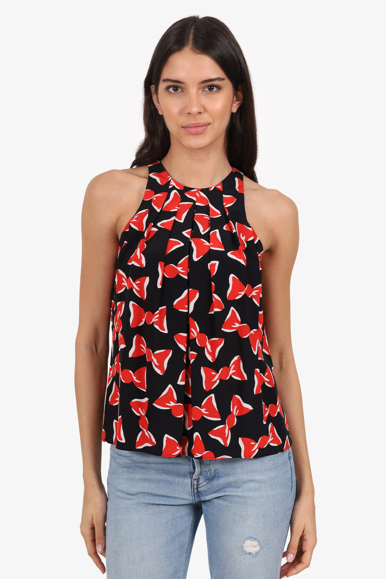 Refresh availabilityMoschino Boutique Black/Red Silk Bow Print Top. Pull-on. Round neckline. Rear keyhole with button-up closure. Tonal stitching.