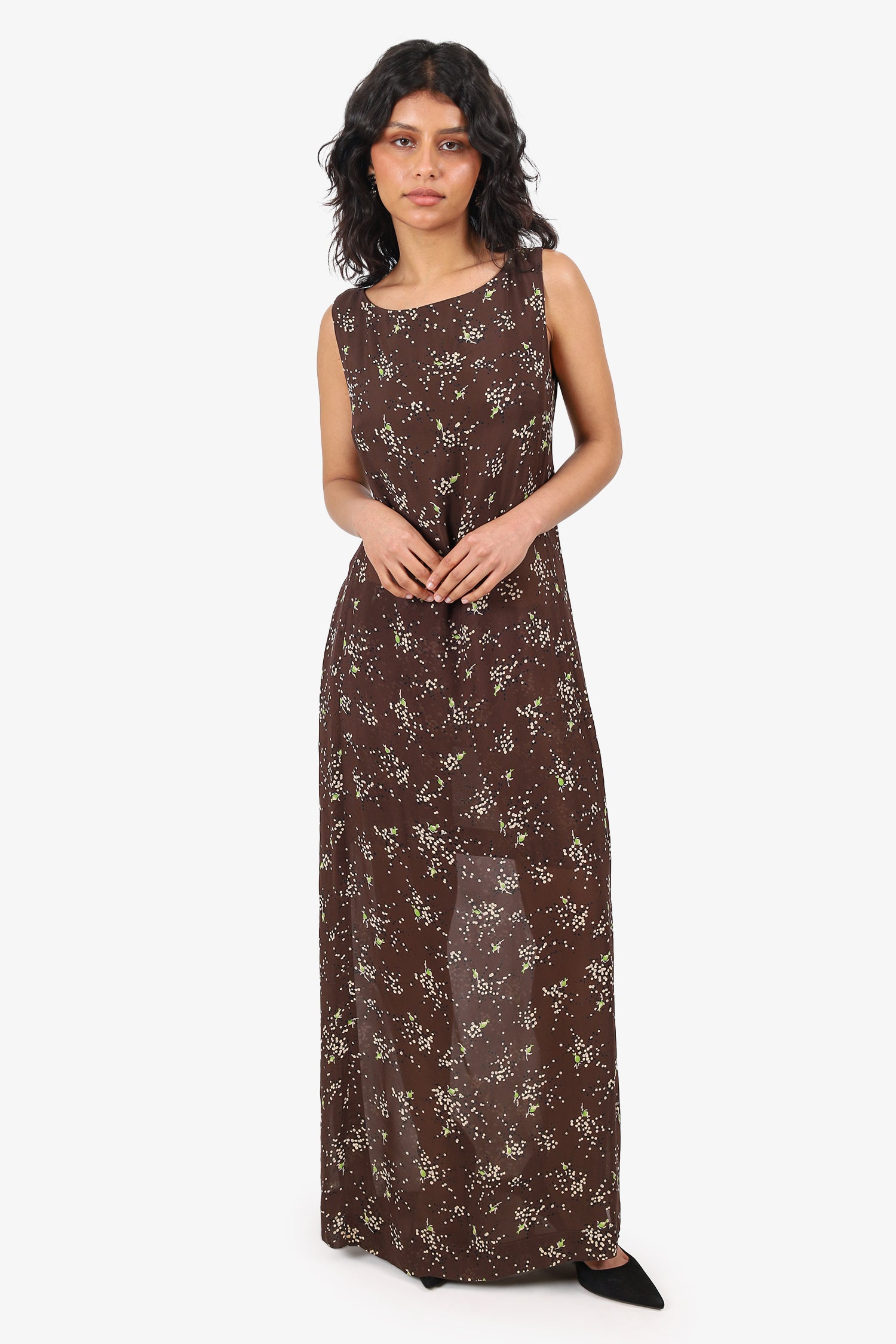Refresh availabilityMoschino Brown Floral Print Two-piece Dress. Top: Pull-on. Boat neckline. Rear zip and hook closure. Rear is cropped; Bottom: Slip-on. Rear zip with hook closure. Bottom left slit. Tonal stitching.