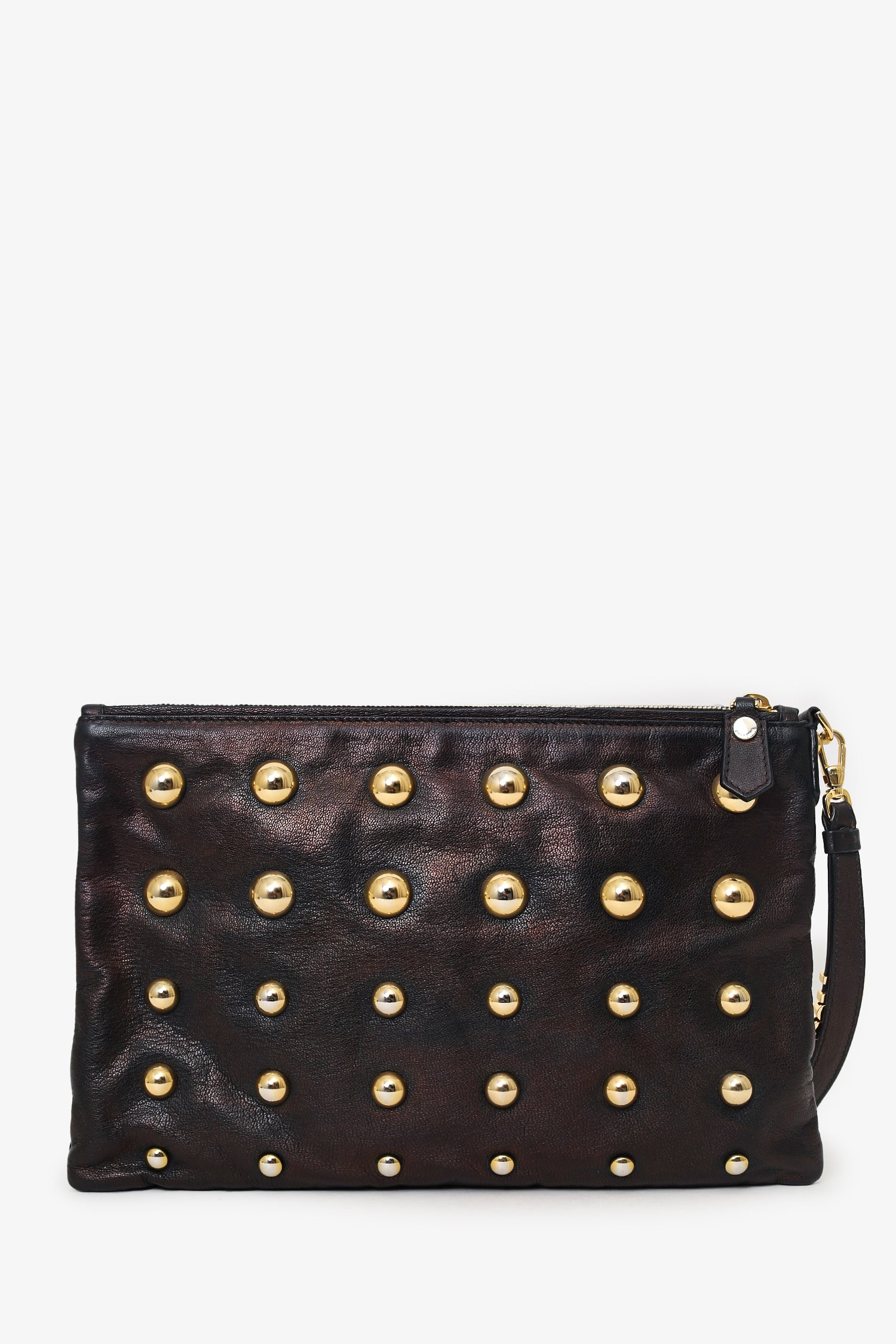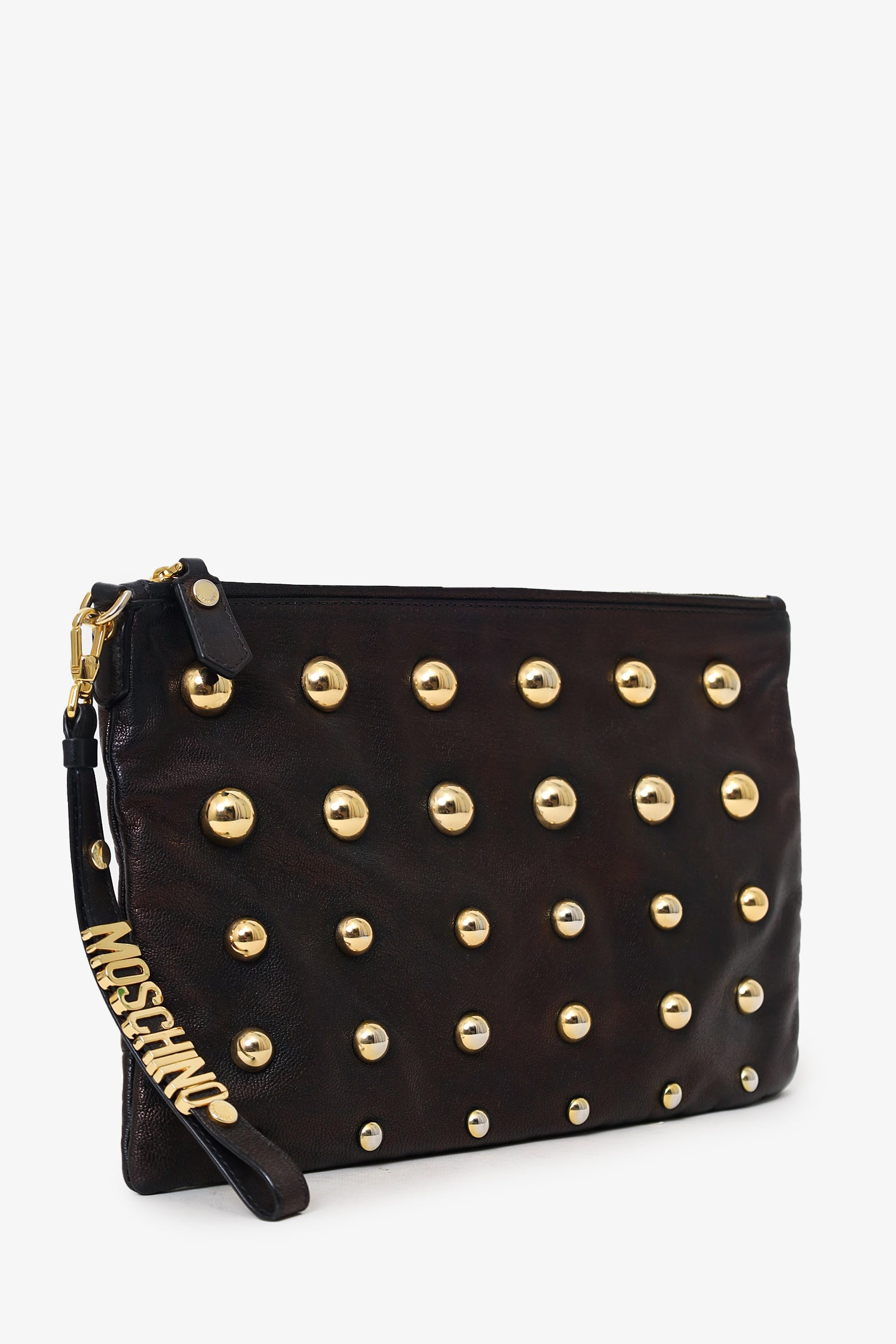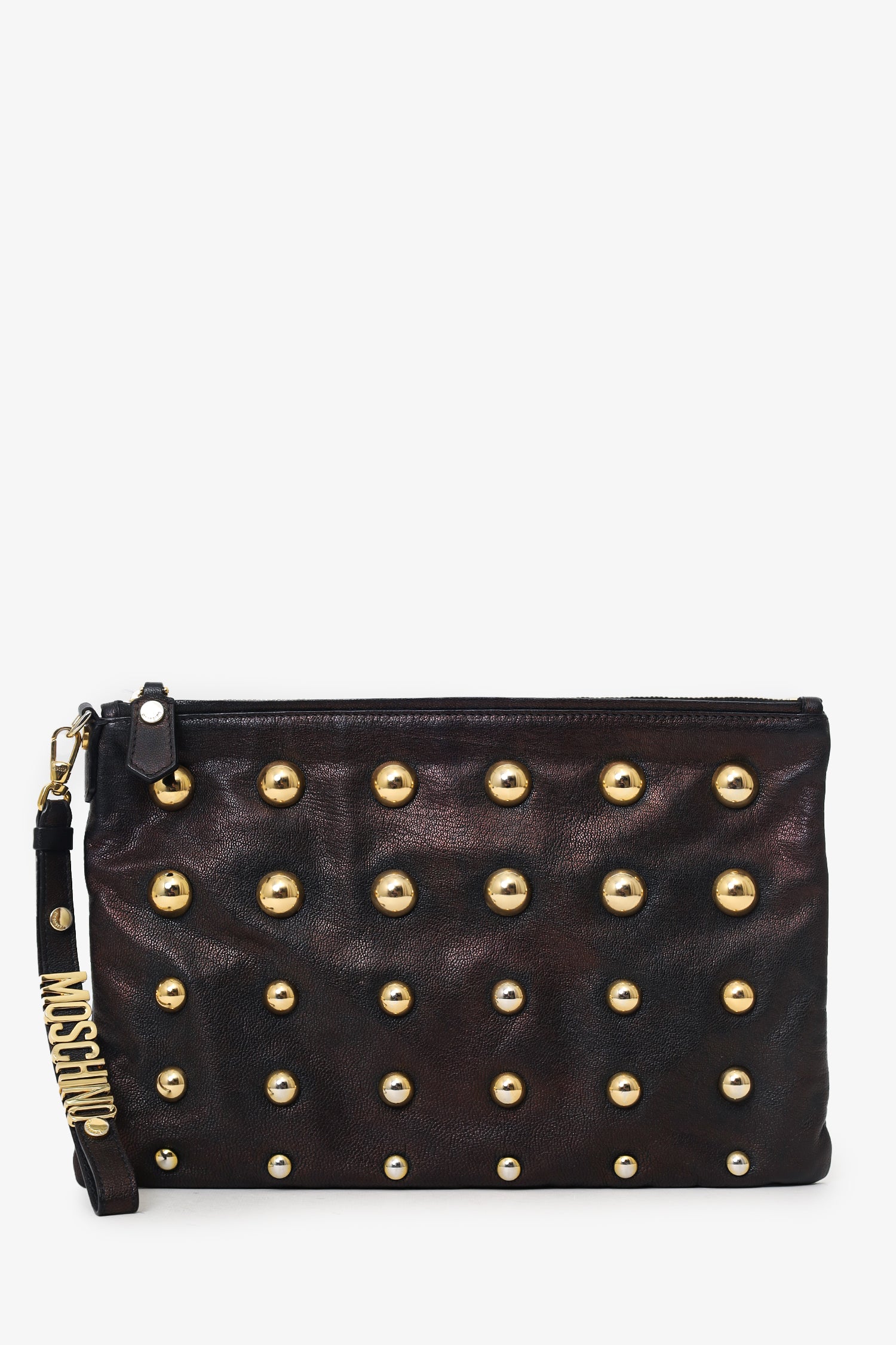 Refresh availabilityMoschino Brown Metallic Studded Clutch. Top zip closure. Removable logo keychain/handle with lobster clasp closure. Lined interior. Single zip pocket. Gold-tone hardware. Tonal stitching.