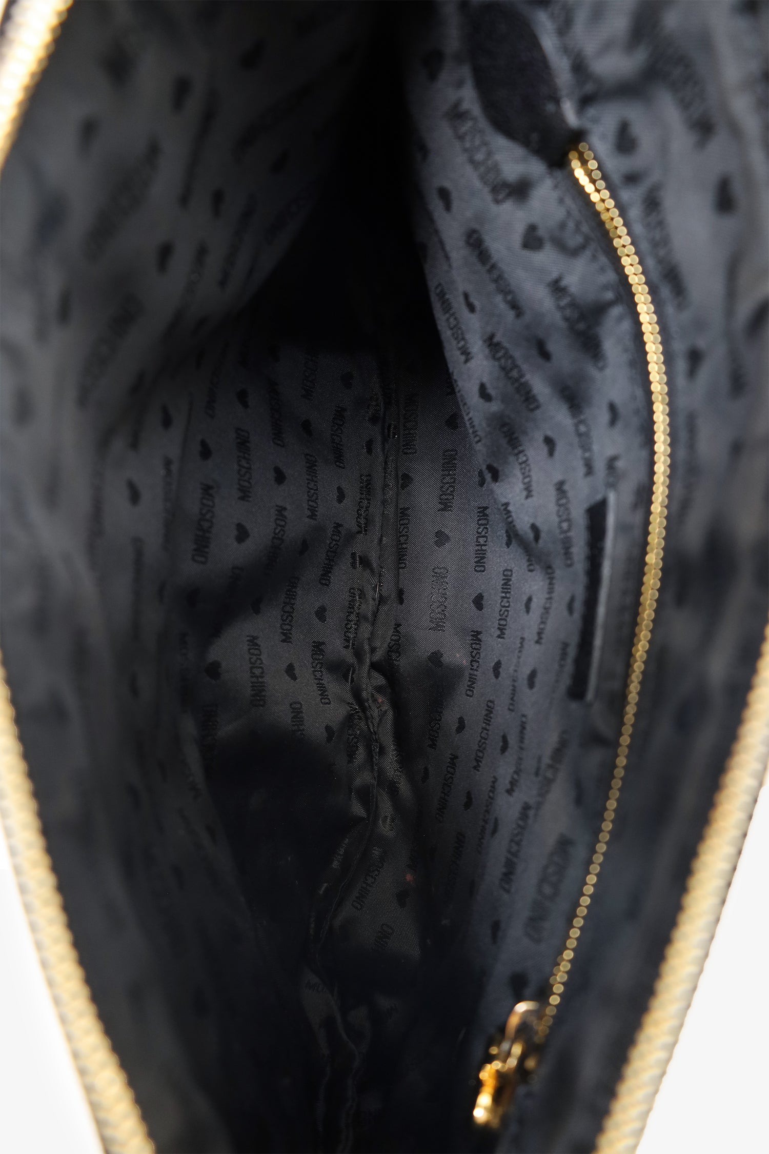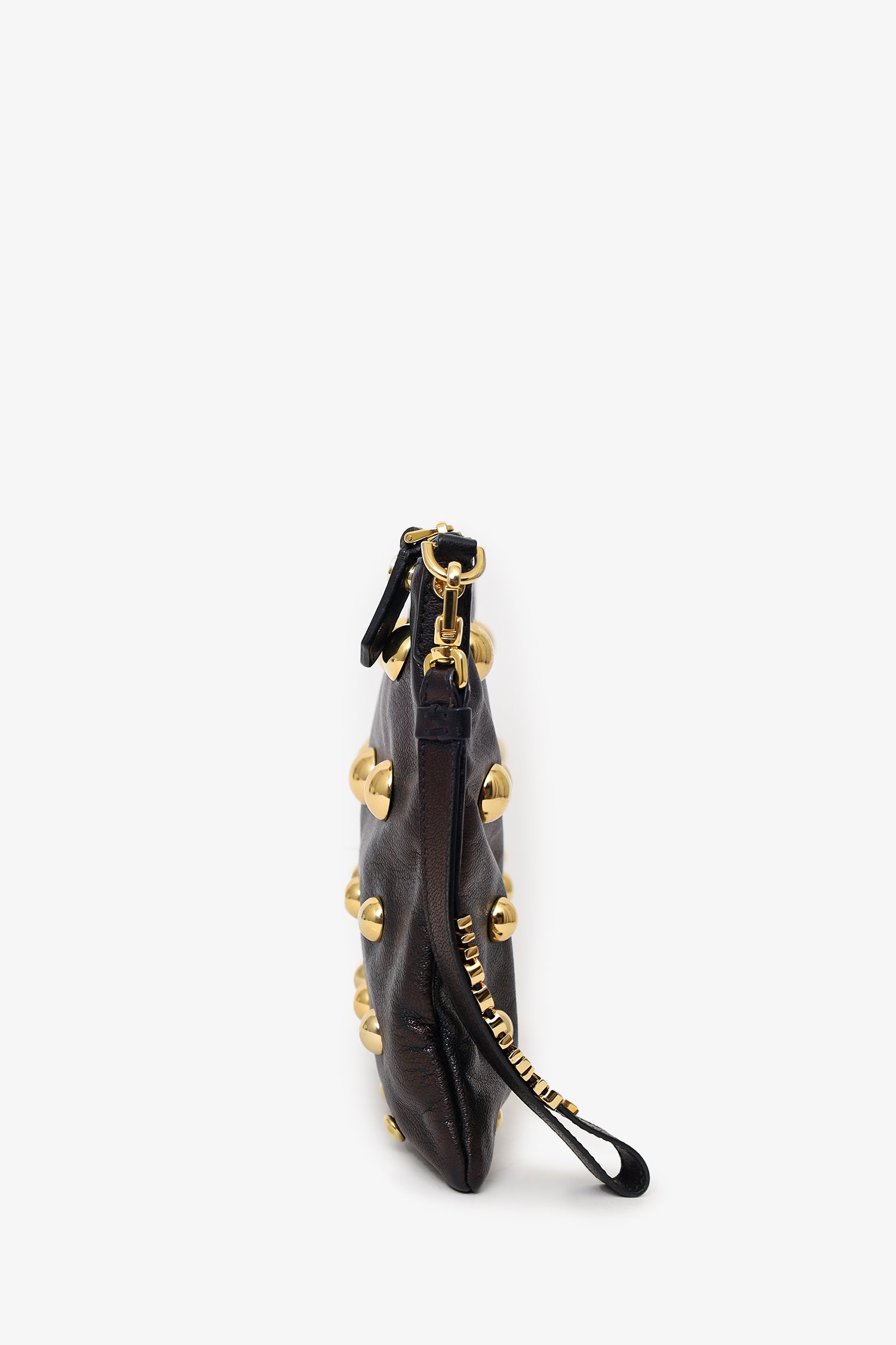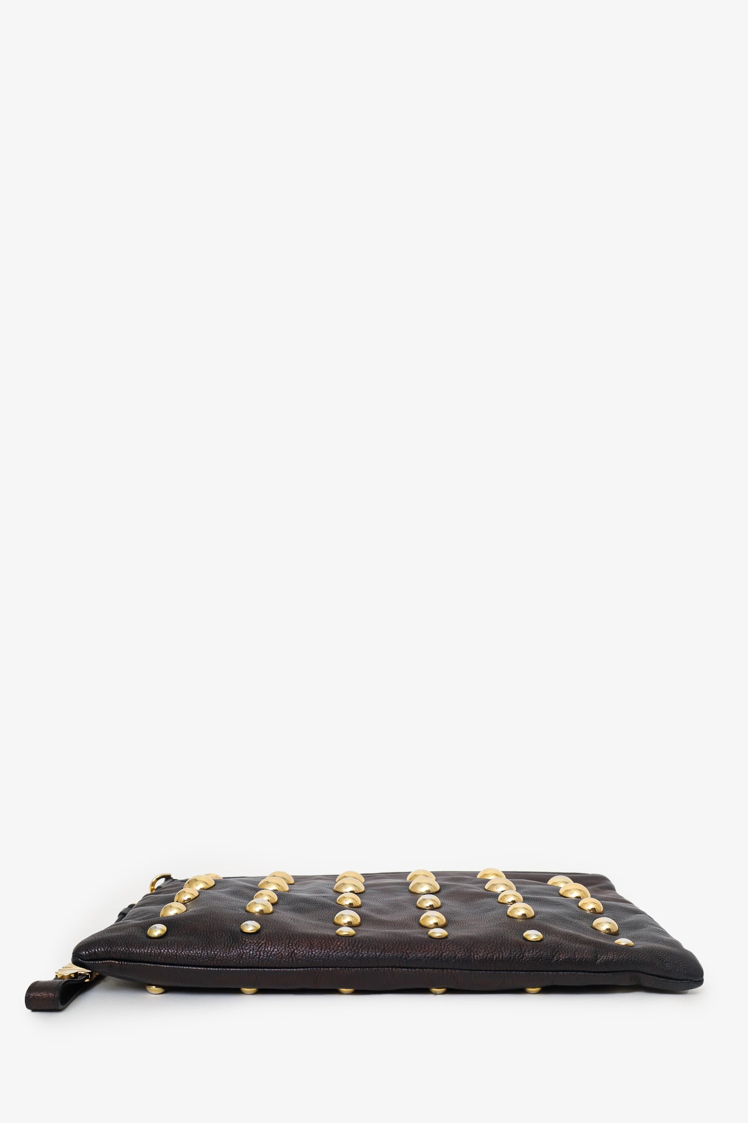 Refresh availabilityMoschino Brown Metallic Studded Clutch. Top zip closure. Removable logo keychain/handle with lobster clasp closure. Lined interior. Single zip pocket. Gold-tone hardware. Tonal stitching.