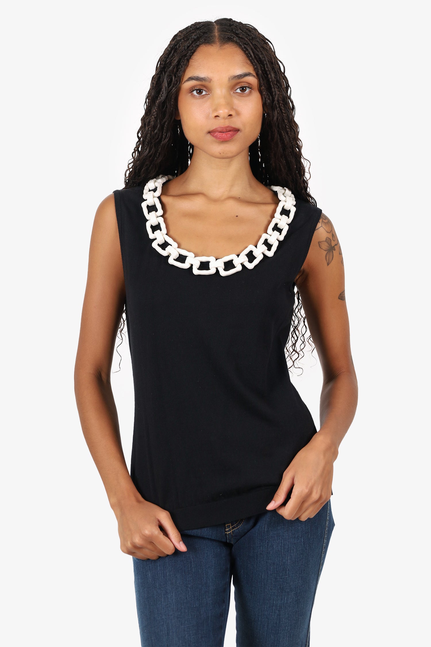Refresh availabilityMoschino Cheap and Chic Black Ribbed Chain Collar Detail Sleeveless Top. Pull-on. Round neckline. Tonal stitching.