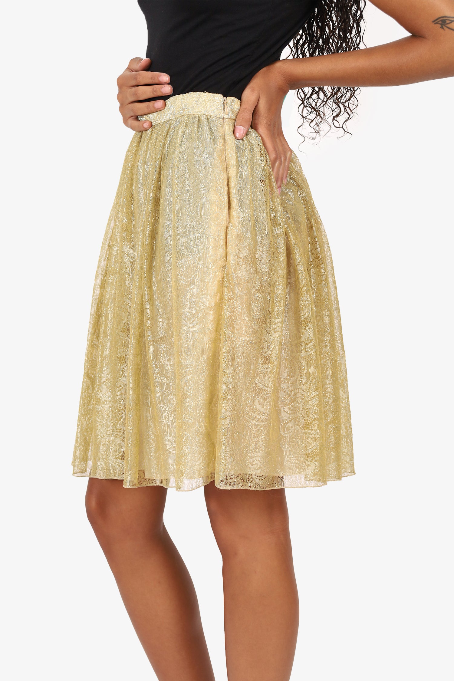 Refresh availabilityMoschino Cheap and Chic Gold Metallic Lace Midi Skirt. Slip-on. Side zip closure. Lined interior. Tonal stitching.