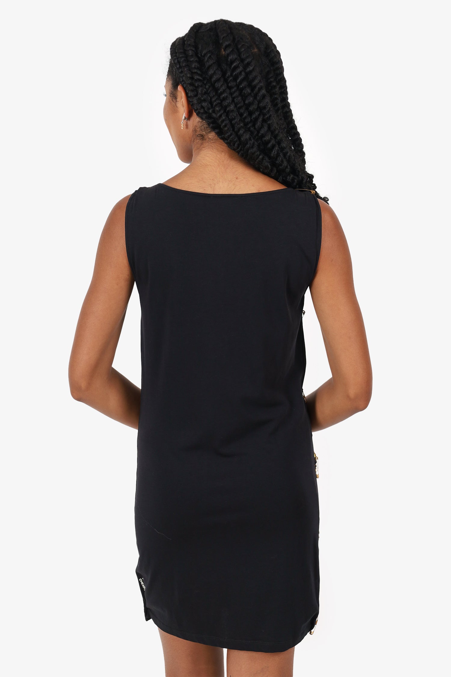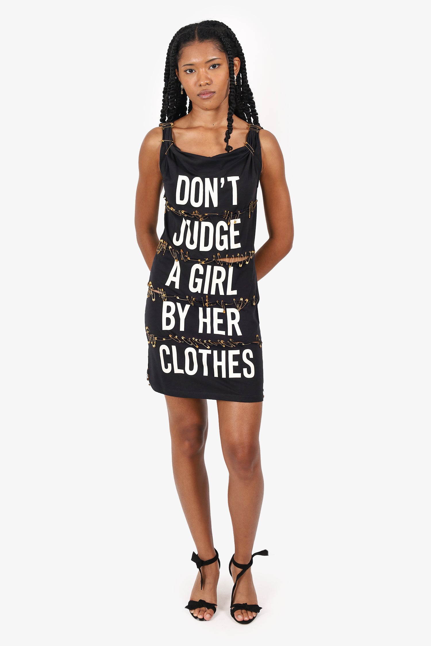 Refresh availabilityMoschino Cheap & Chic 'Don't Judge A Girl By Her Clothes' Paperclip Top. Pull-on. Round neckline. Distressing throughout. Embellished by safety pins. Bronze-tone hardware. Tonal stitching.