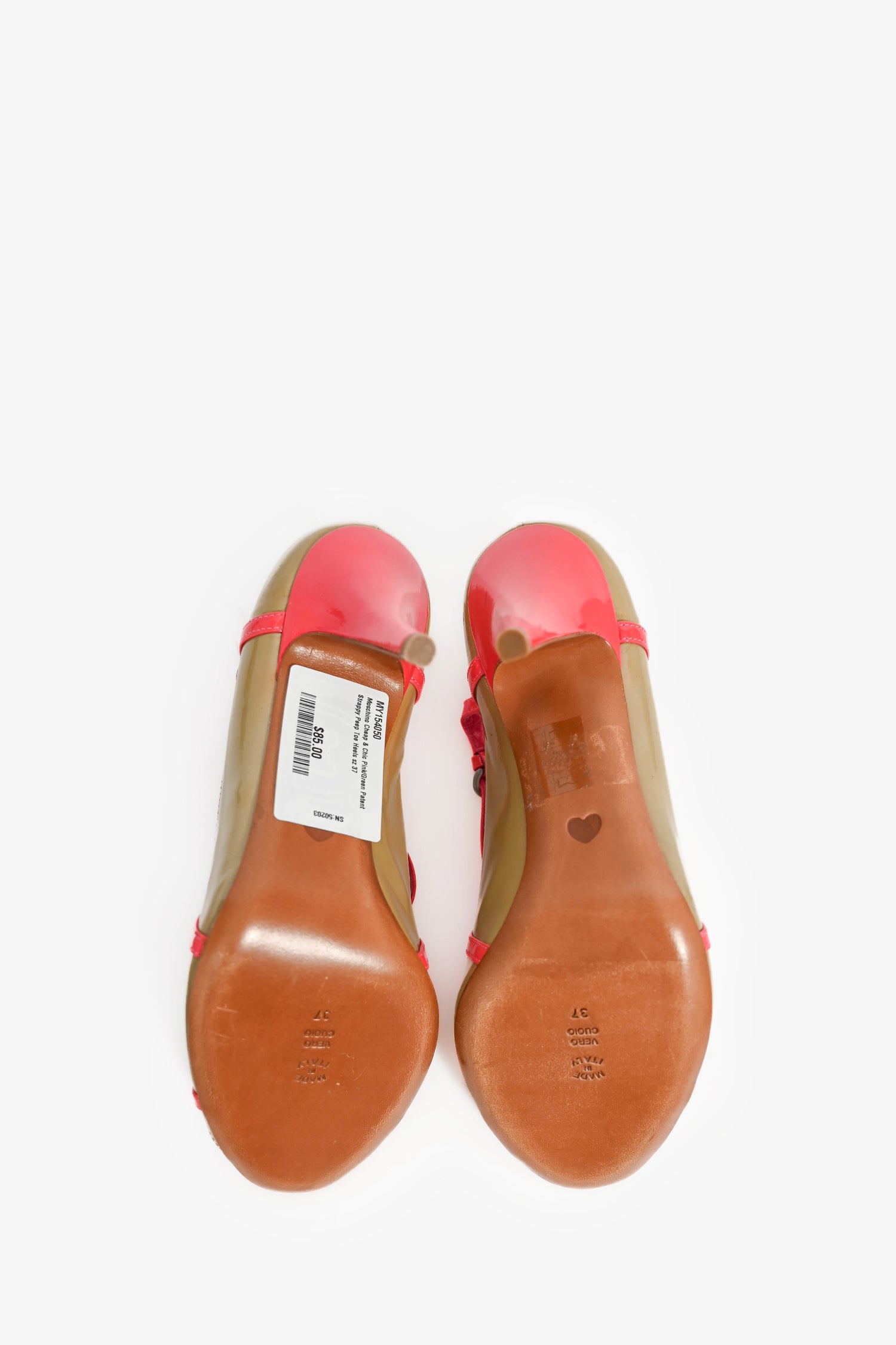Refresh availabilityMoschino Cheap & Chic Pink/Green Patent Strappy Peep Toe Heels. Leather polka-dot insoles. Double pin-buckles. Tonal stitching.