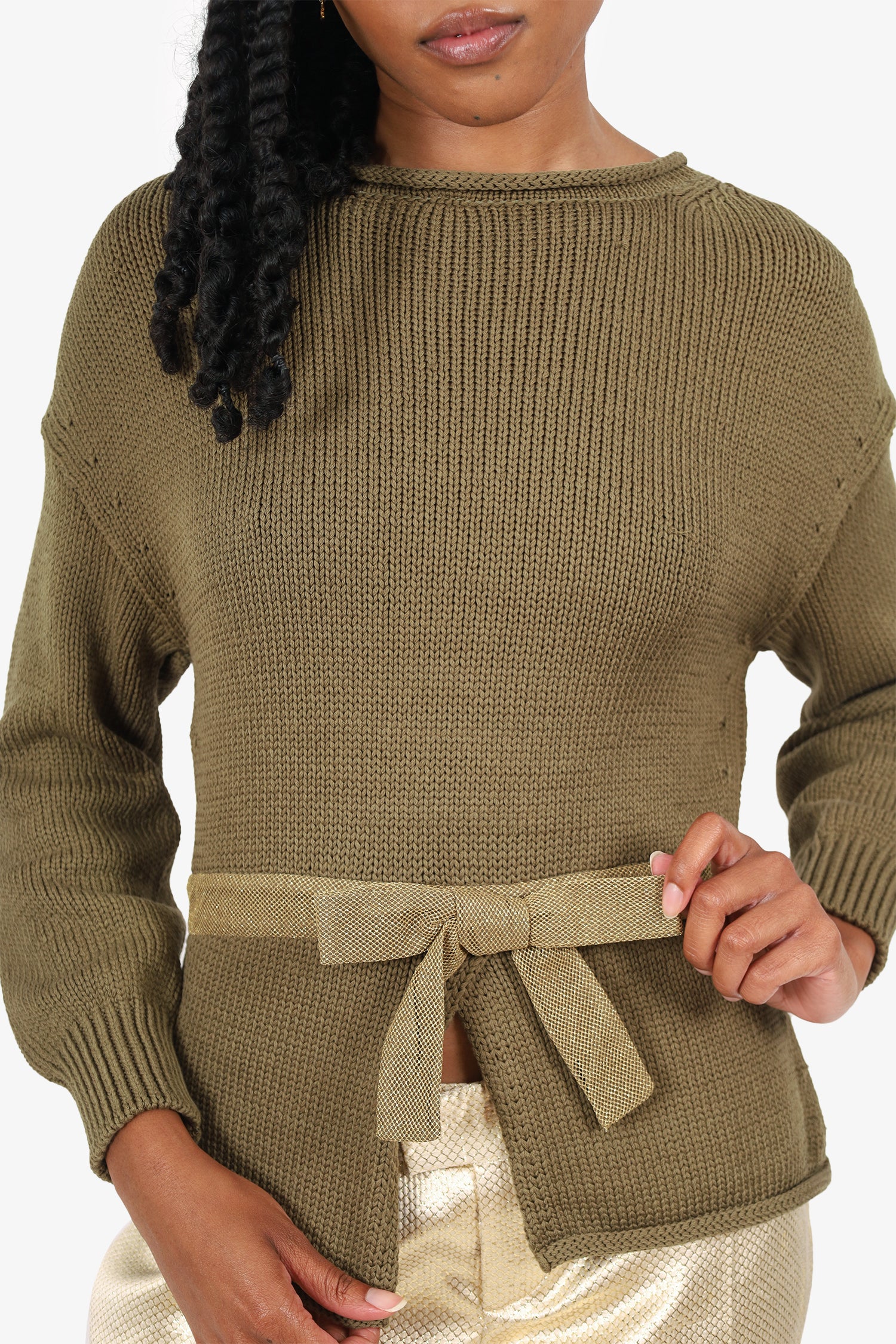 Refresh availabilityMoschino Green Cotton Knit Zip-Up Bow Sweater. Pull-on. Round neckline. Rear zip closure. Front bow detail. Gold-tone hardware. Tonal stitching.