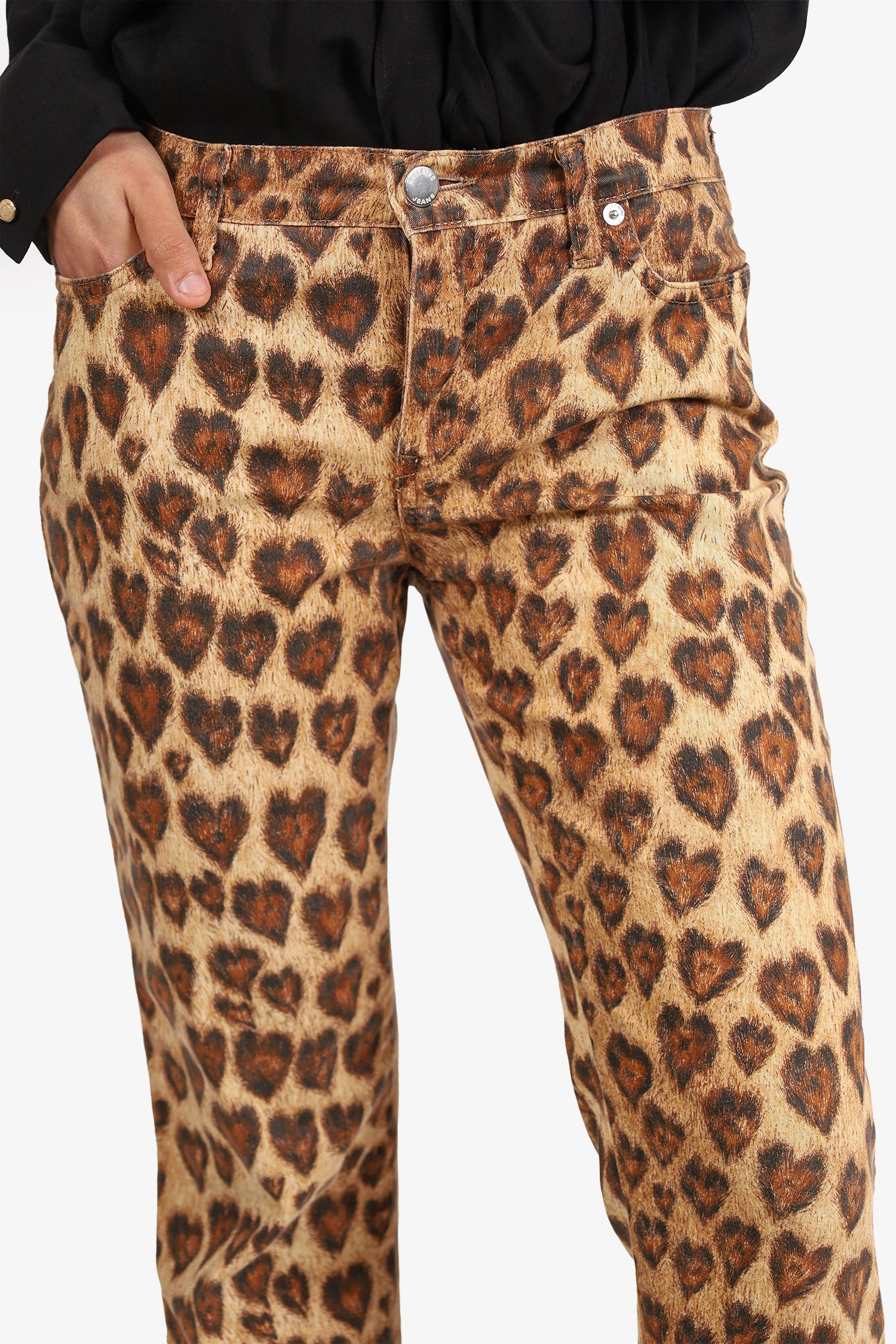 Refresh availabilityMoschino Jeans Leopard Print High Waisted Pants. Slip-on. Front zip with button closure. Waistband belt loops. 5 exterior pockets; 2 front side slip and 1 mini compartment, 2 rear slip. Silver-tone hardware. Tonal stitching.