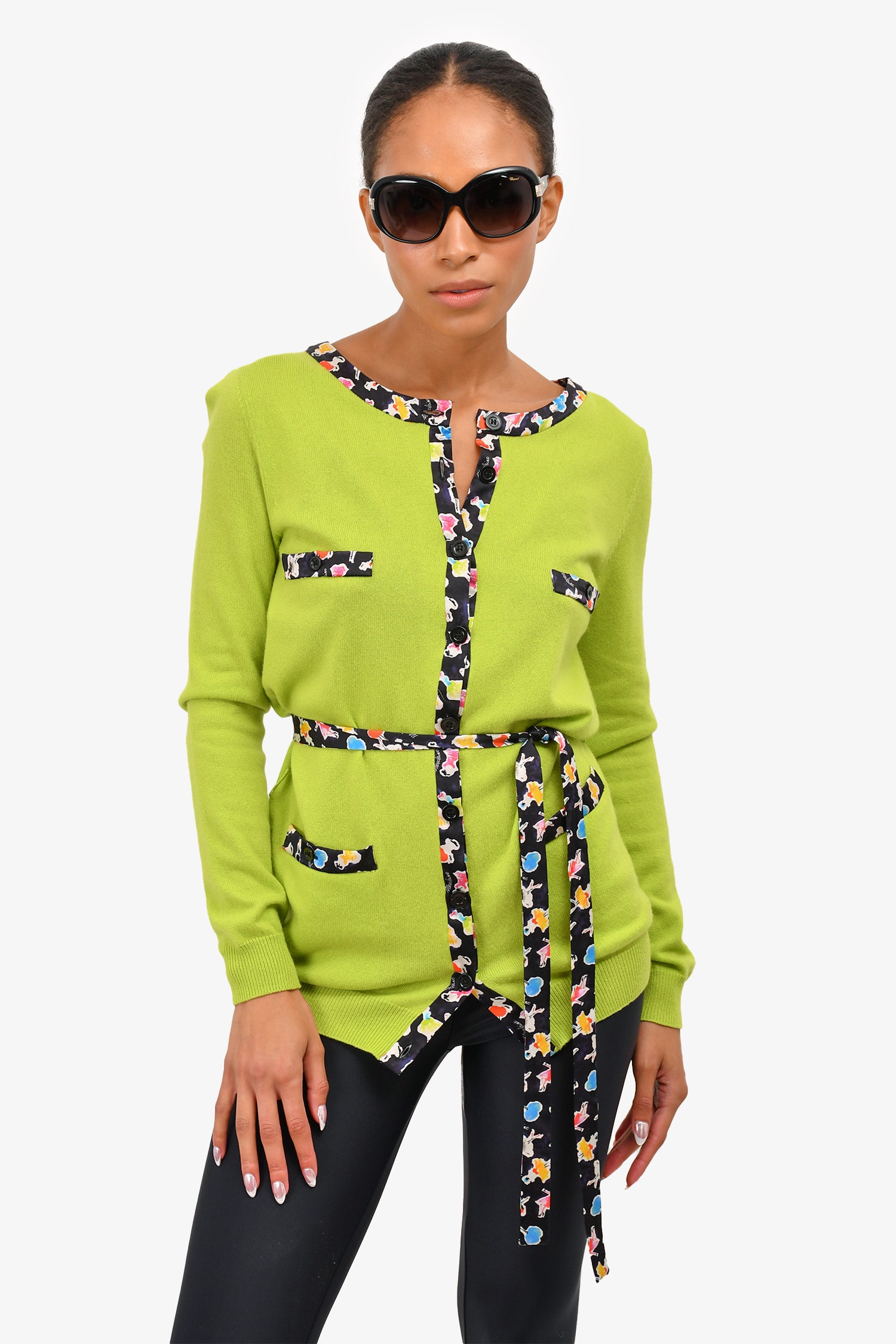 Refresh availabilityMoschino Lime Green Silk Belted Cardigan. Front button-up closure. V-neck. Front pockets.