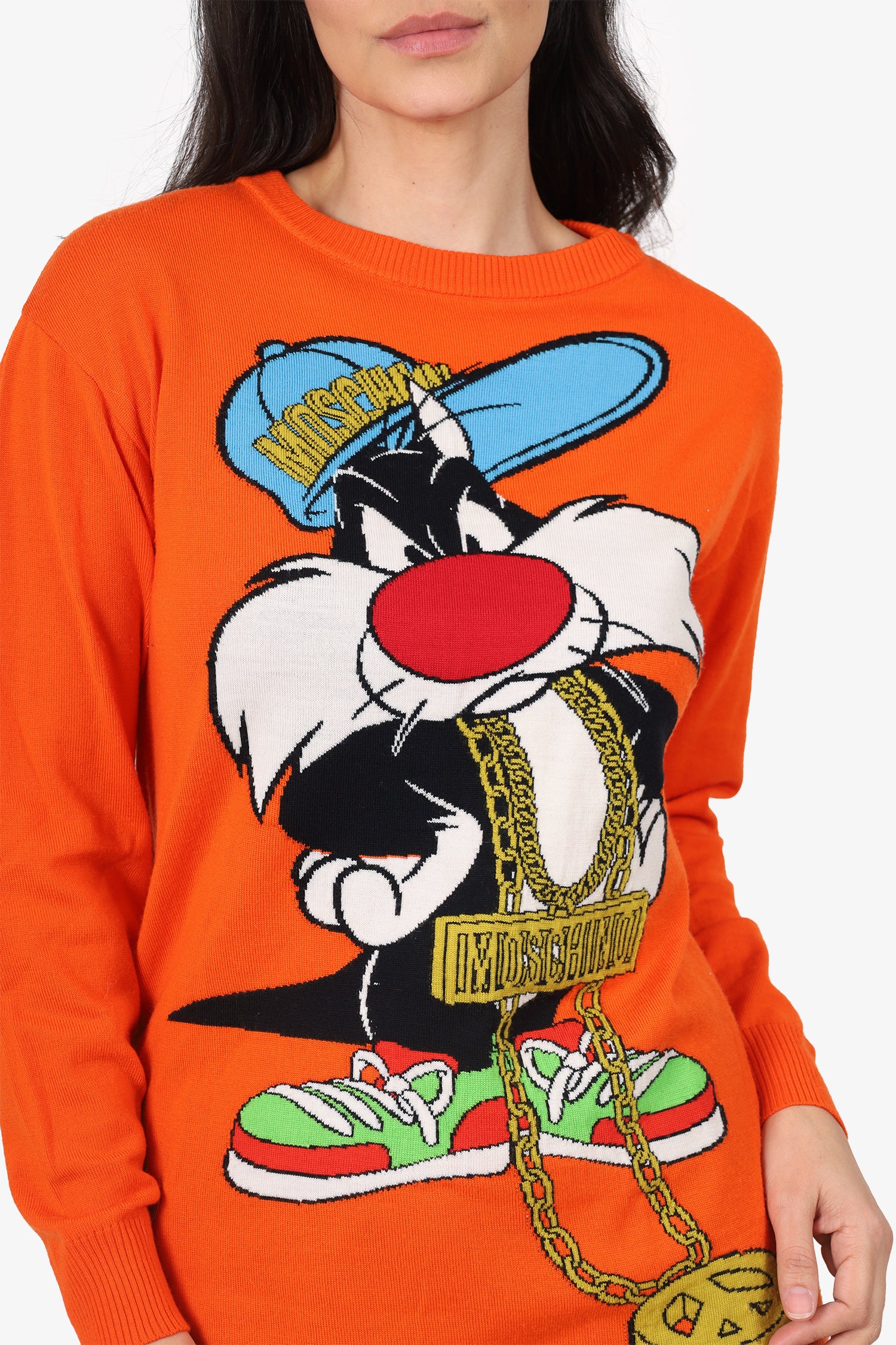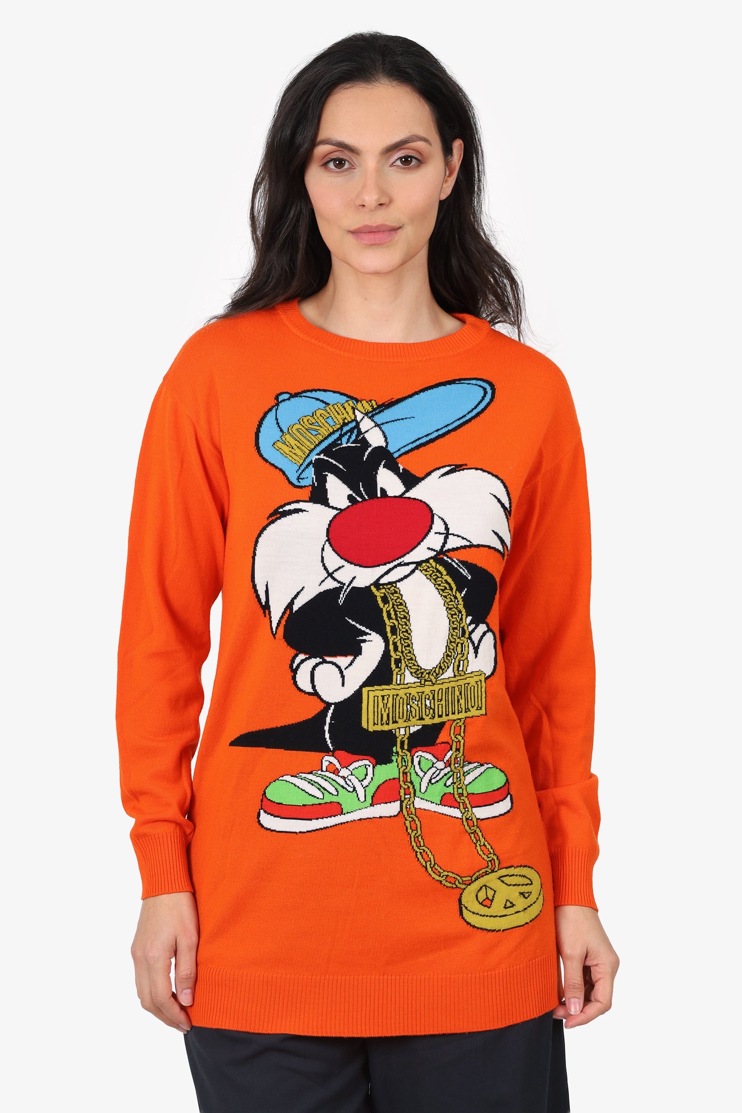 Refresh availabilityMoschino Orange Looney Tunes Knit Sweater. Pull-on. Round neckline. Front and rear graphic. Tonal stitching.