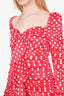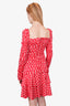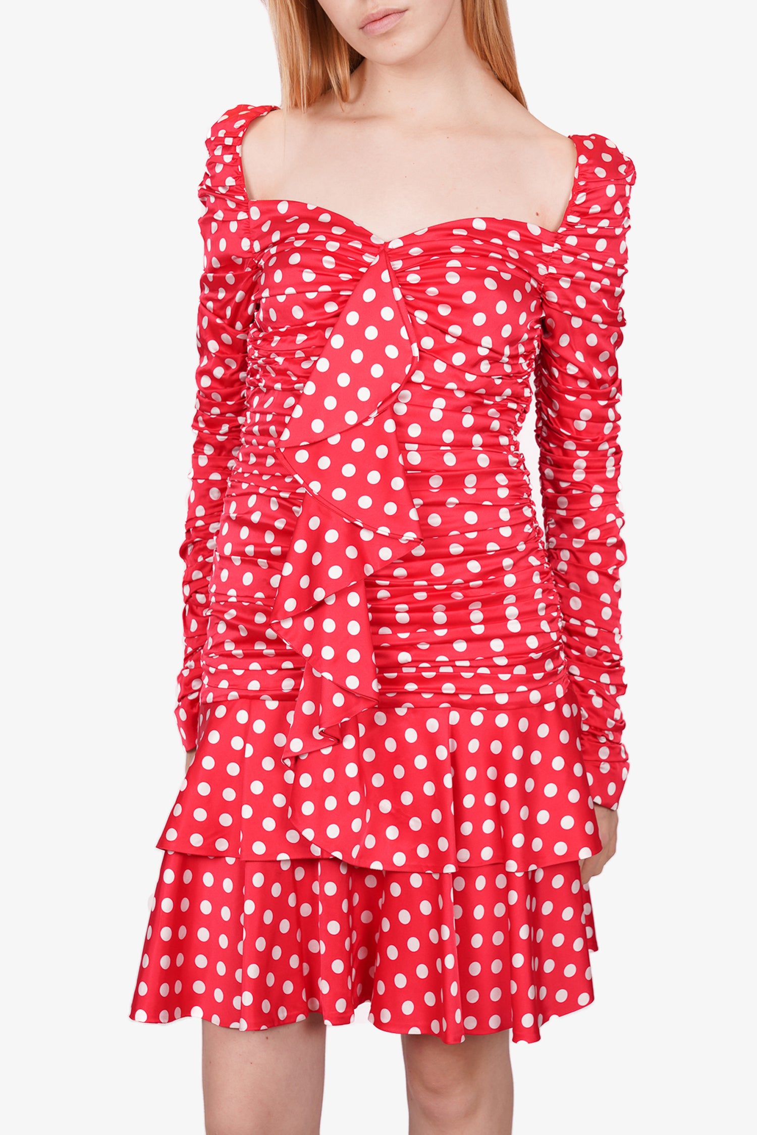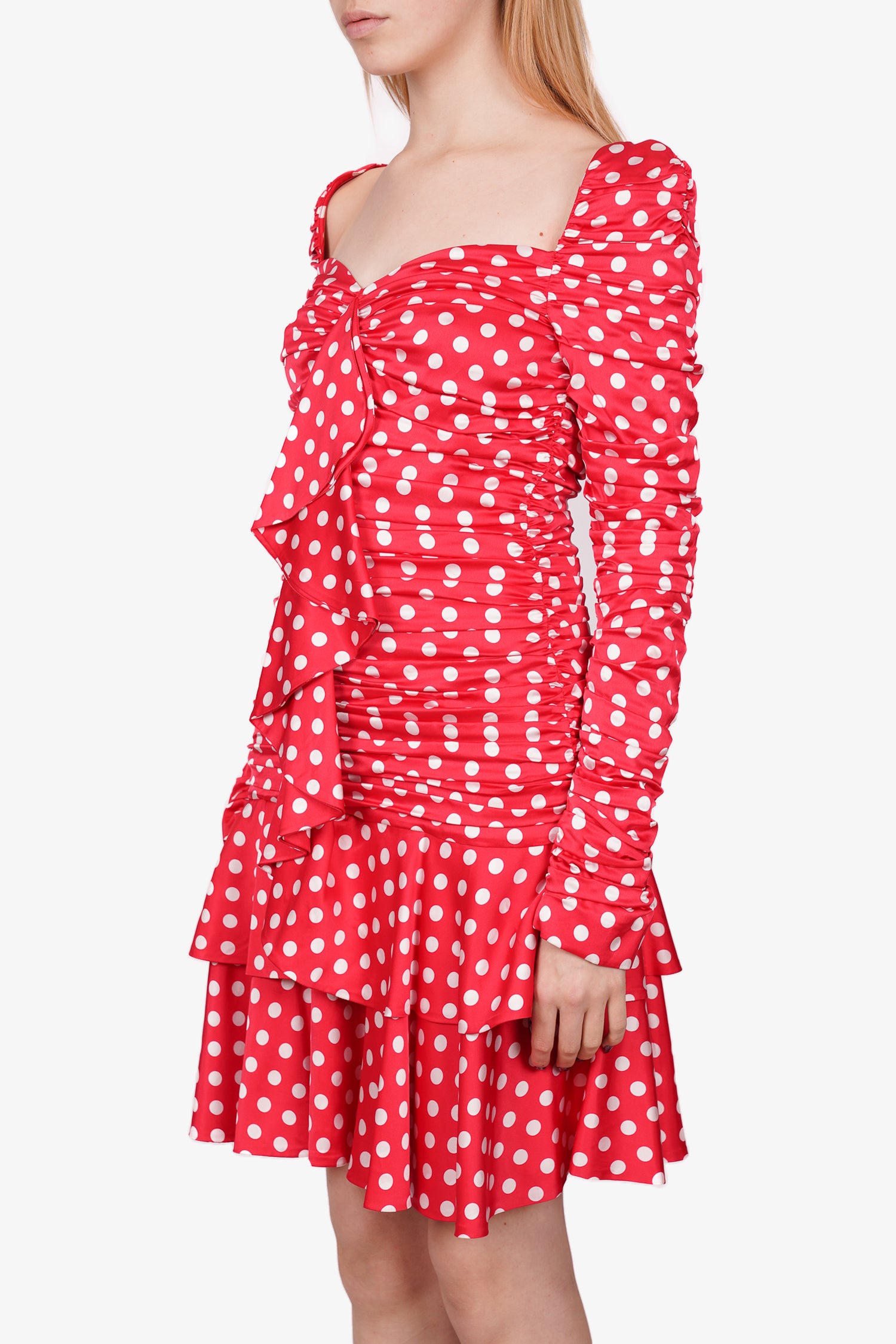 Refresh availabilityMoschino Red Polka Dot Ruched Dress. Florentine neckline. Back zip-up and buckle closure. Interior lining. Tonal stitching.