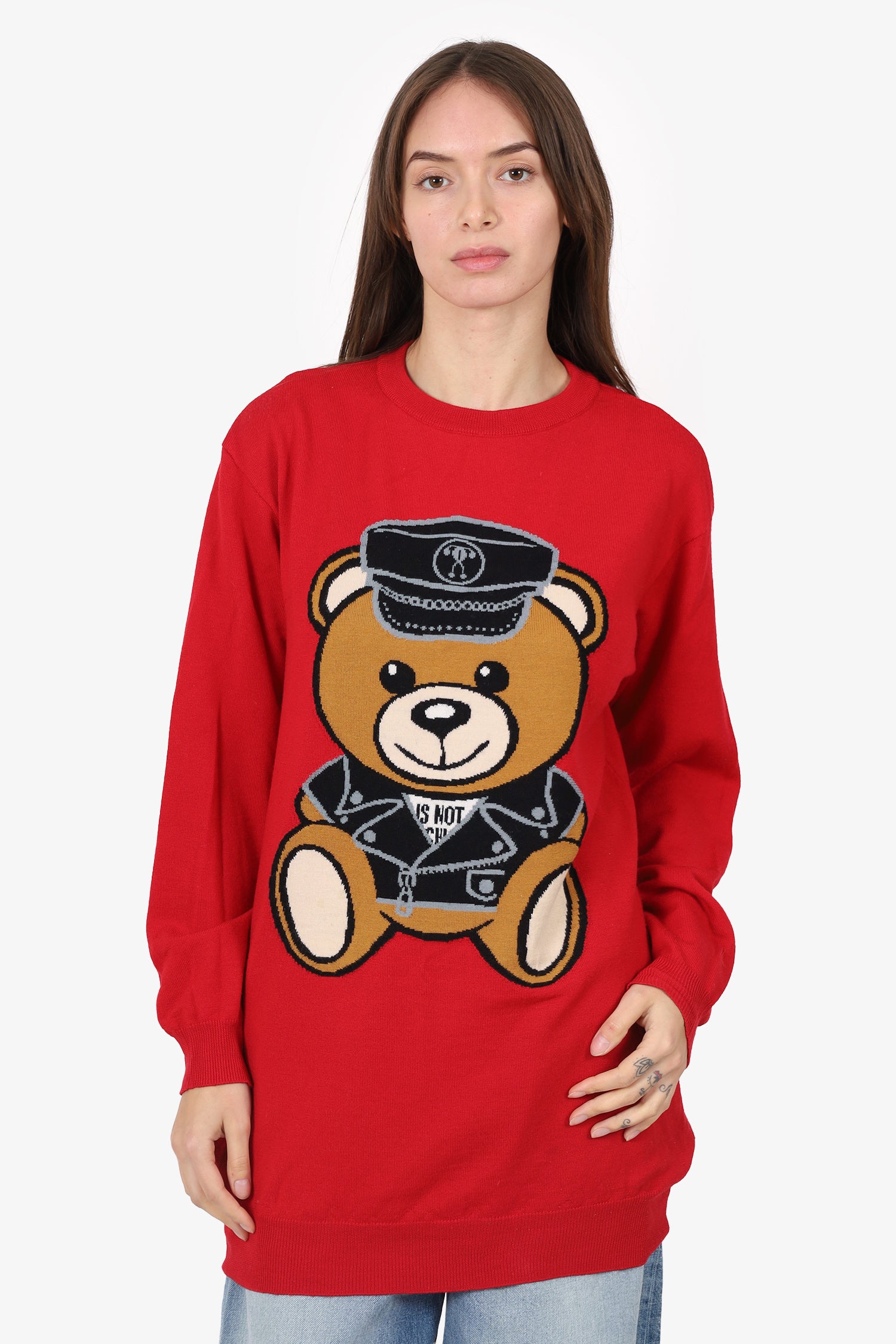 Refresh availabilityMoschino Red Teddy Bear Knit Sweater. Pull-on. Round neckline. Tonal stitching.