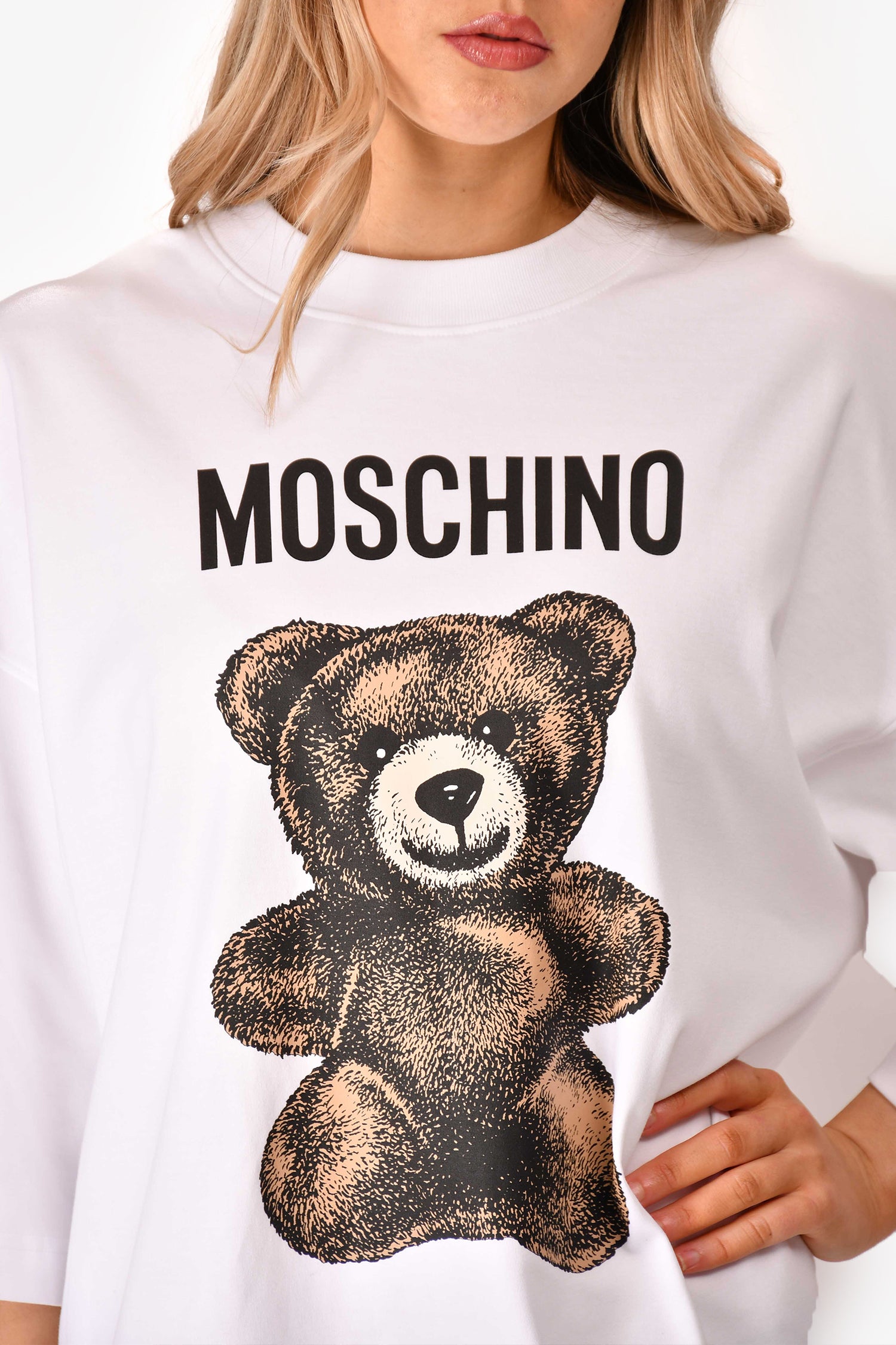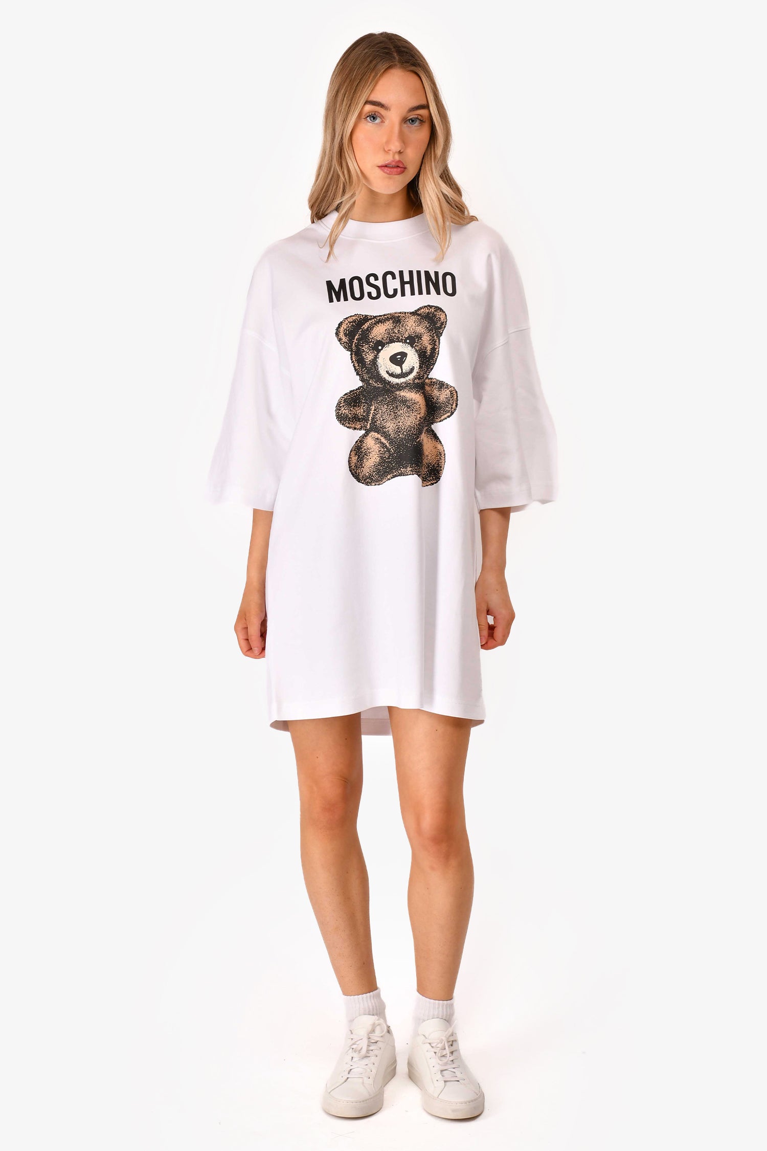 Refresh availabilityMoschino White Cotton Oversized Interlock Teddy Bear Mini Dress. Round neck. Pull-on. Unlined. Tonal stitching.