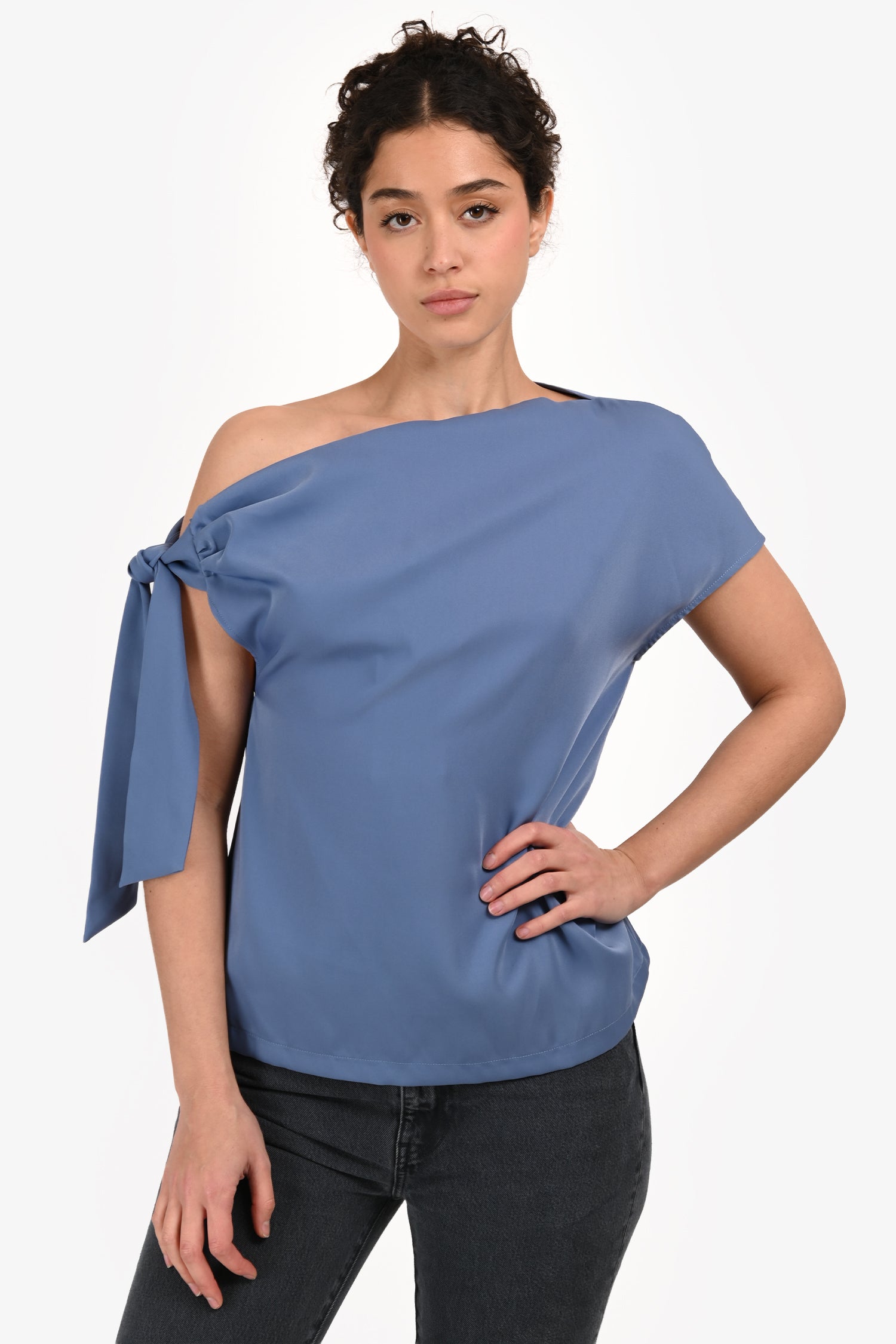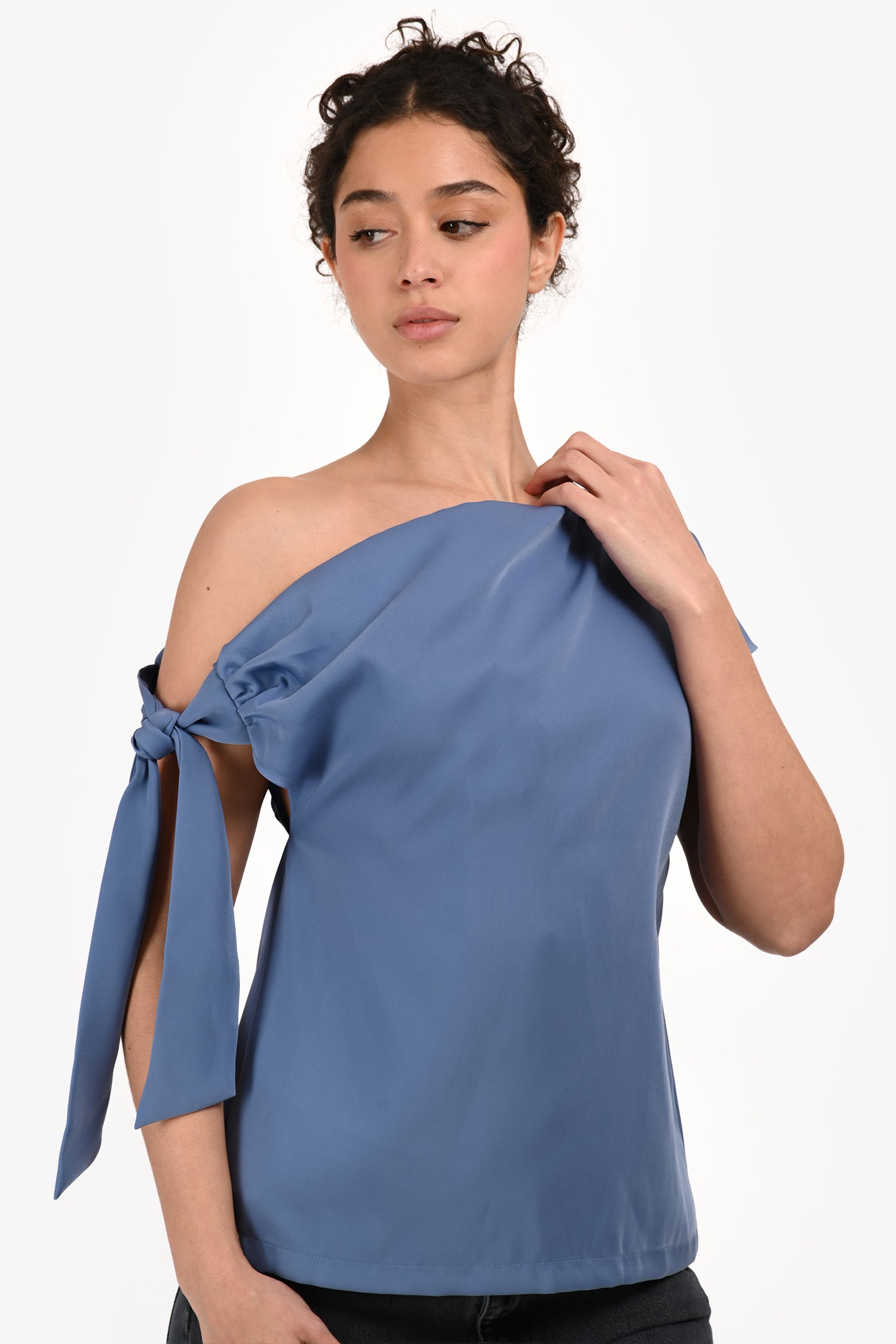 Refresh availabilityMossman Blue Satin 'Drop Off' Cold Shoulder Tie Top. Slip-on. Off-shoulder neckline. Tonal stitching.