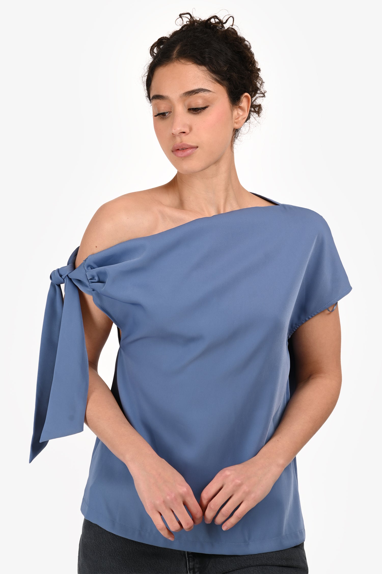 Refresh availabilityMossman Blue Satin 'Drop Off' Cold Shoulder Tie Top. Pull-on. Tonal stitching.