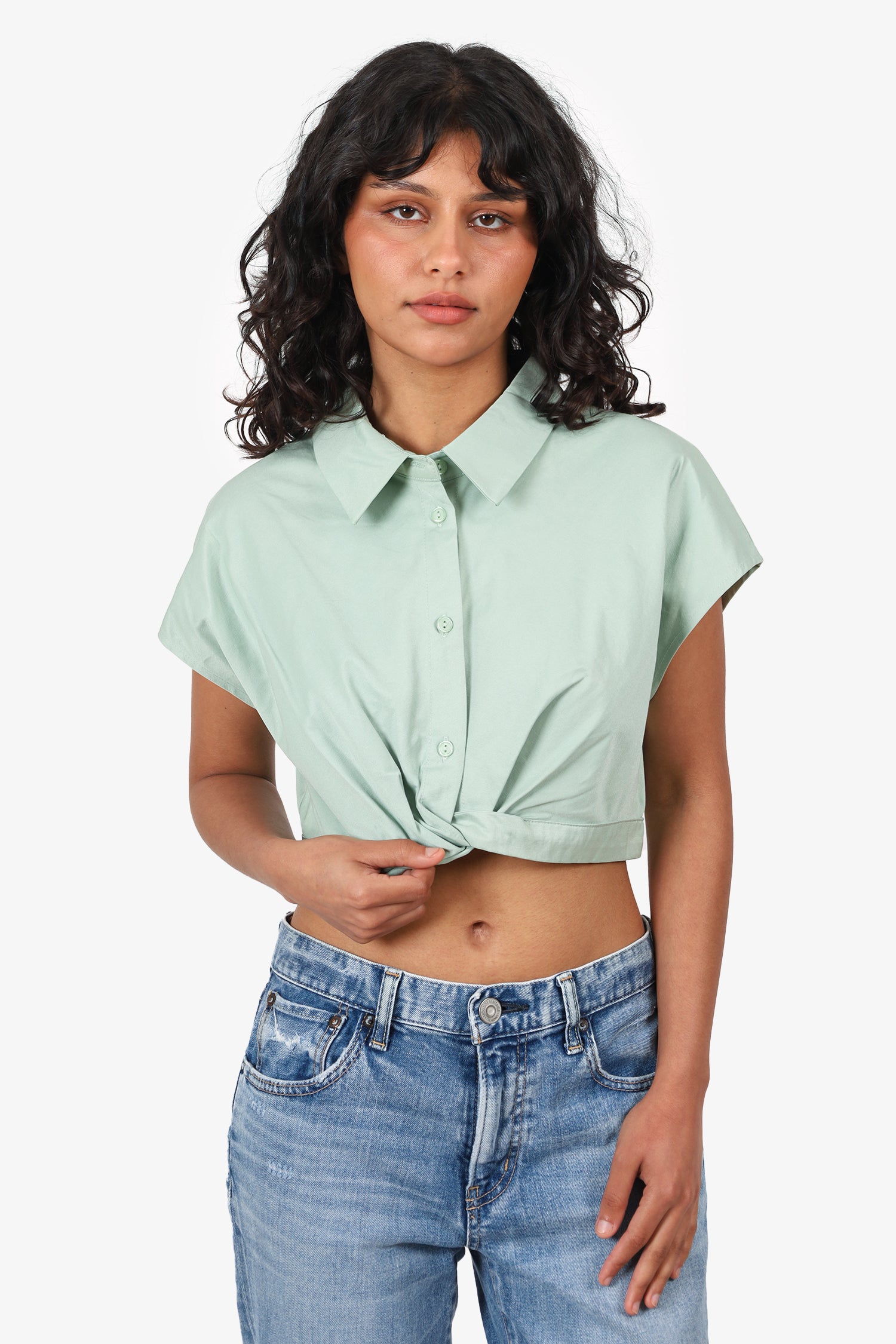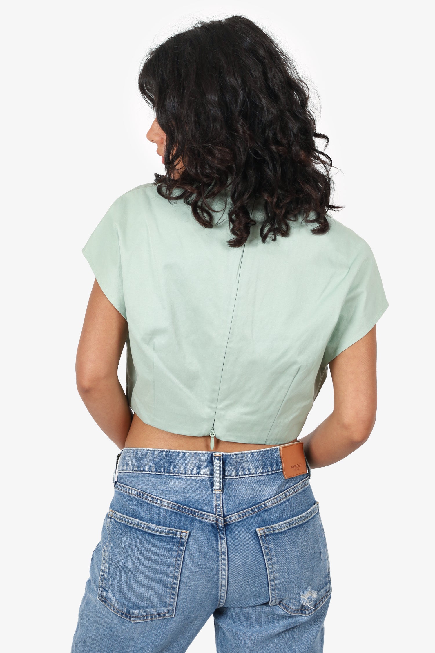 Refresh availabilityMossman Green Cotton 'Wanderlust' Crop Top. Pull-on. Collared neckline. Front button-up closure. Rear zip closure. Tonal stitching.