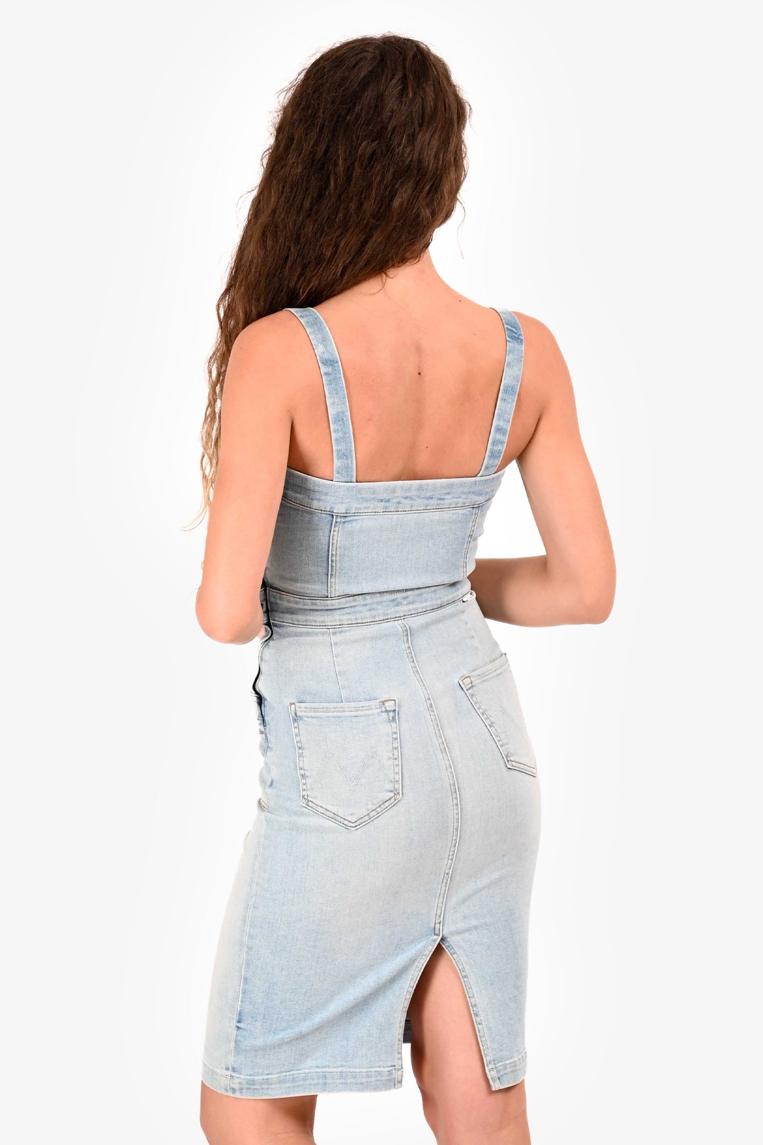 Refresh availabilityMother Blue Denim Bodycon Midi Dress. Square neckline. Side zip closure. Front and back slip pockets. Tonal stitching.
