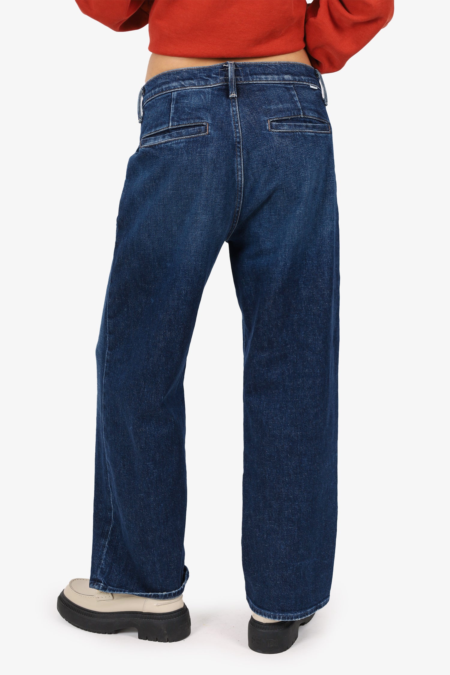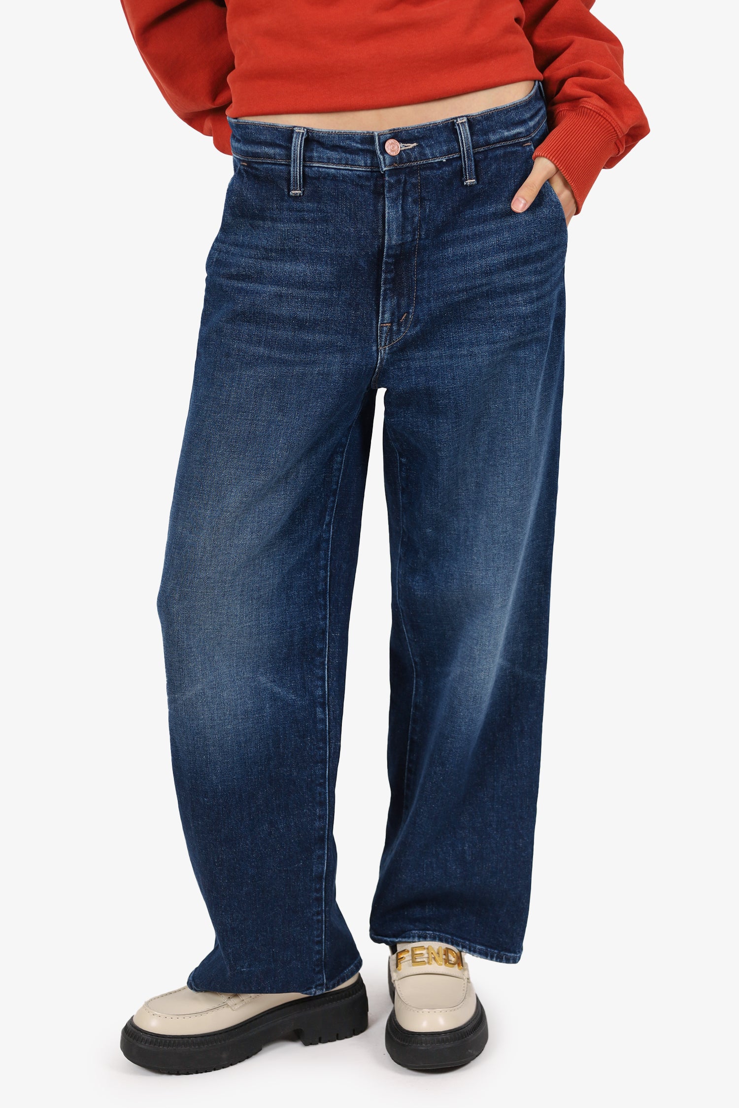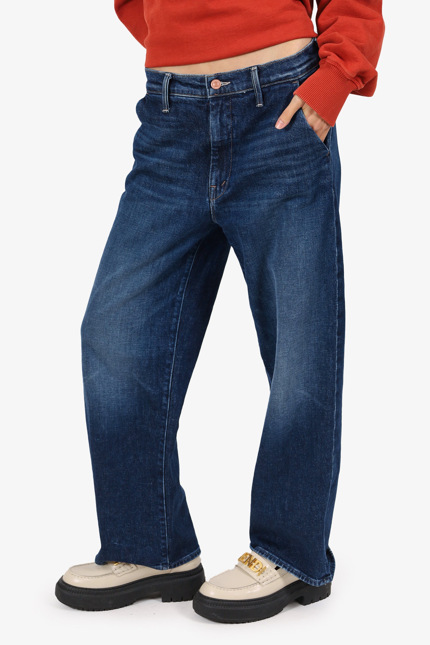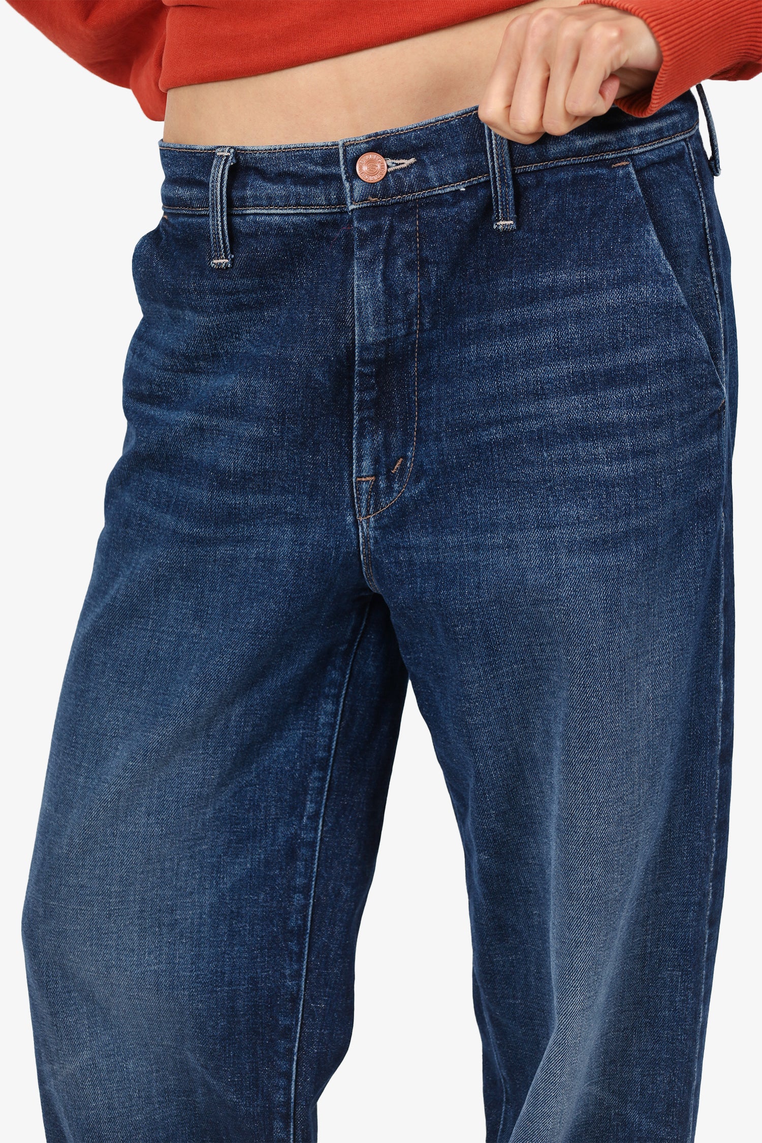 Refresh availabilityMother Blue Denim Straight Leg Jeans. Slip-on. Front zip with button closure. Waistband belt loops. 5 exterior pockets; 2 front side slip and 1 mini compartment, 2 rear slip. Bronze-tone hardware. Contrast stitching.