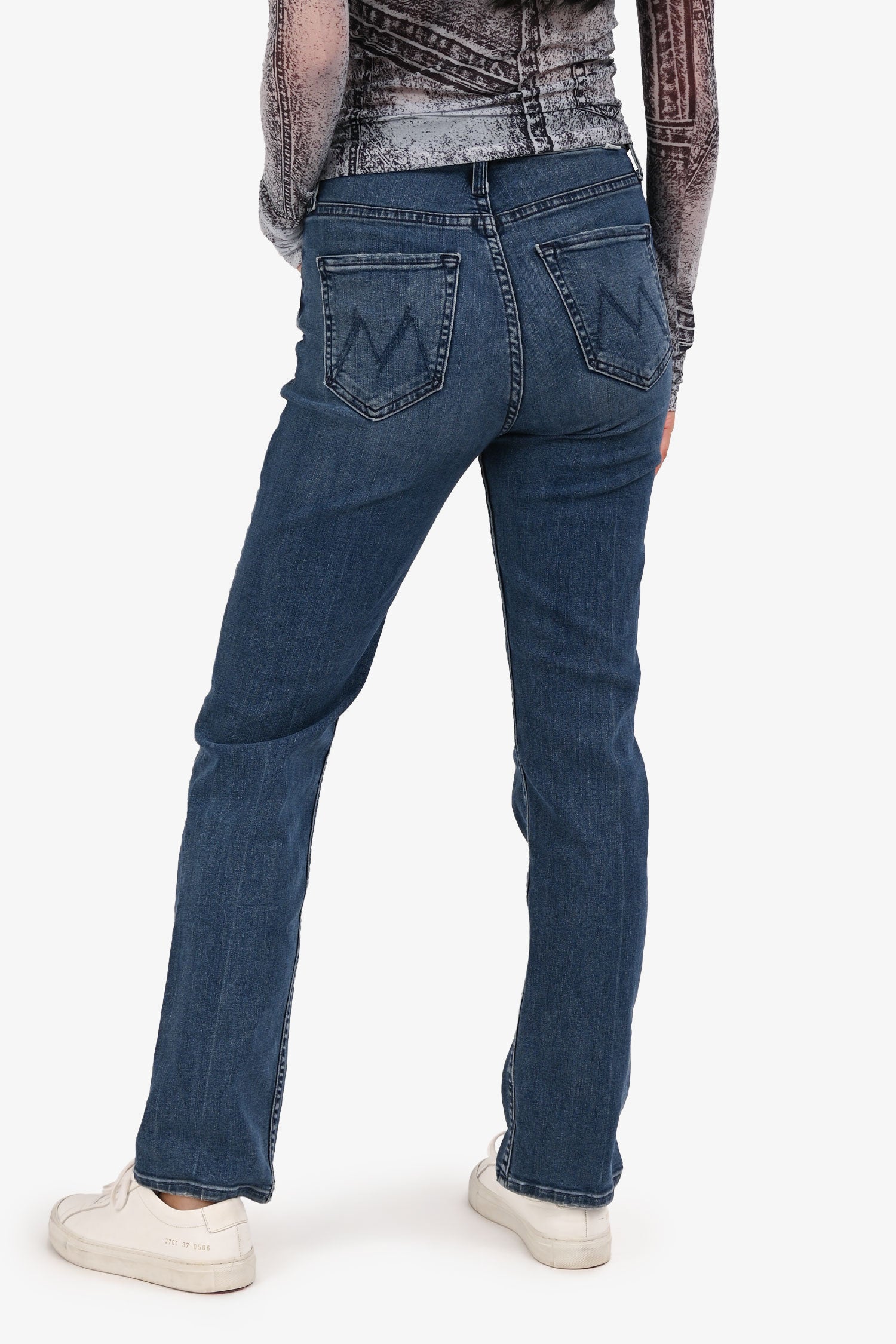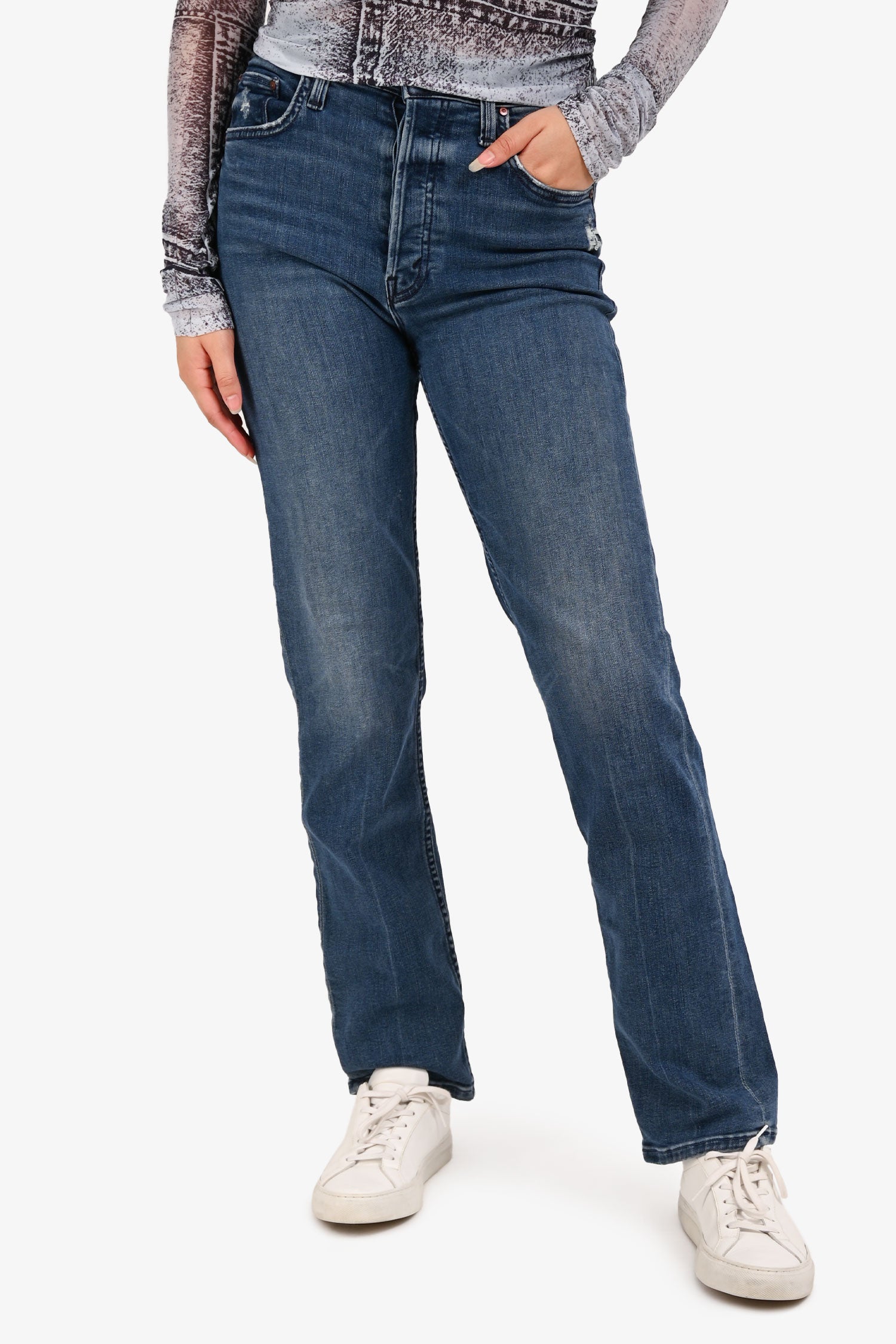 Refresh availabilityMother Blue Denim Straight Legged Jeans. Classic five-pocket style. Straight leg silhouette. Zip fly with button closure. Tonal stitching.