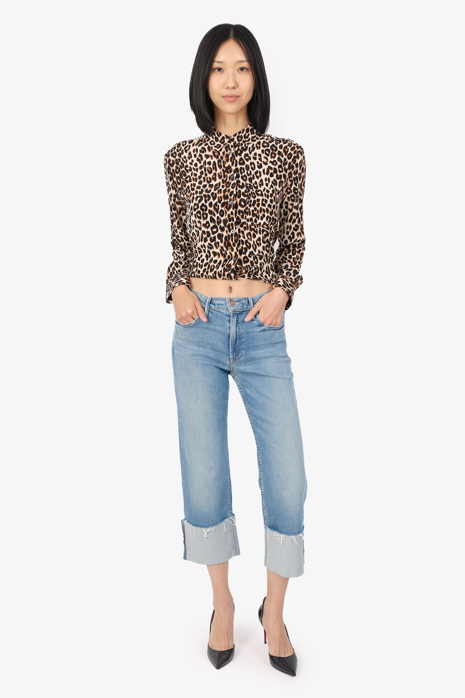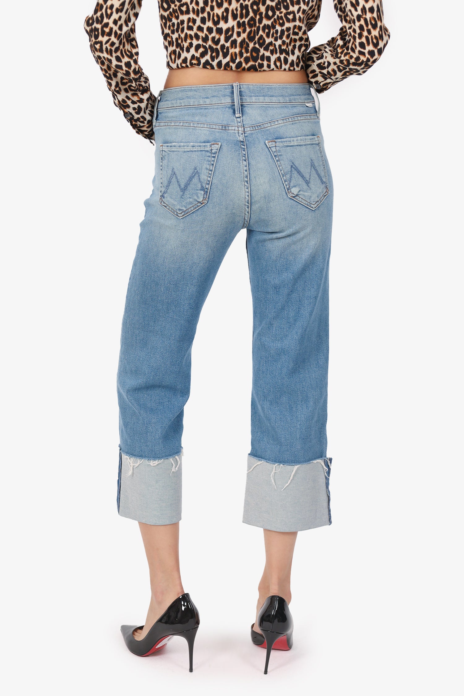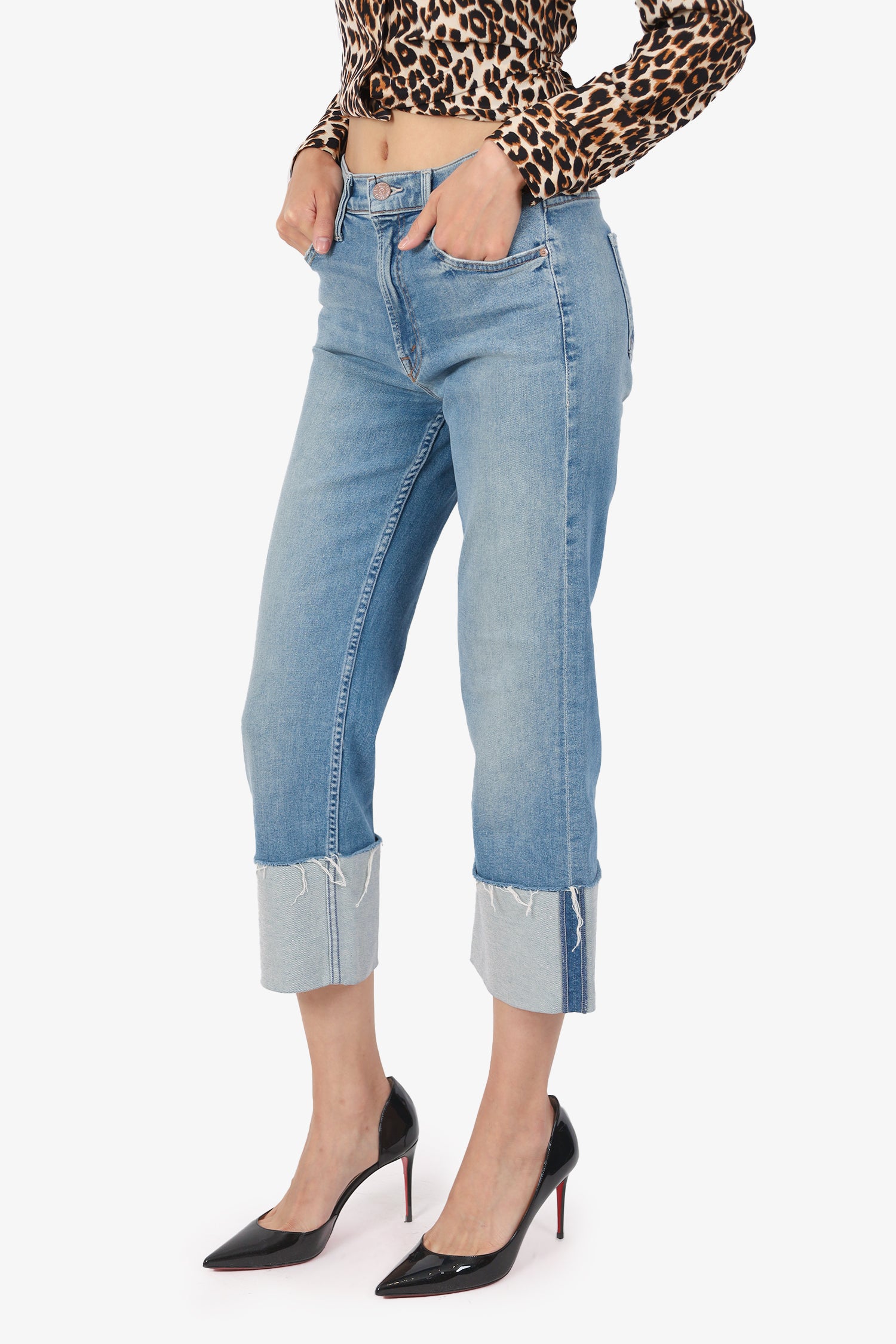 Refresh availabilityMother Blue 'Dusty Cuff Fray' Turned Up Hem Jeans. Slip on. Front zip with button-up closure. Waistband belt-loops. 5 exterior pockets; 2 front slip, 1 mini compartment, and 2 rear slip. Rose gold-tone hardware. Contrast stitching. Intentional distressing to folded pants cuffs.