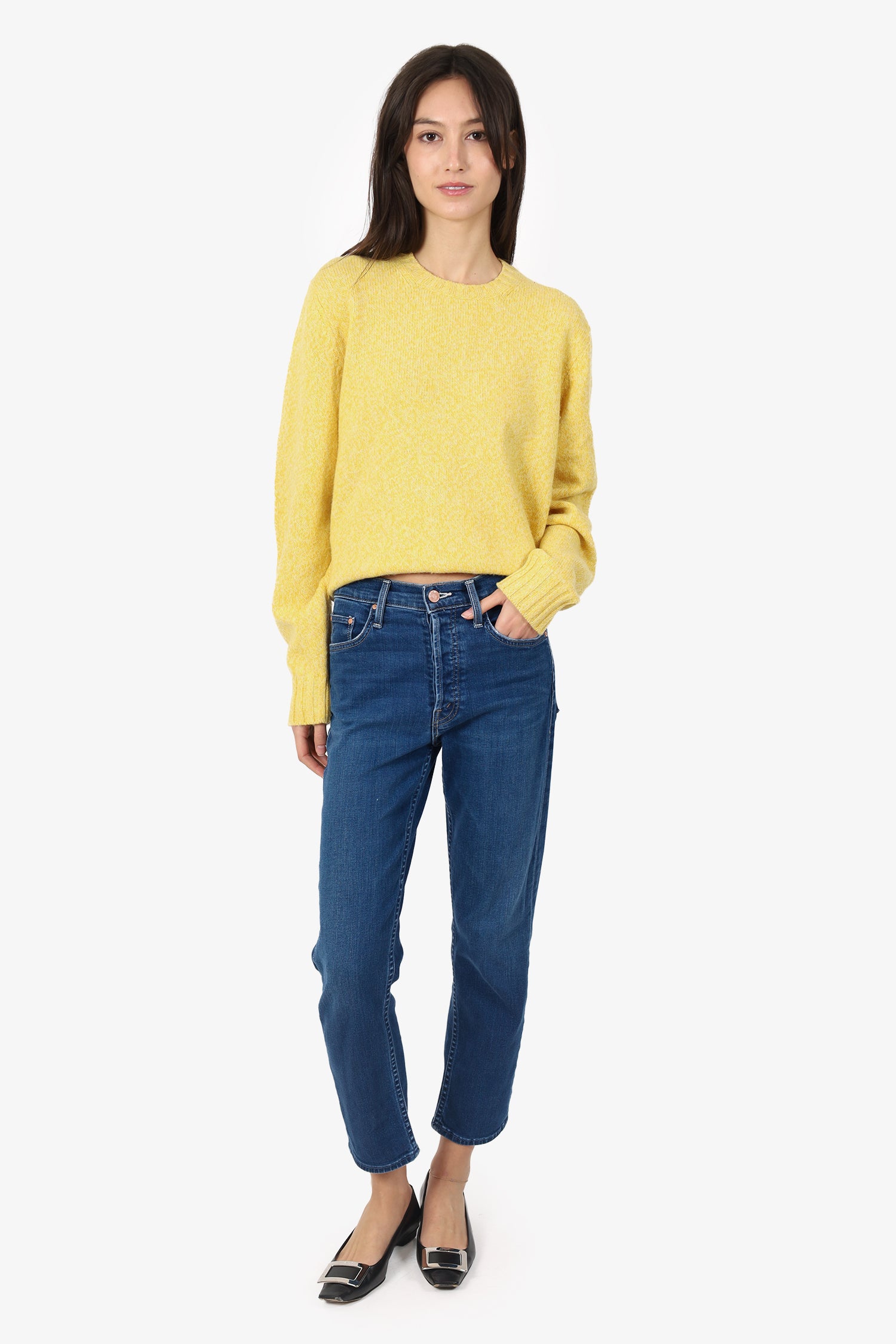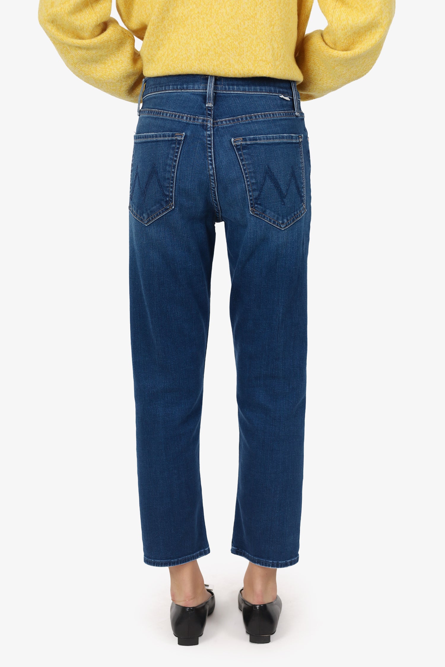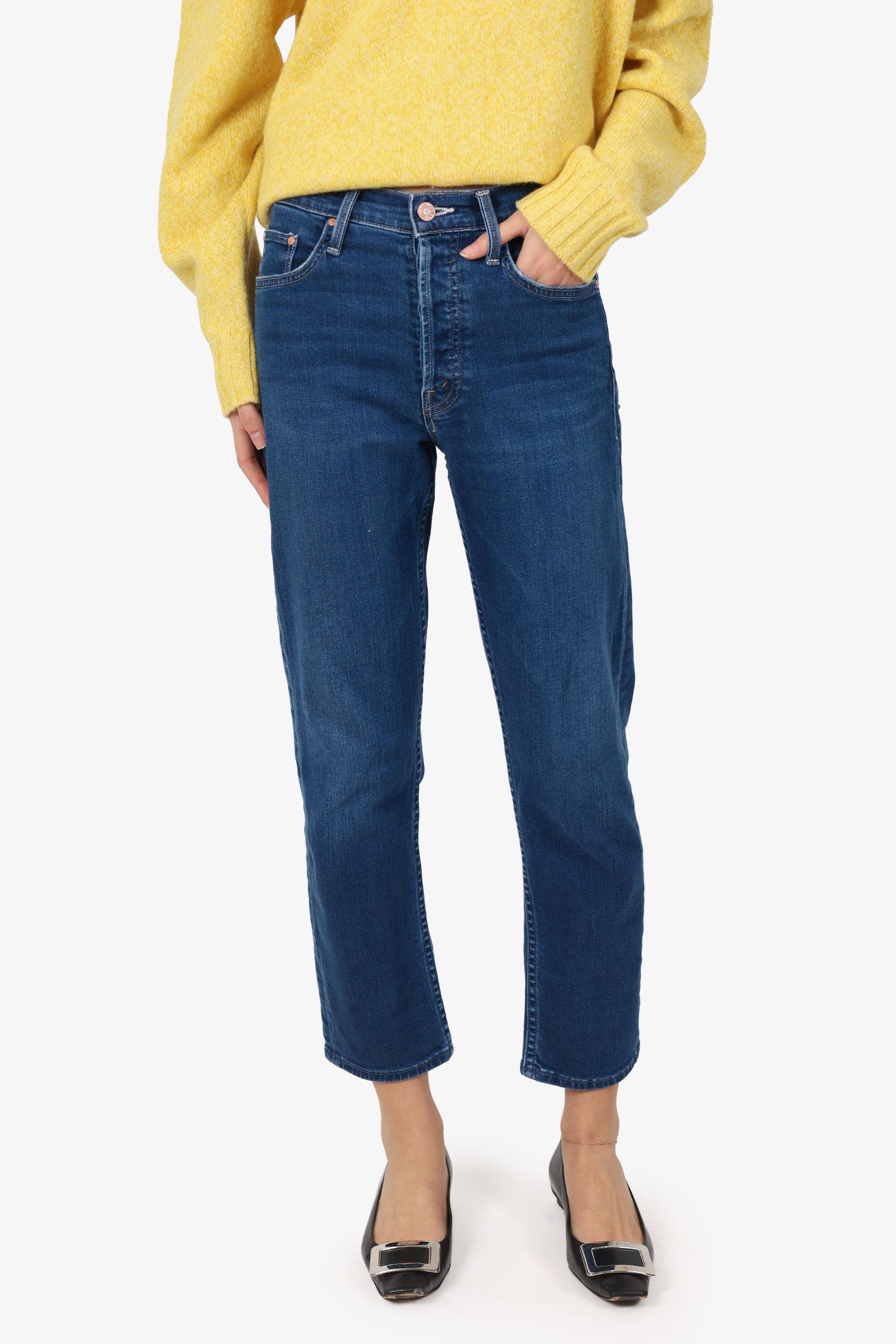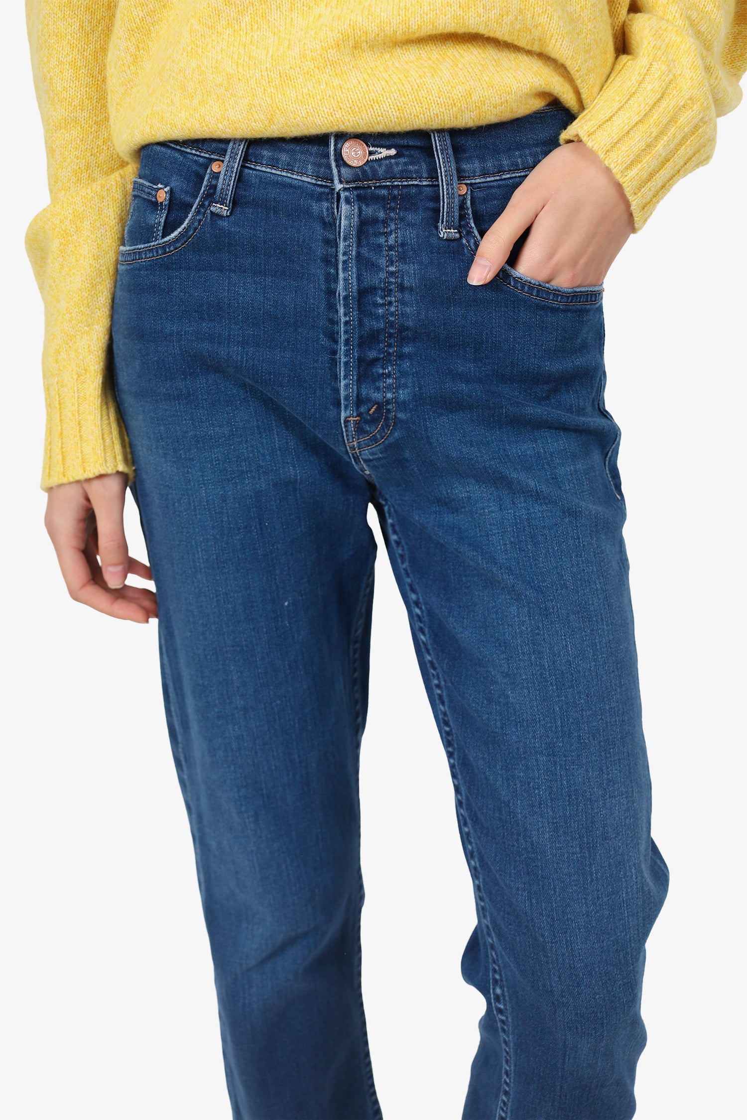 Refresh availabilityMother Blue Slim Leg Jeans. Slip on. Front button-up closure. Waistband belt-loops. 5 exterior pockets; 2 front slip, 1 mini compartment, and 2 rear slip. Rose gold-tone hardware. Contrast stitching.