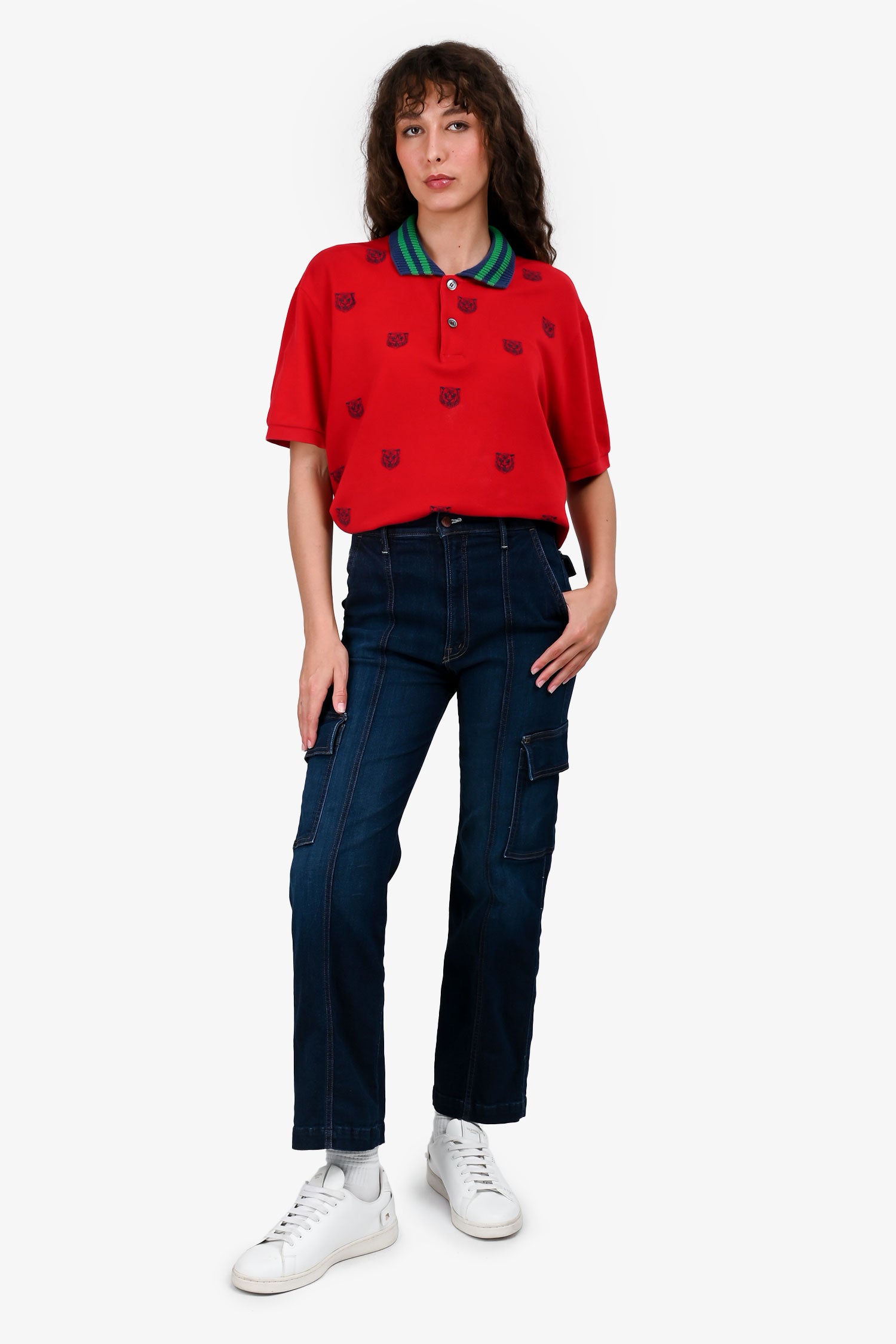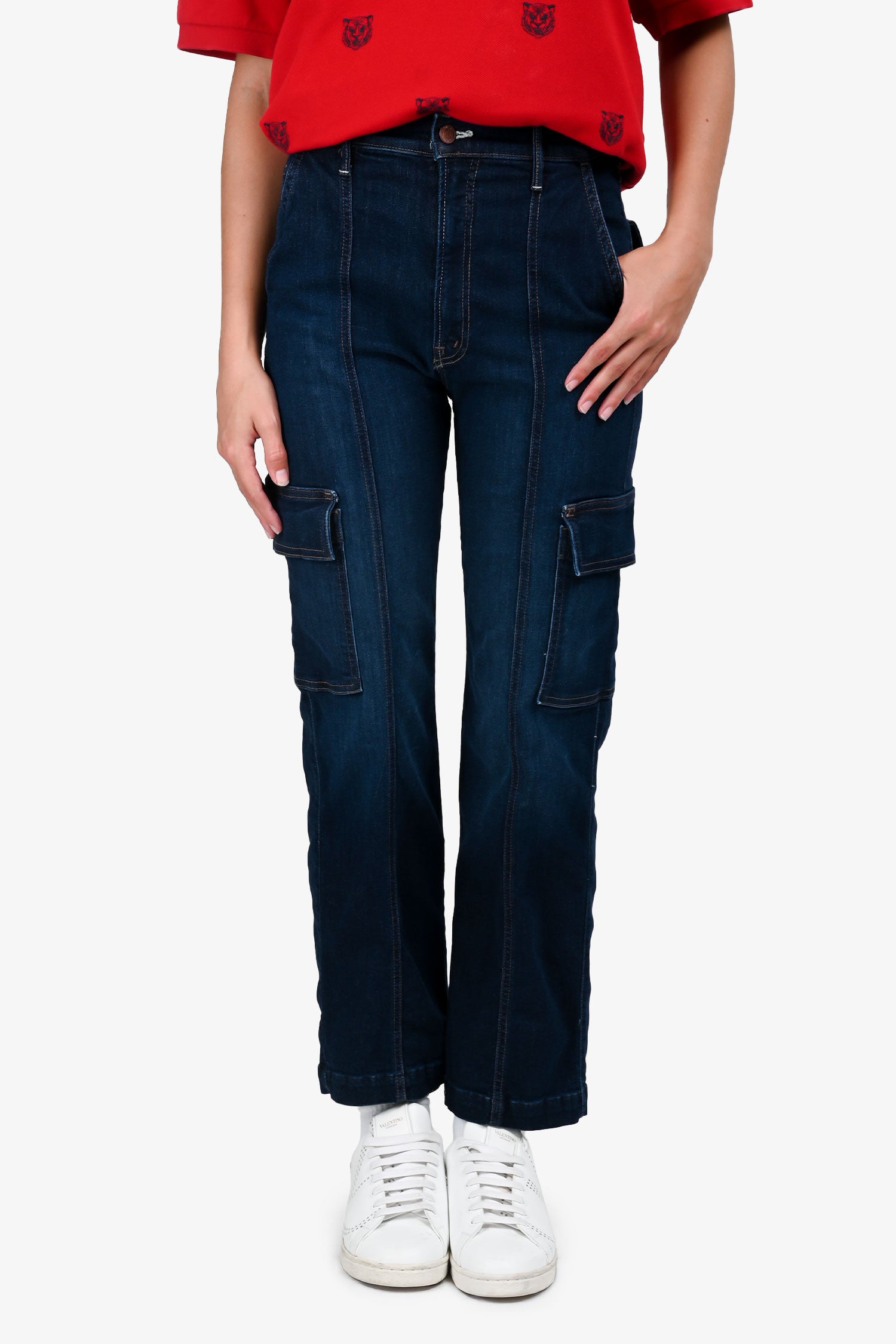 Refresh availabilityMOTHER Dark Wash Cargo Jeans. Cargo pockets at thighs. Side and back pockets. Zip fly with button closure. Belt loops. Contrast stitching.
