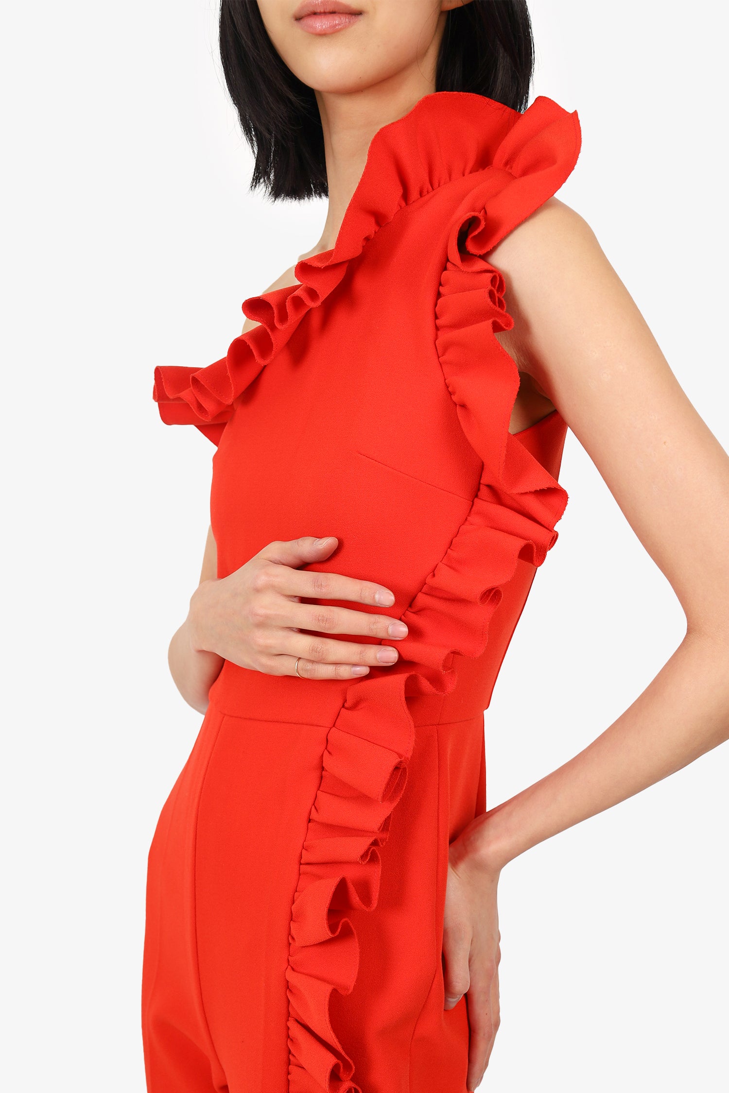 Refresh availabilityMSGM Red Ruffle Detail One-Shoulder Jumpsuit. Side zip closure. Lined. Tonal stitching