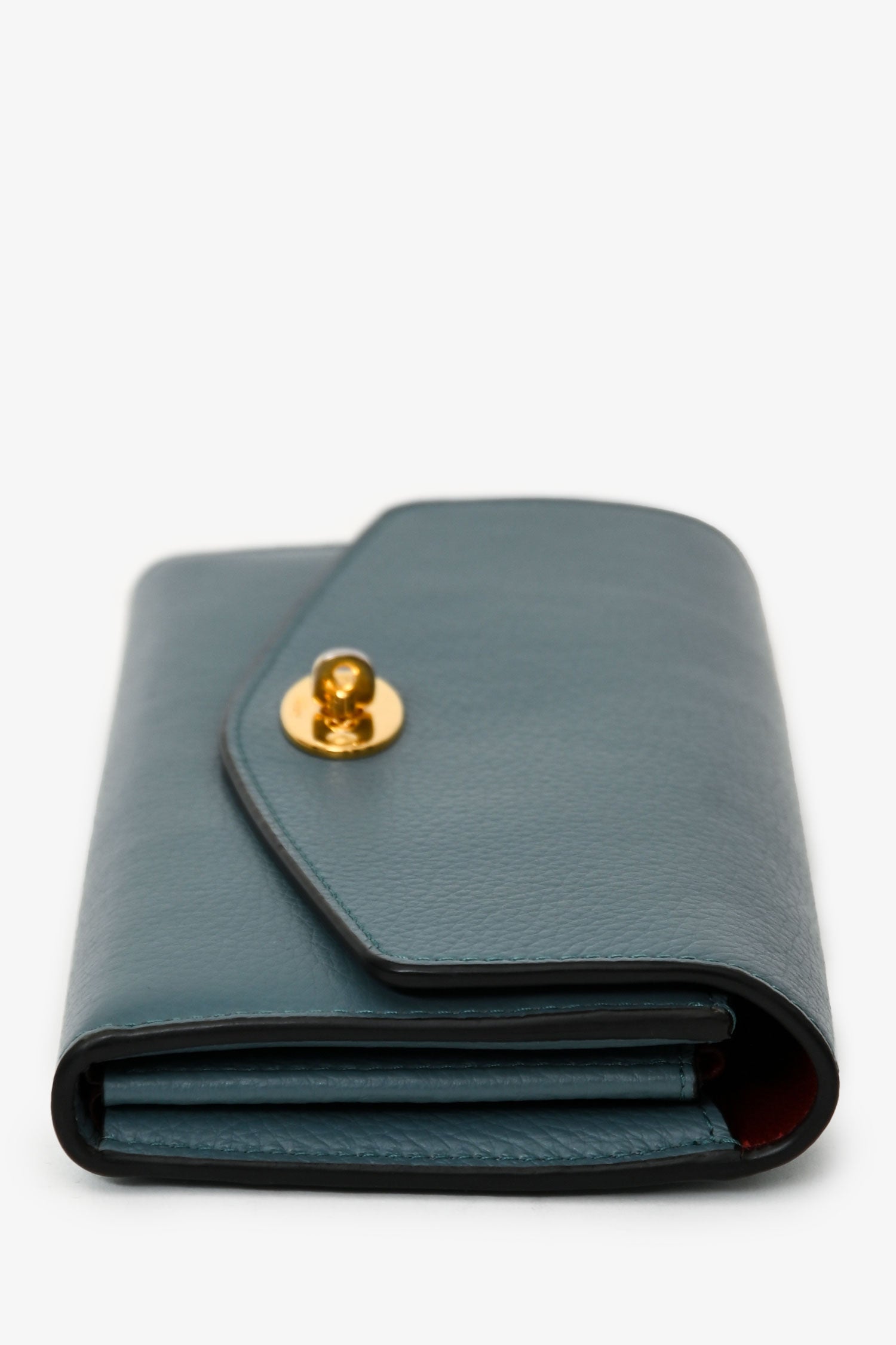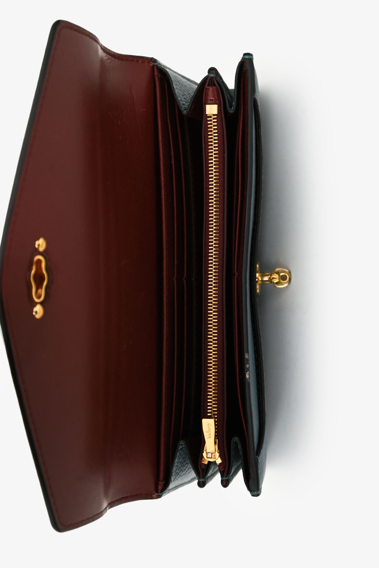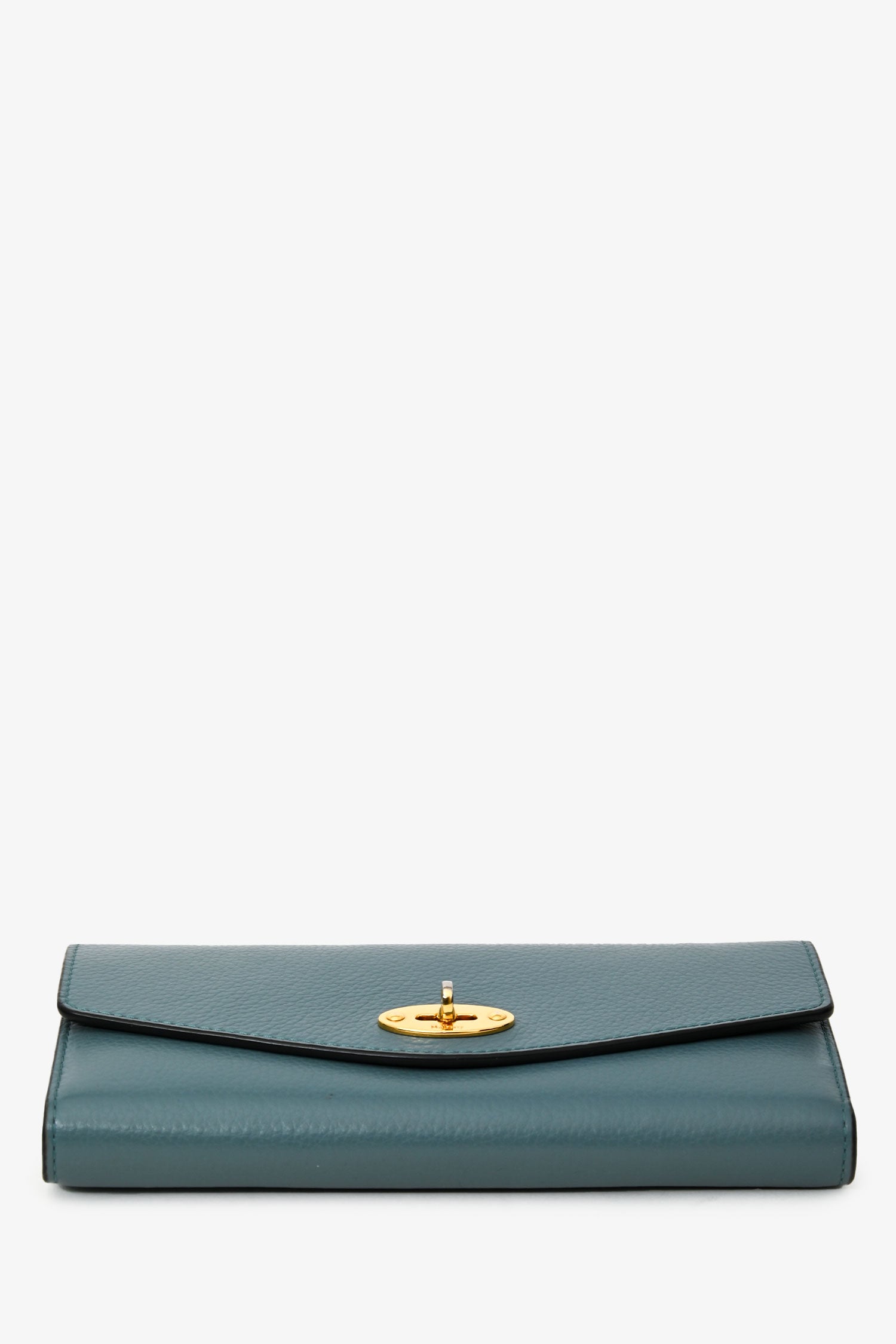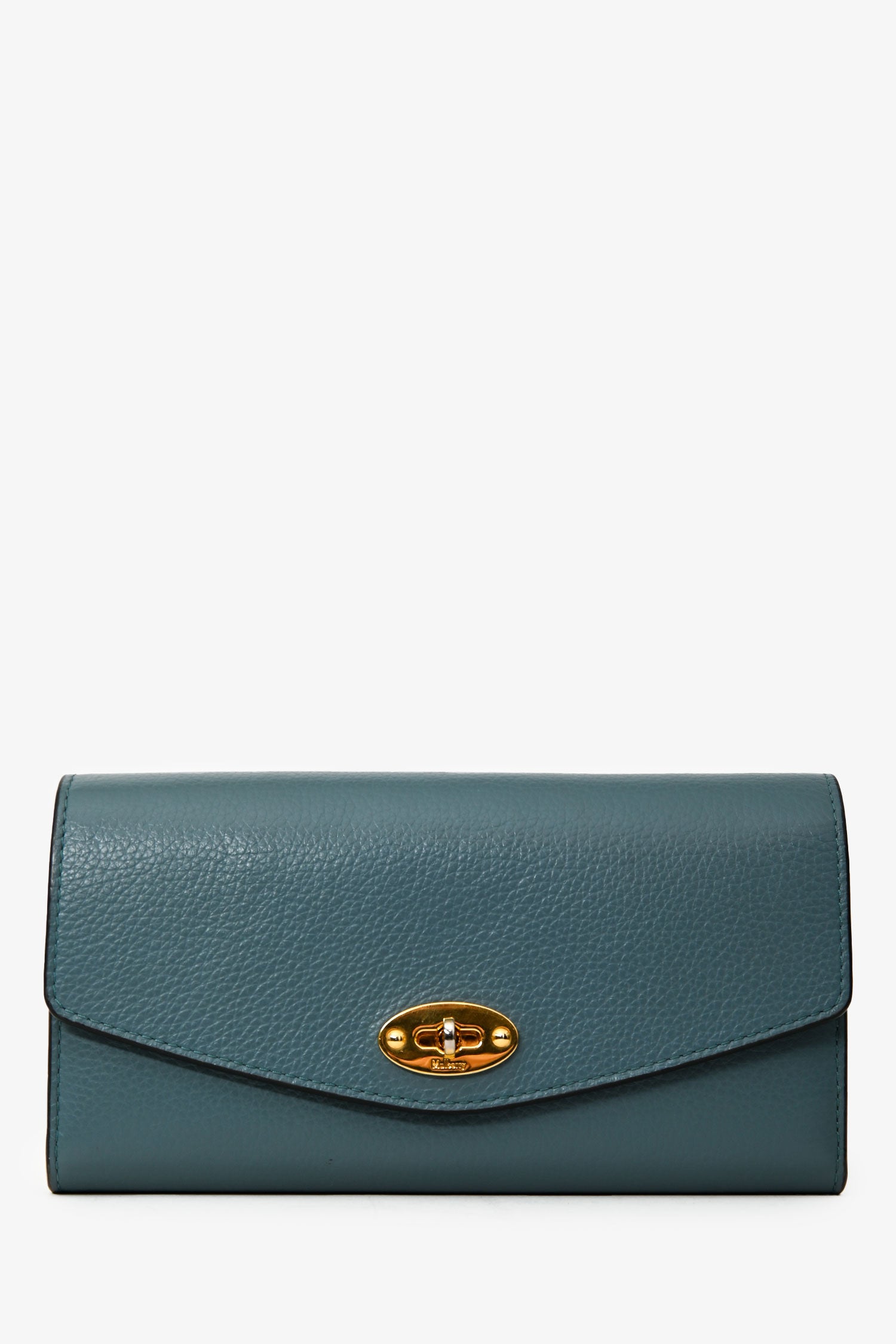 Refresh availabilityMulberry Blue Leather Wallet. Fold-over flap with a twist lock closure. 2 exterior compartments; one in the front, one in the rear. 2 interior compartments. Single bill slot. Single pocket with zip closure. 12 card slots. Gold-tone hardware. Tonal stitching.