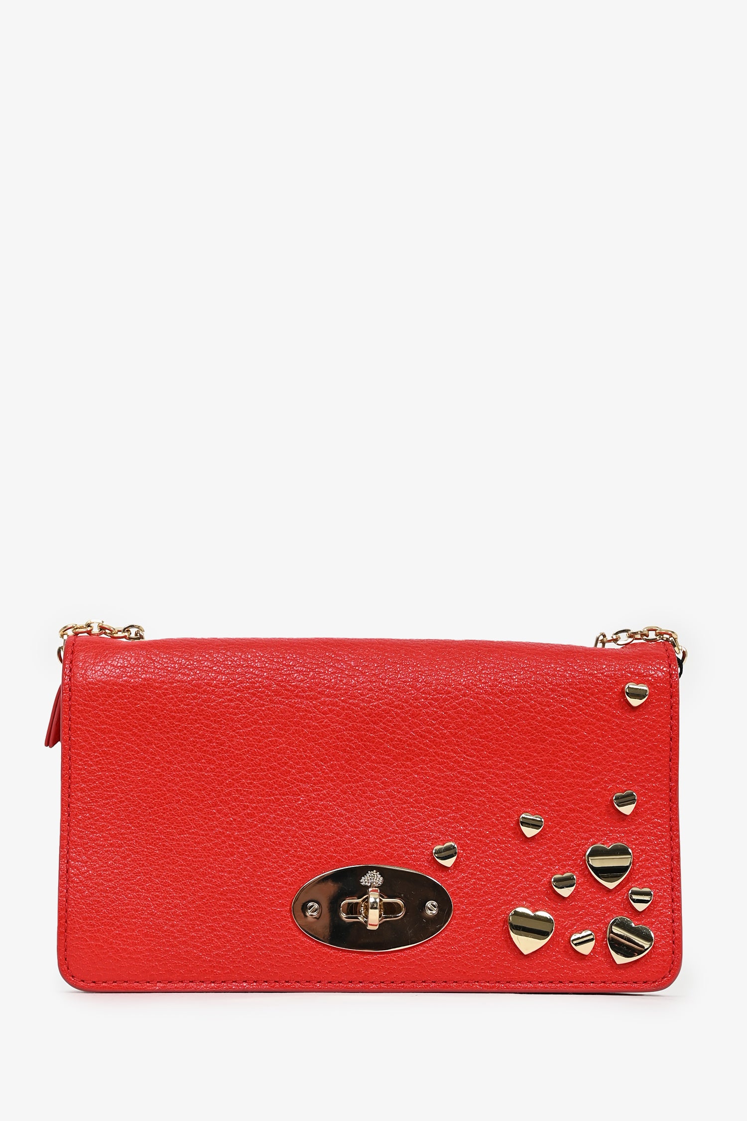 Refresh availabilityMulberry Red Grained Leather Gold Heart Embellished 'Bayswater' Wallet on Chain. Front turn-lock closure. Rear slip pocket. An open compartment: 4 card slots and a billfold compartment. Front slip and wall pocket with zipper closure. Detachable chain strap. gold heart hardware details throughout item. Gold-tone hardware. Tonal stitching.