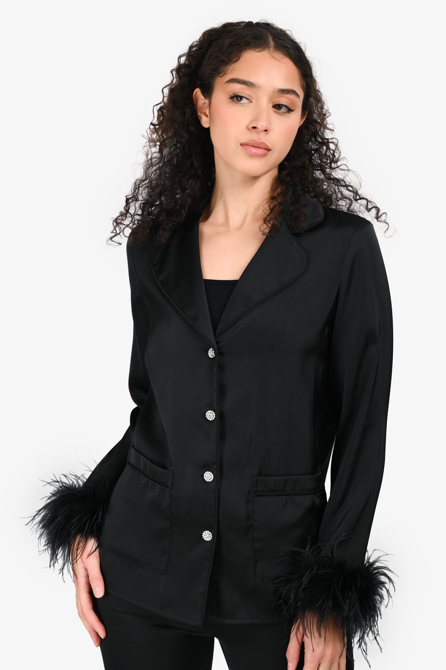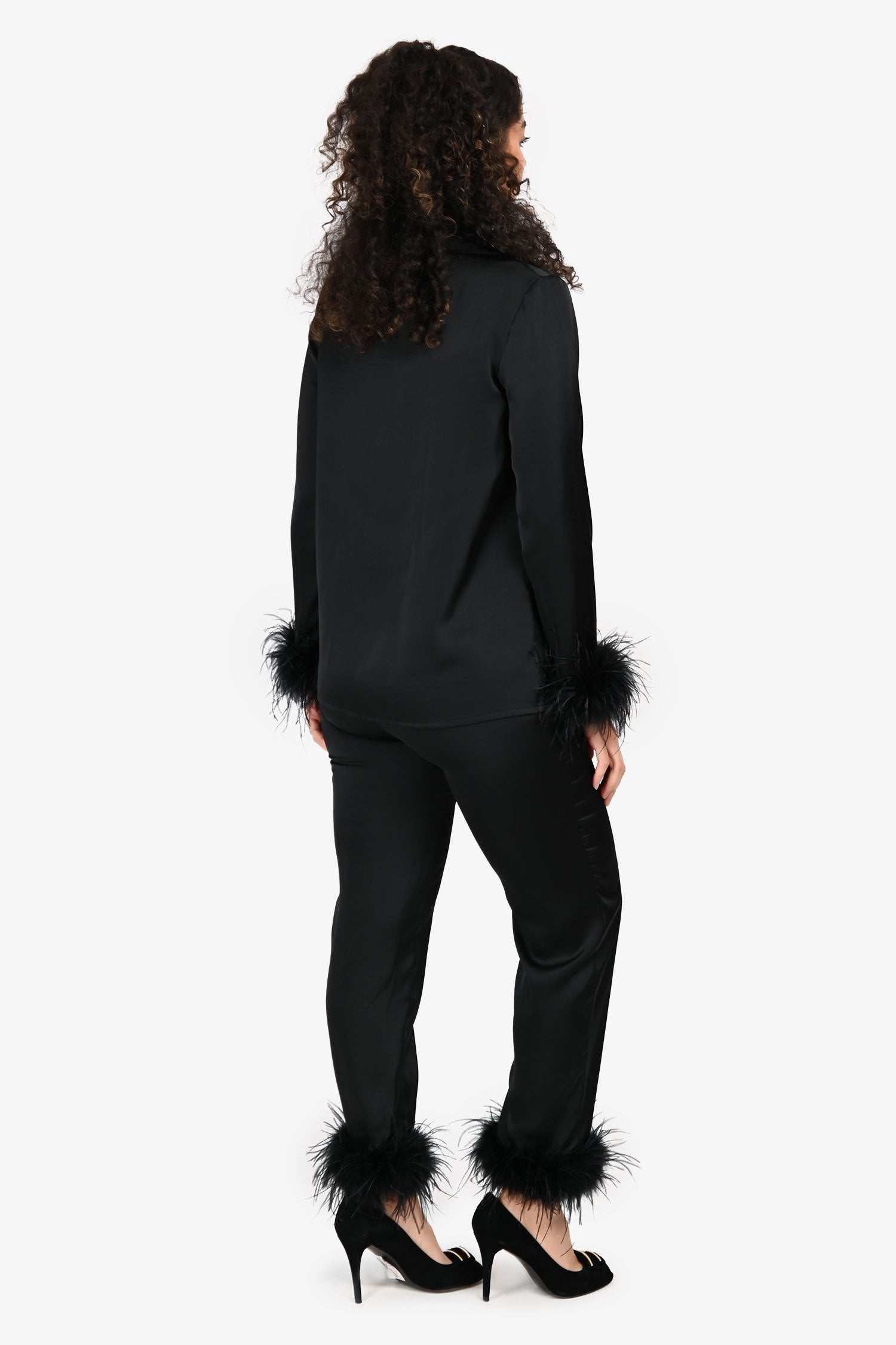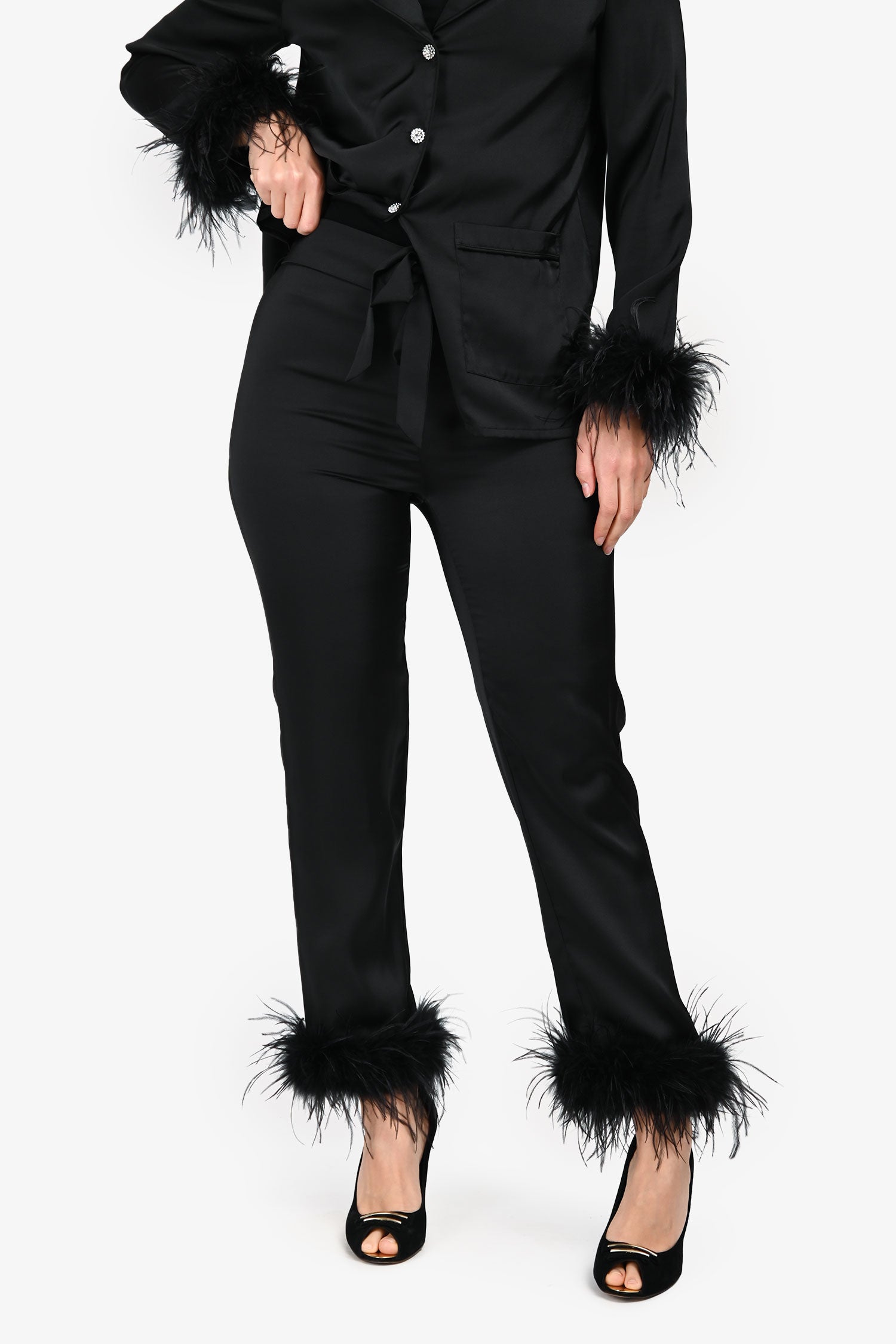 Refresh availabilityNadine Merabi Black Silk Feather Trim Blazer & Pant Set. Blazer: Slip-on. V-neckline. Front button-up closure. 2 front slip pockets. Pant: Pull-on. Elasticized waistband with tie-up closure. Tonal stitching.