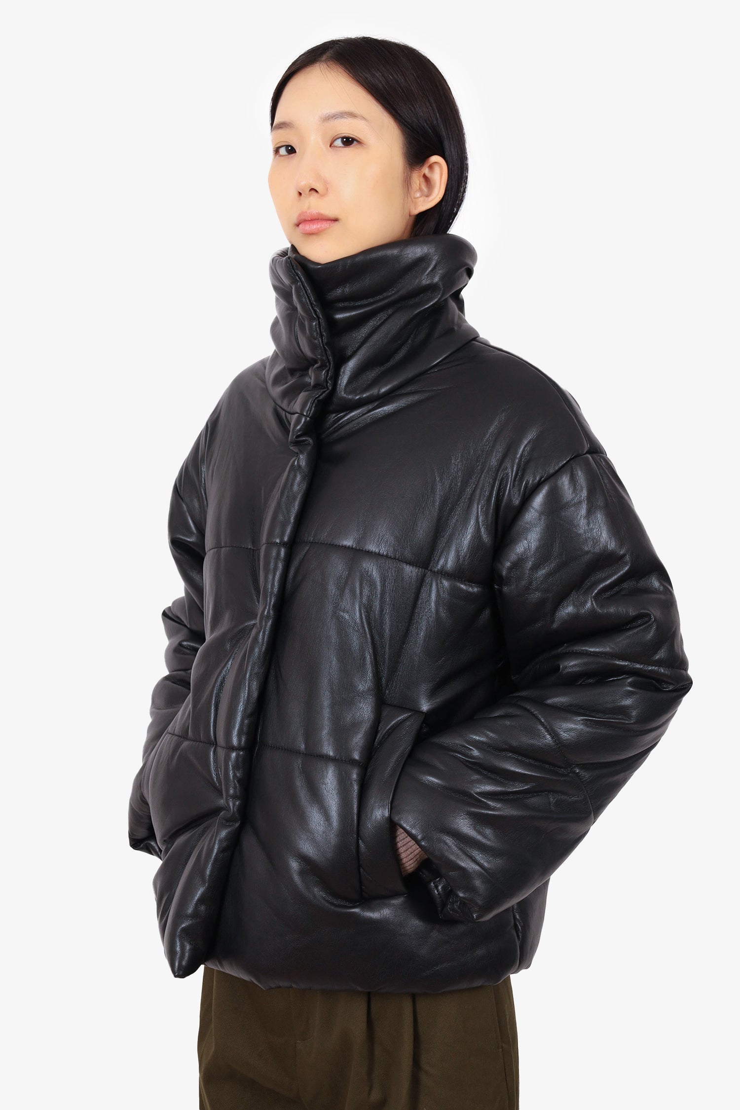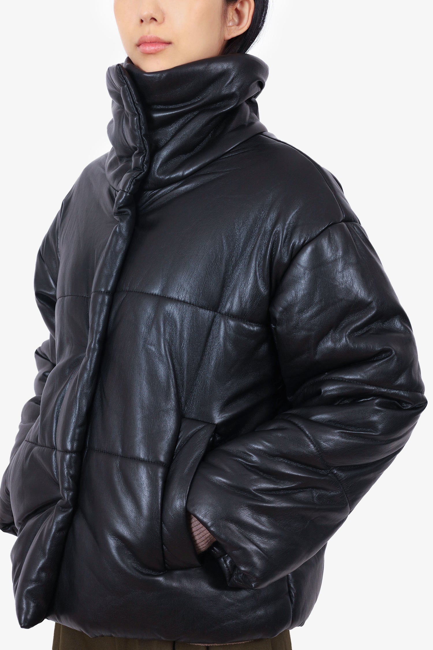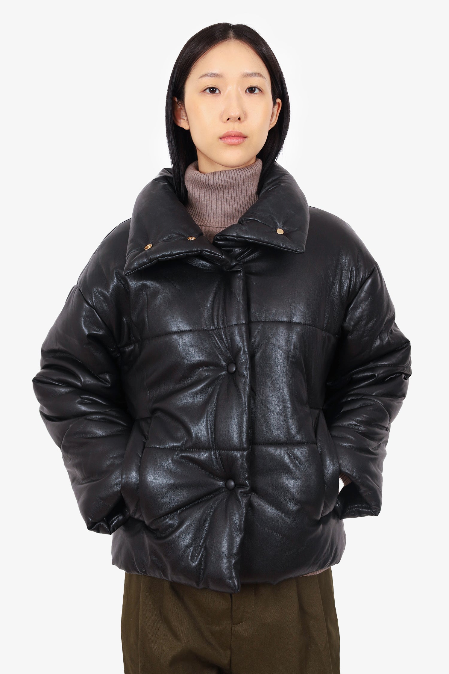 Refresh availabilityNanushka Black Faux Leather Puffer Jacket. Pull-on. High neckline. Front button-up closure. 2 front slip pockets. Partially lined. Gold-tone hardware. Tonal stitching.