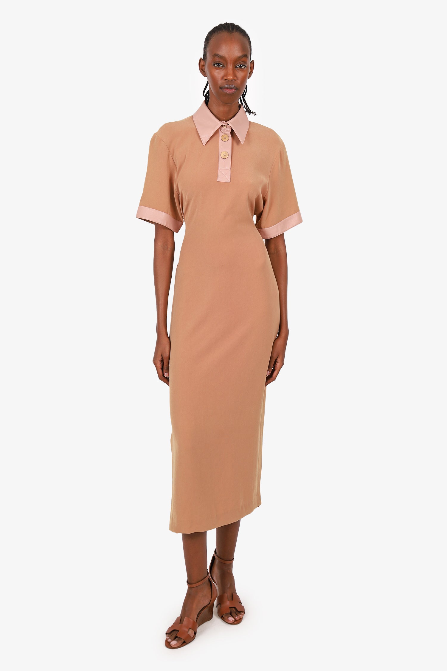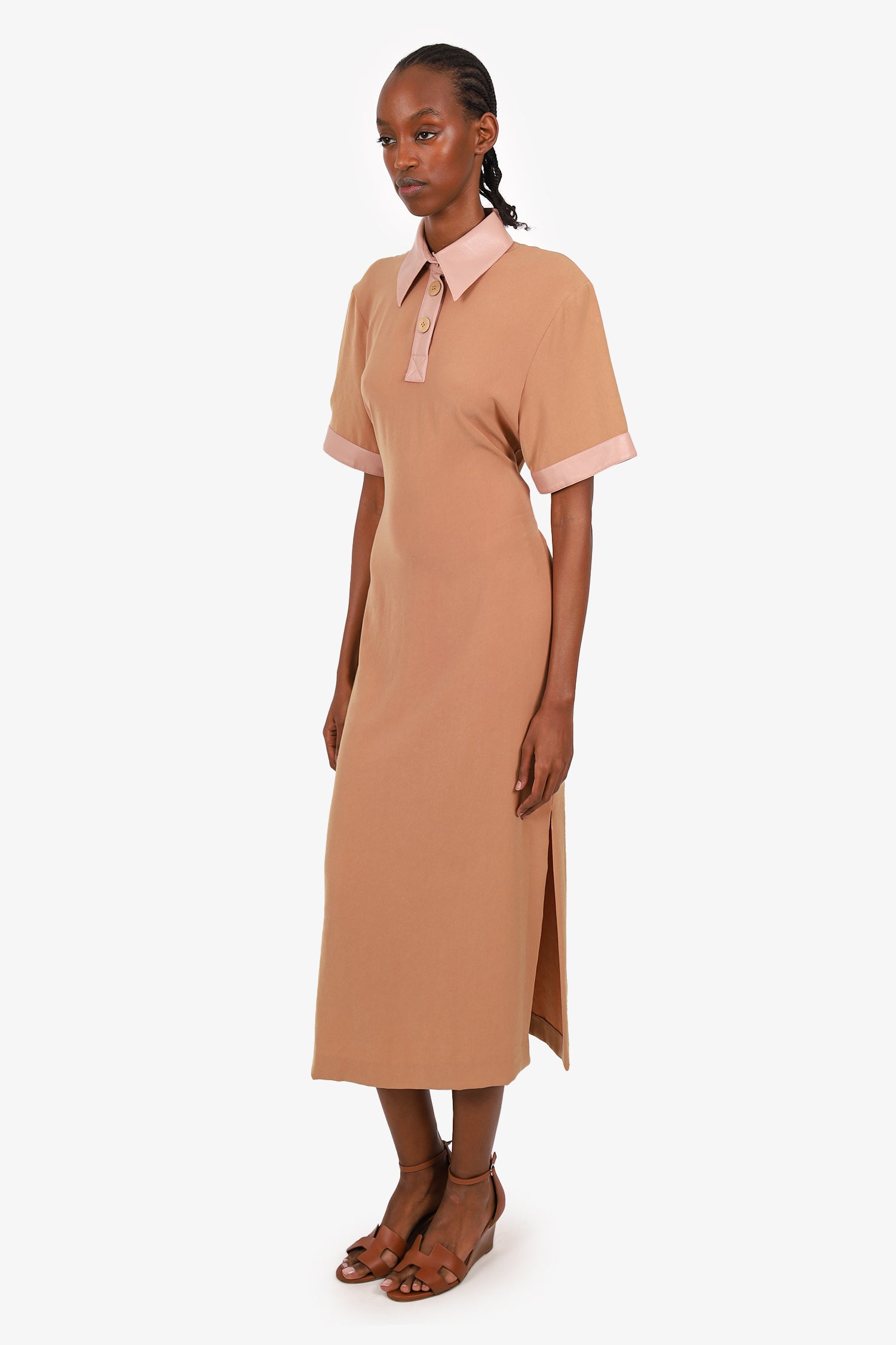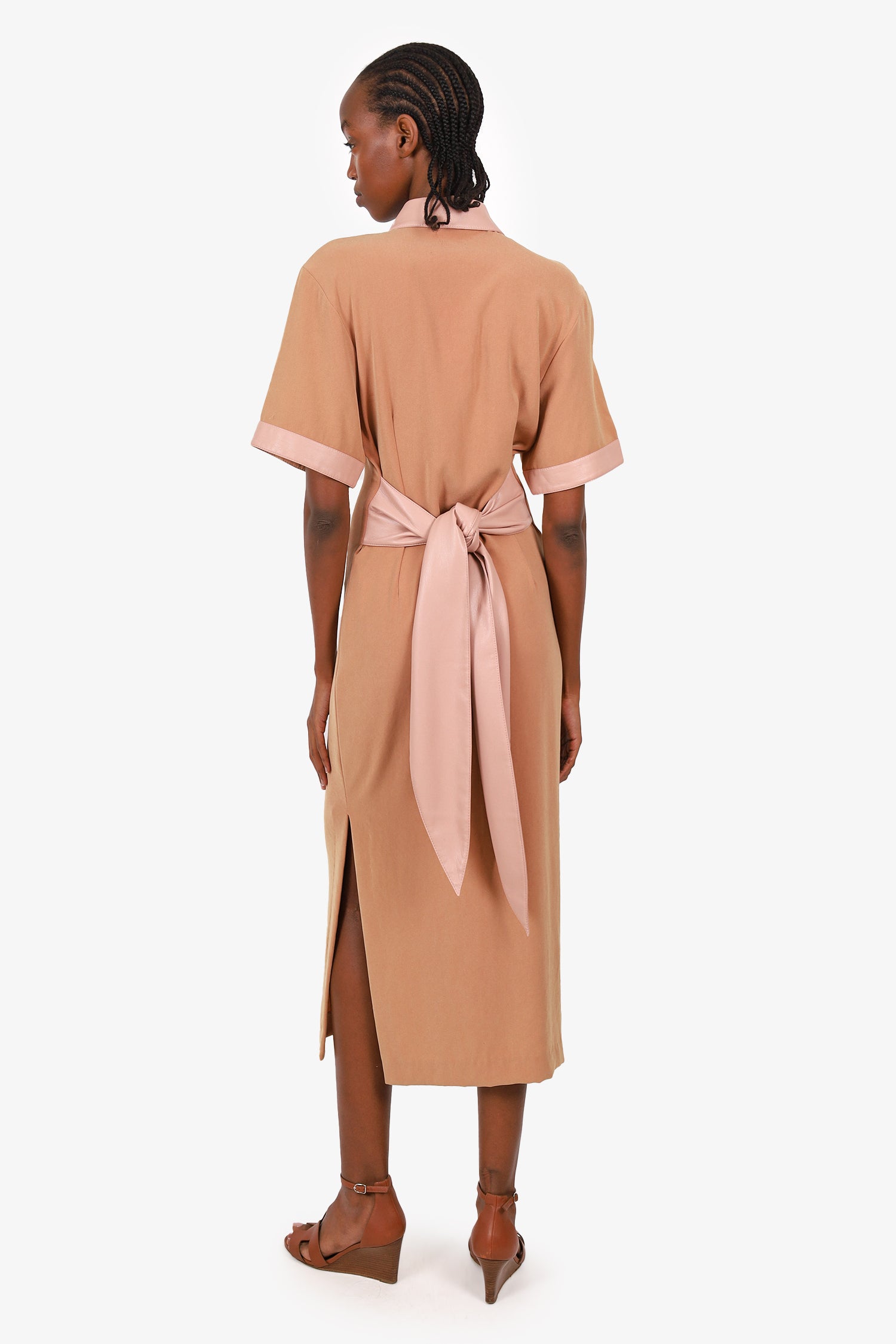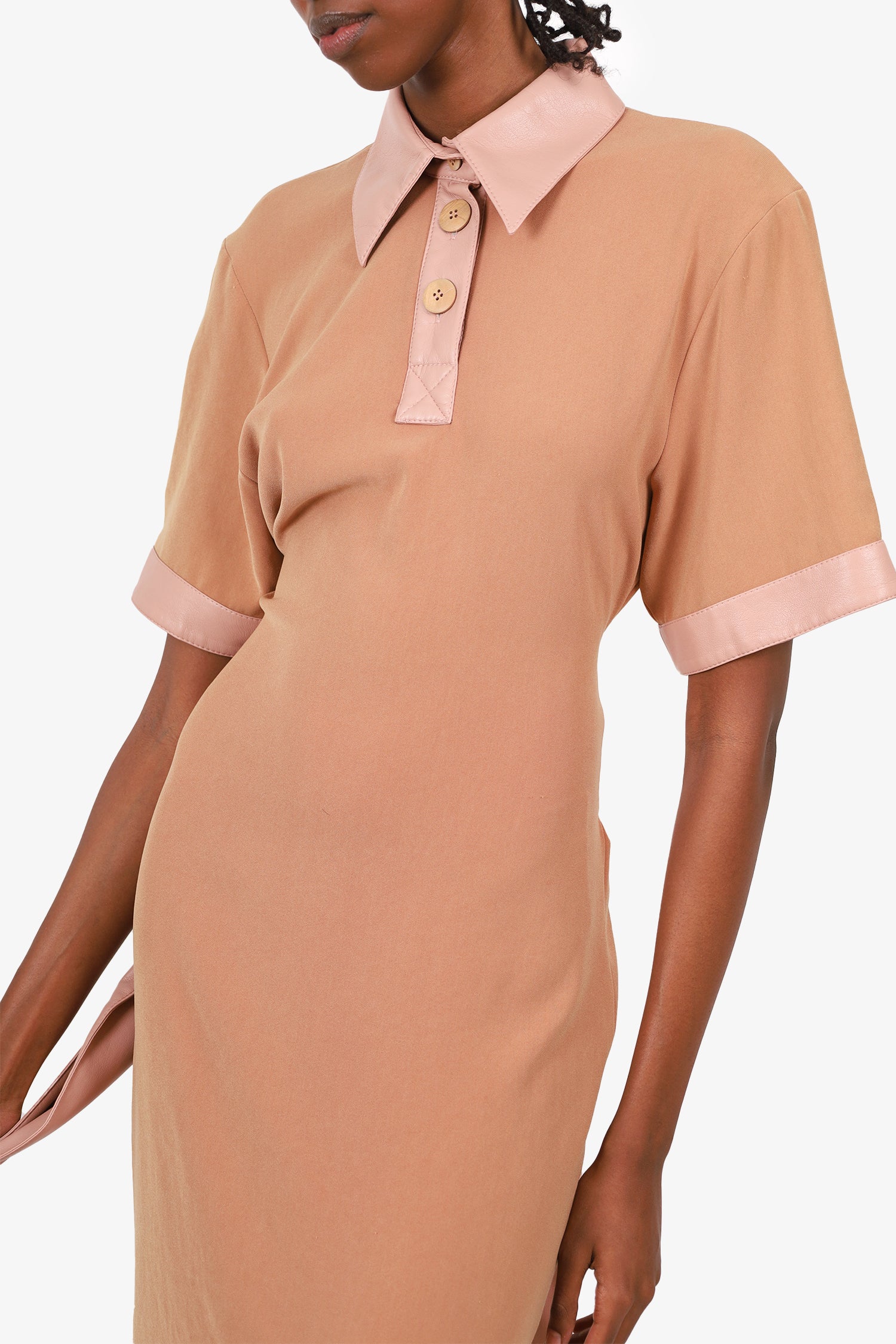 Refresh availabilityNanushka Brown/Pink Faux Leather Detail Belted Dress. Leather collared neckline. Front button-up closure. Leather sleeve cuffs and attached belt with tie-up closure. Tonal stitching.