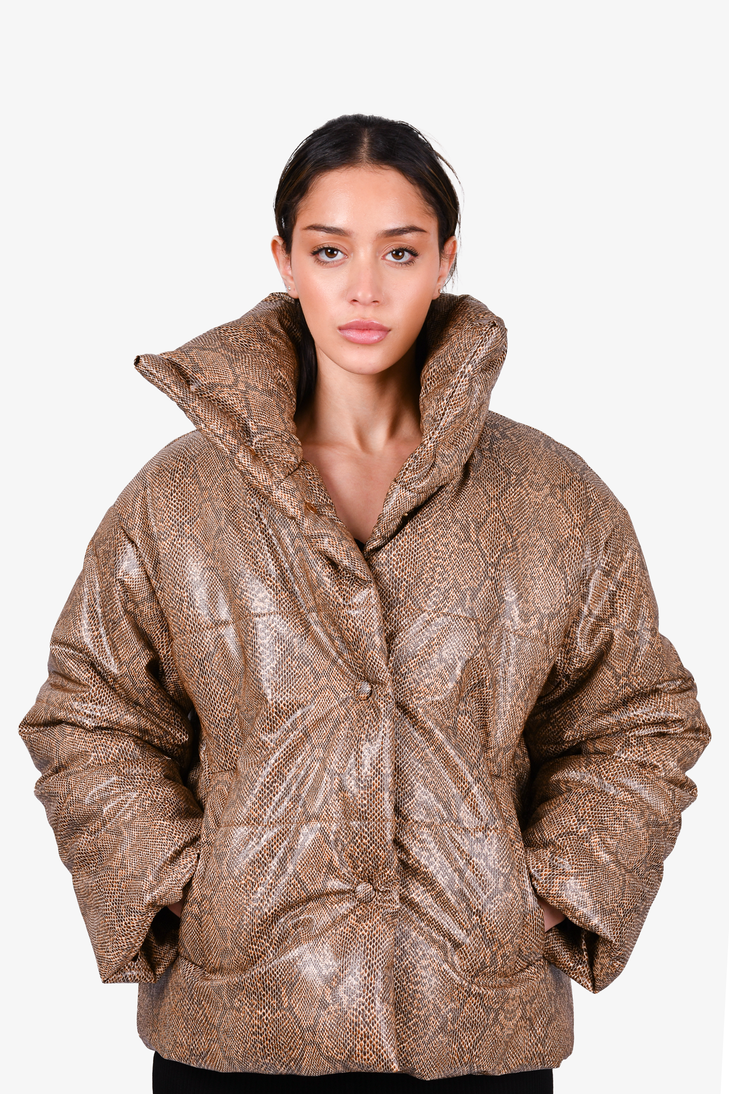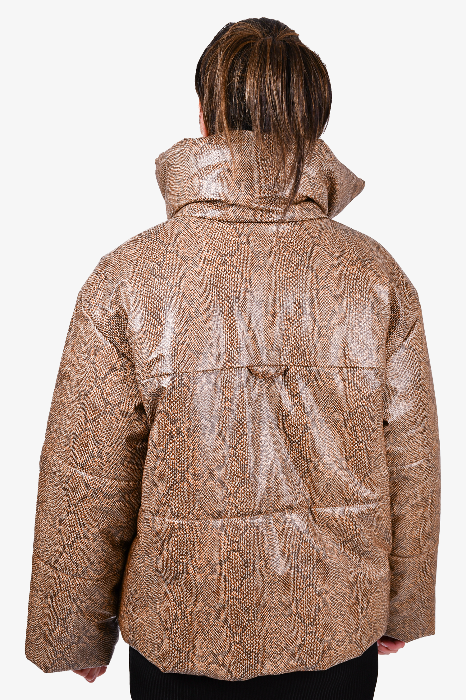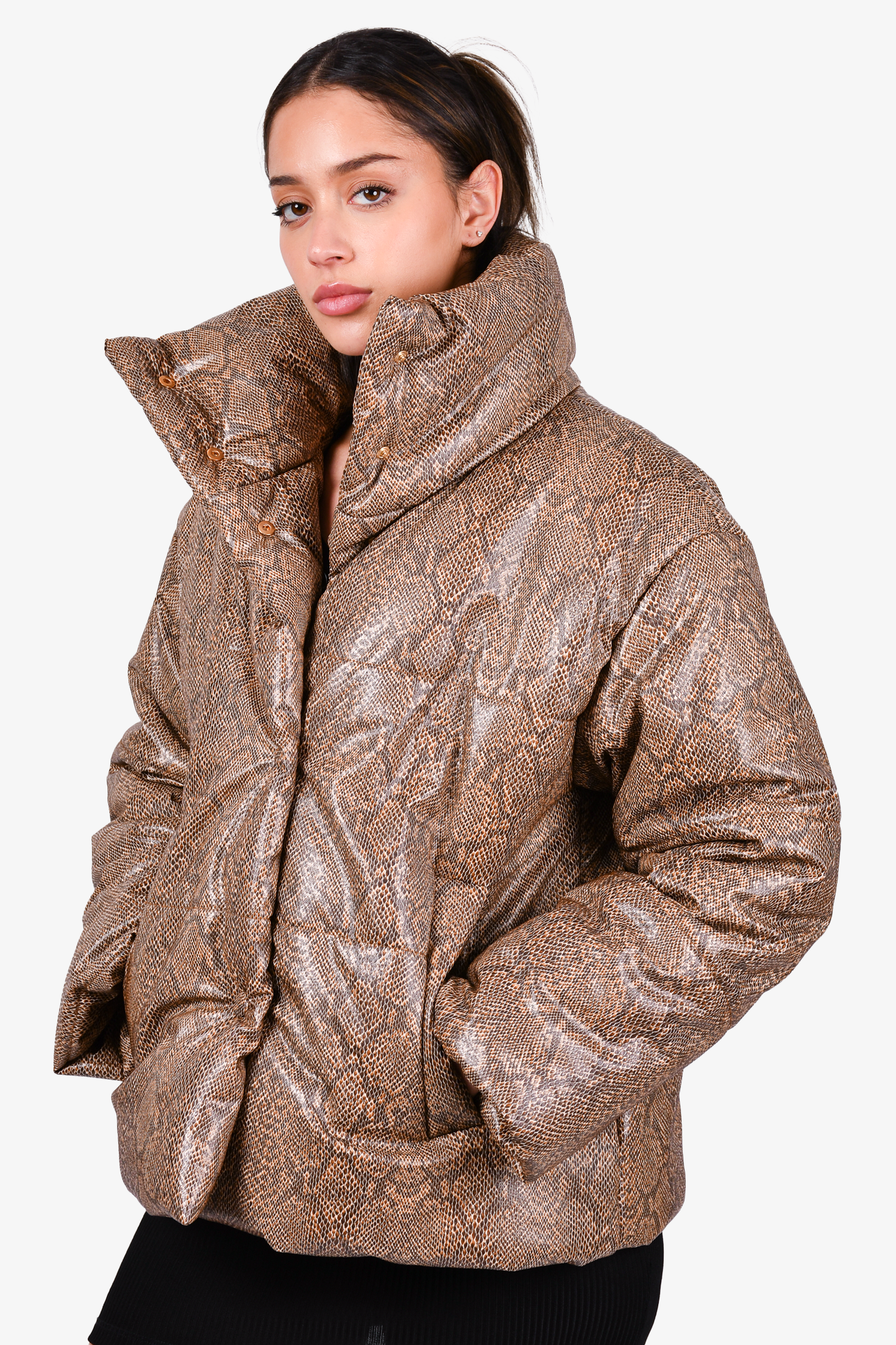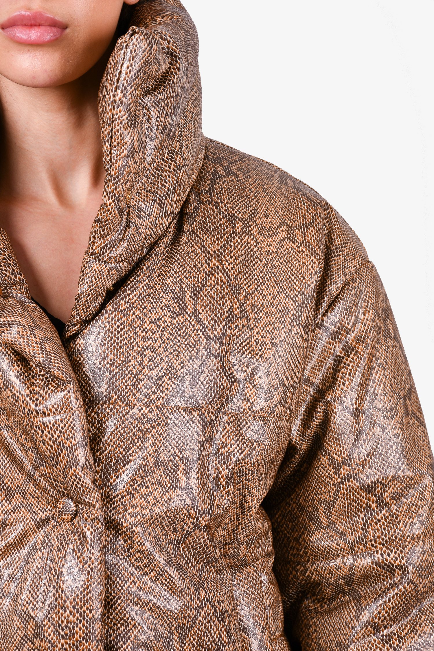Refresh availabilityNanushka Brown Snake Printed Faux Leather Puffer Jacket. Front snap button closures. 2 hand pockets. Beige lining. Tonal stitching.