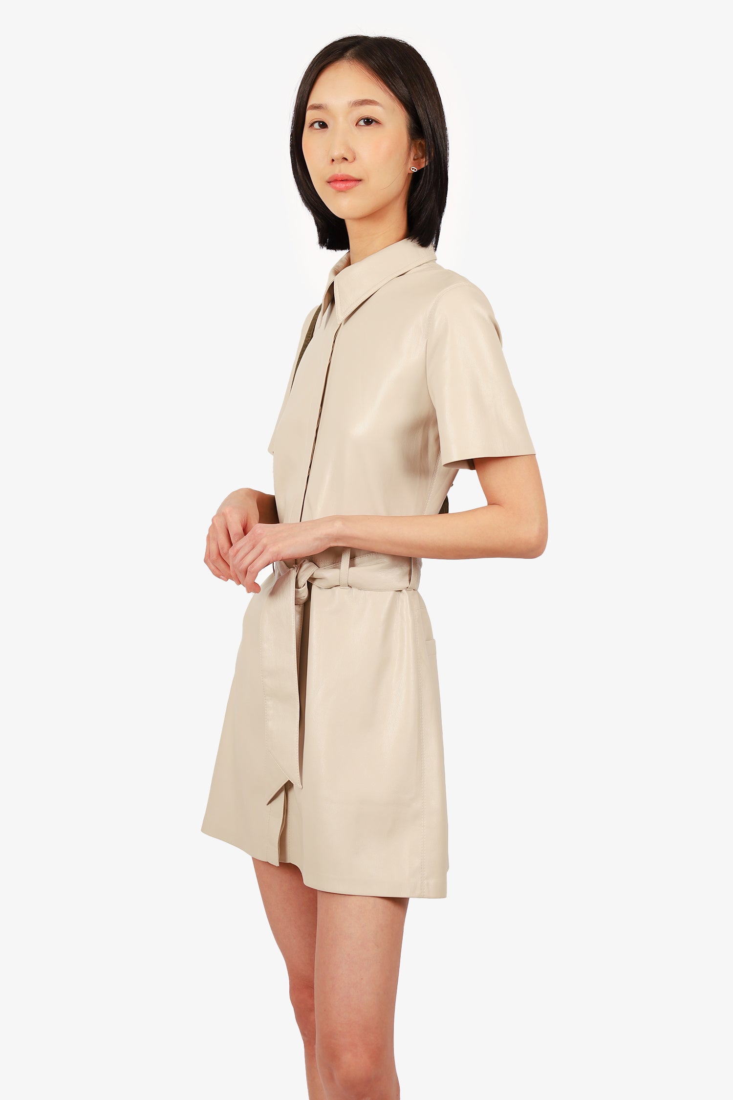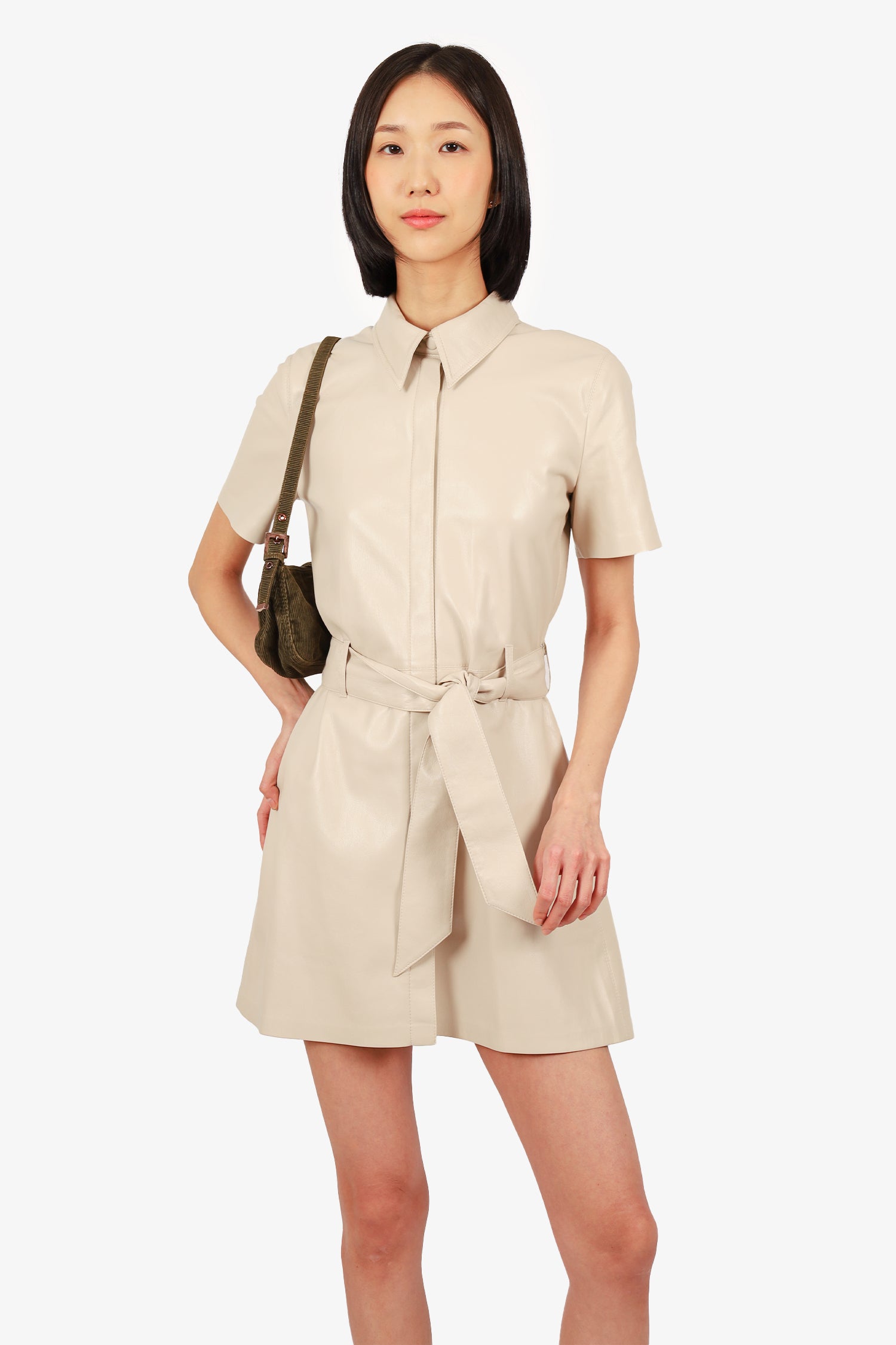 Refresh availabilityNanushka Cream Faux Leather Button Down Dress. Front button closure. Waist belt detail. Tonal stitching.